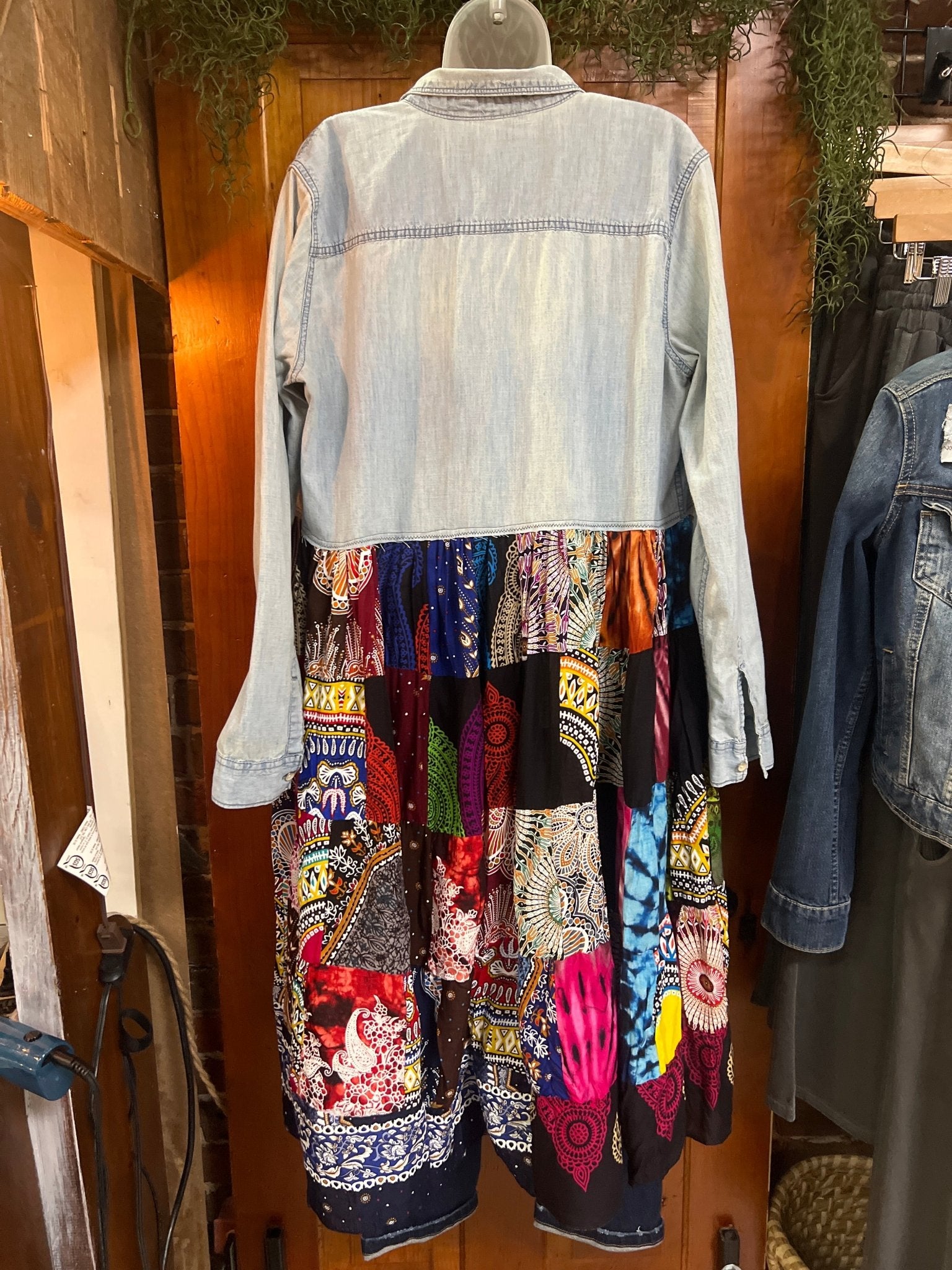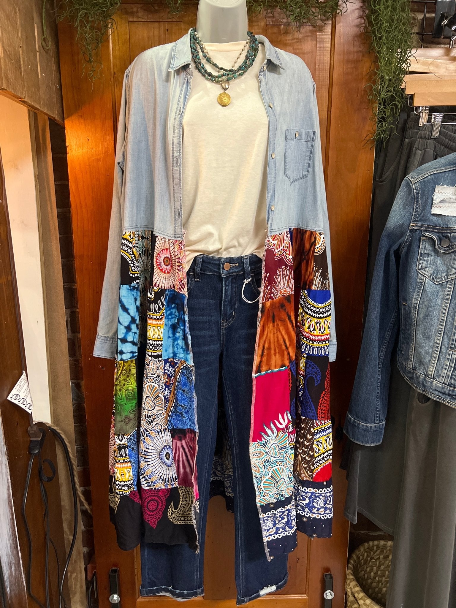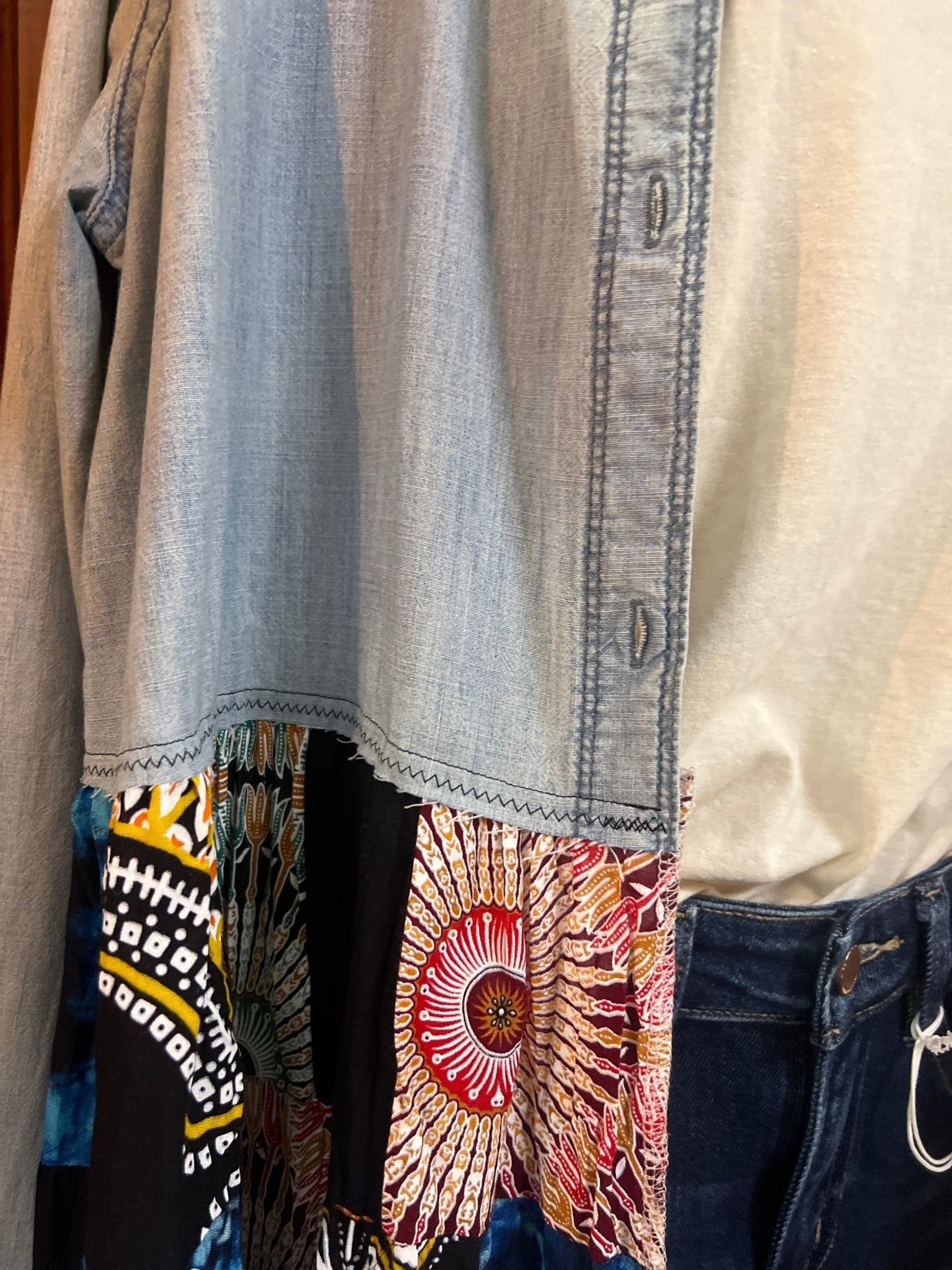 This item began as a GAP BRAND lightweight chambray denim shirt (size large) and we added lots of fabulous rayon patchwork to the bottom... Here are the measurements: