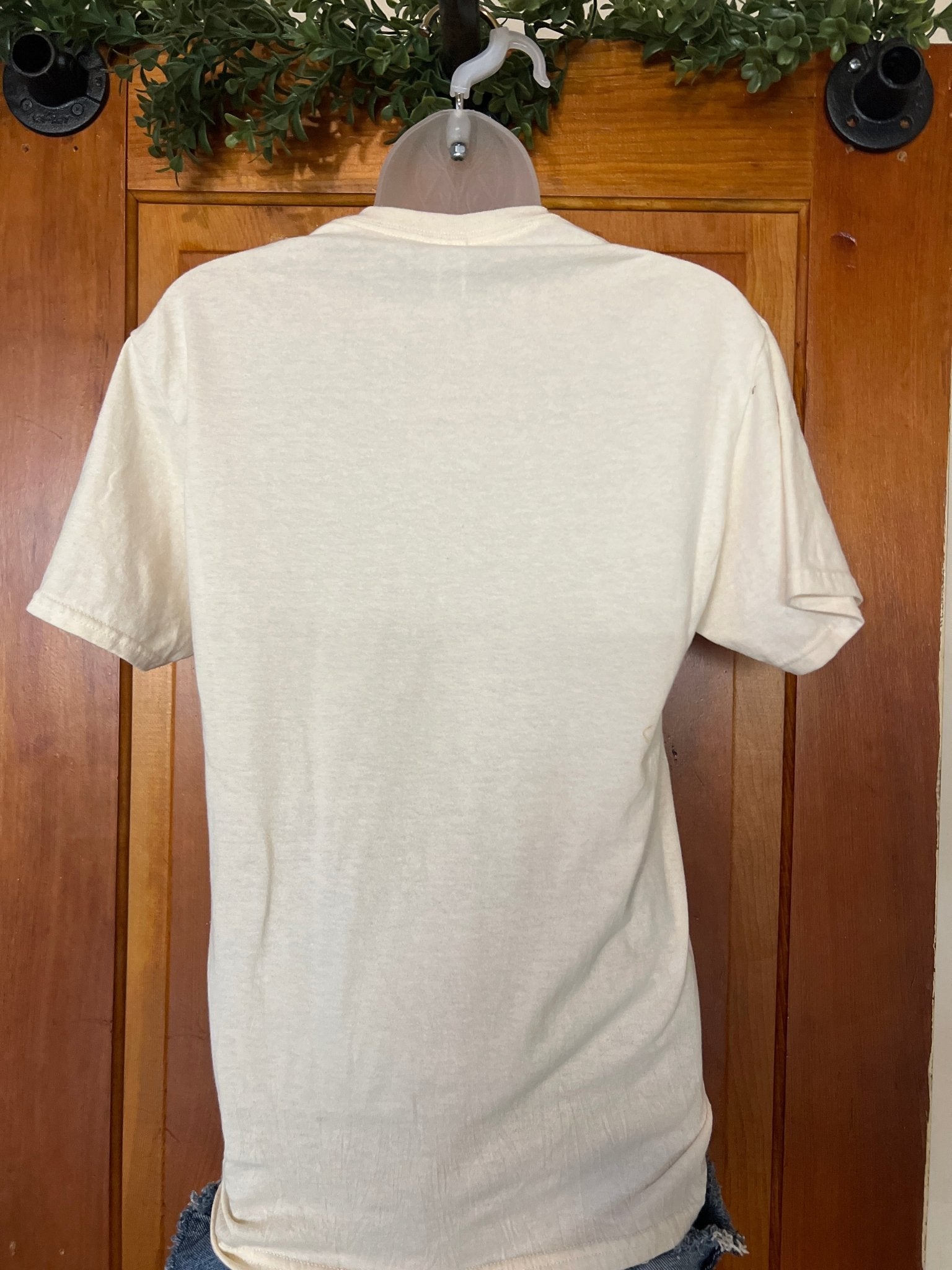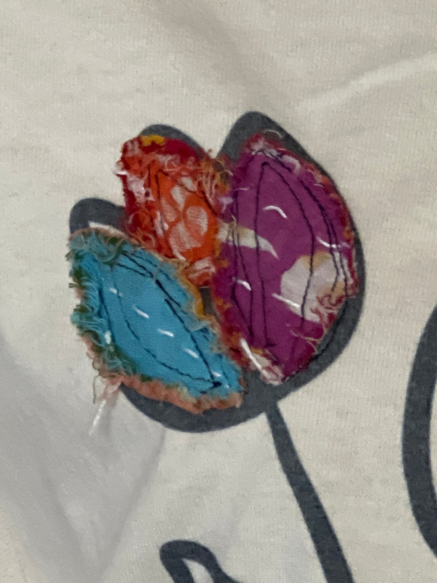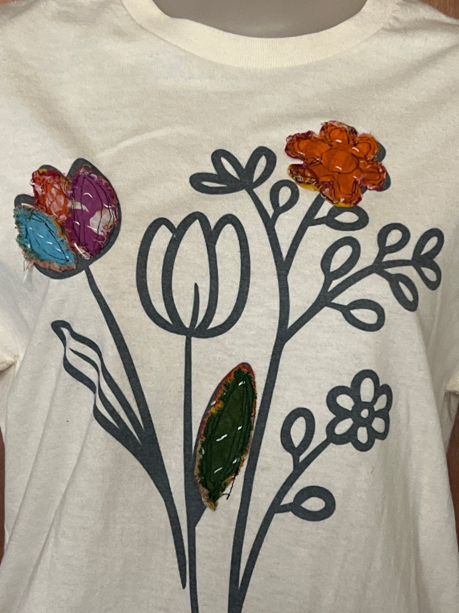 Beautiful sublimated image on a 50 poly/ 50 cotton off-white/cream-colored tee with kantha accents!!!