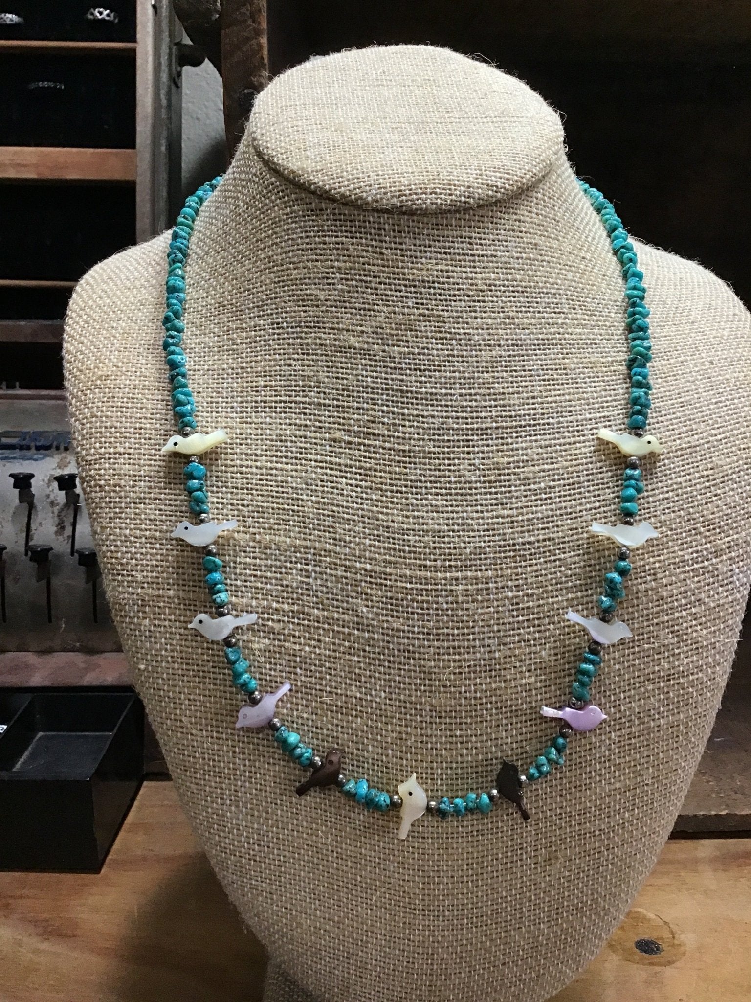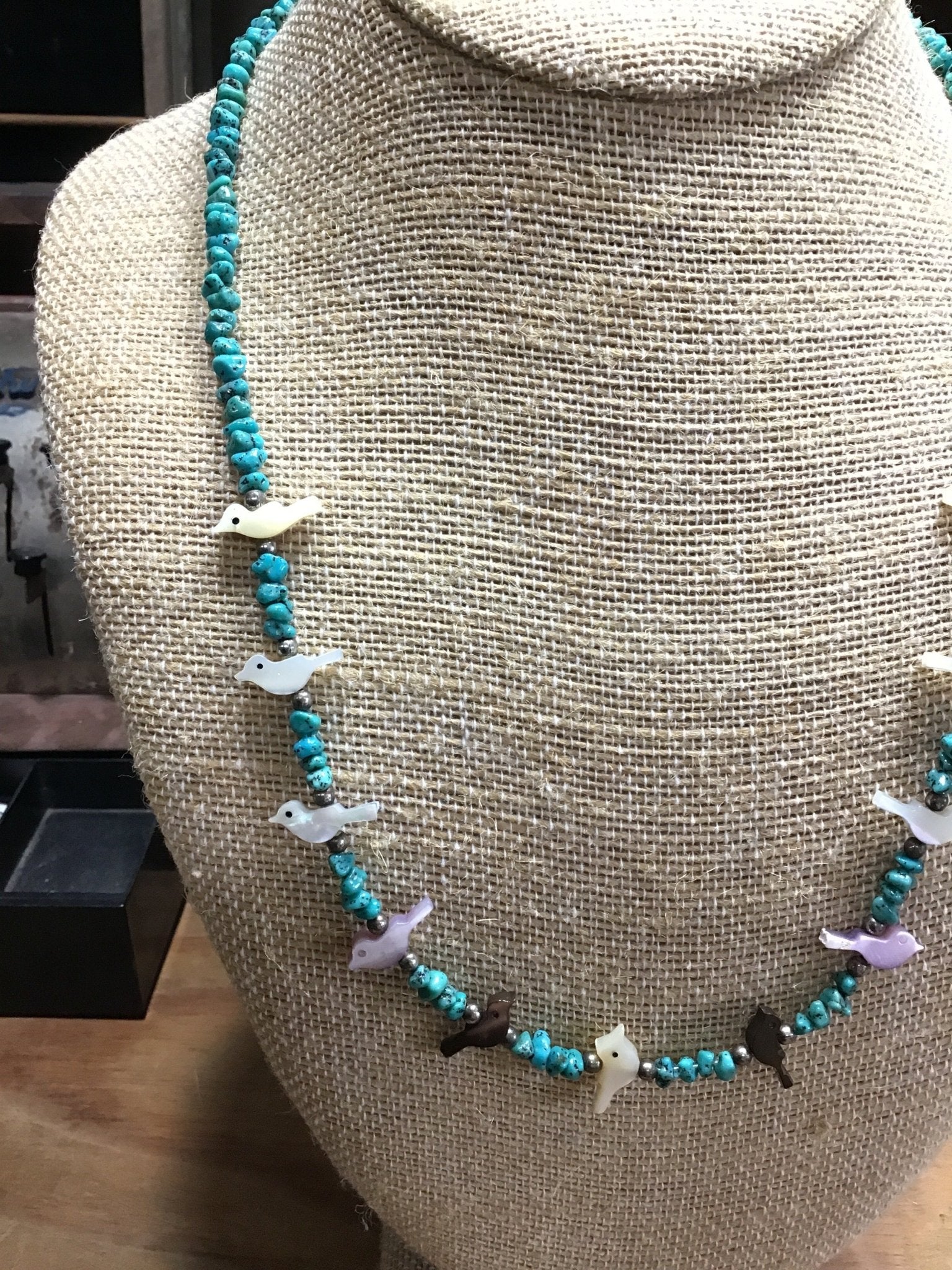 Celebrate the artistry of the Zuni people with this vintage handcrafted fetish necklace, featuring beautifully carved bird fetishes strung between turquoise heishi beads. Each bird is carved from natural shell and mother-of-pearl in soft shades of cream, pink, and iridescent gray, symbolized harmony, freedom, and protection.