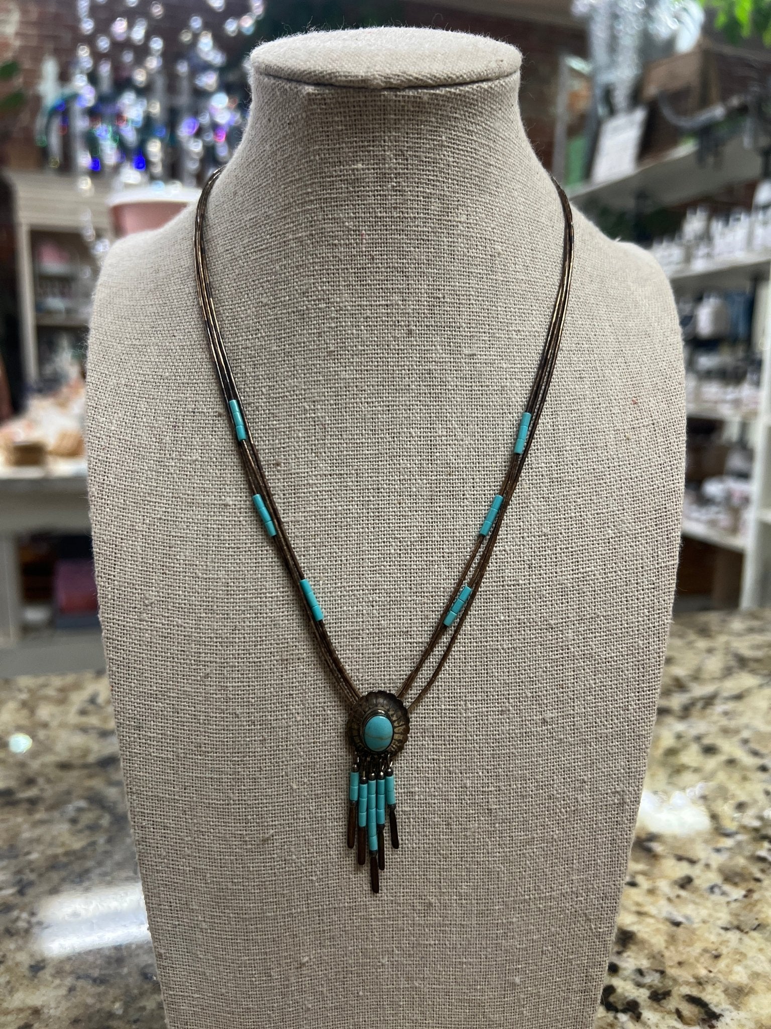 This handcrafted necklace features a double strand design with tubular turquoise beads and oxidized sterling silver spacers. At the center sits a scalloped sterling silver concho with a bezel-set turquoise cabochon, framed by detailed stamping. Dangling from the pendant are turquoise heishi beads and elongated silver drops, giving the piece a distinctive Southwestern flair.