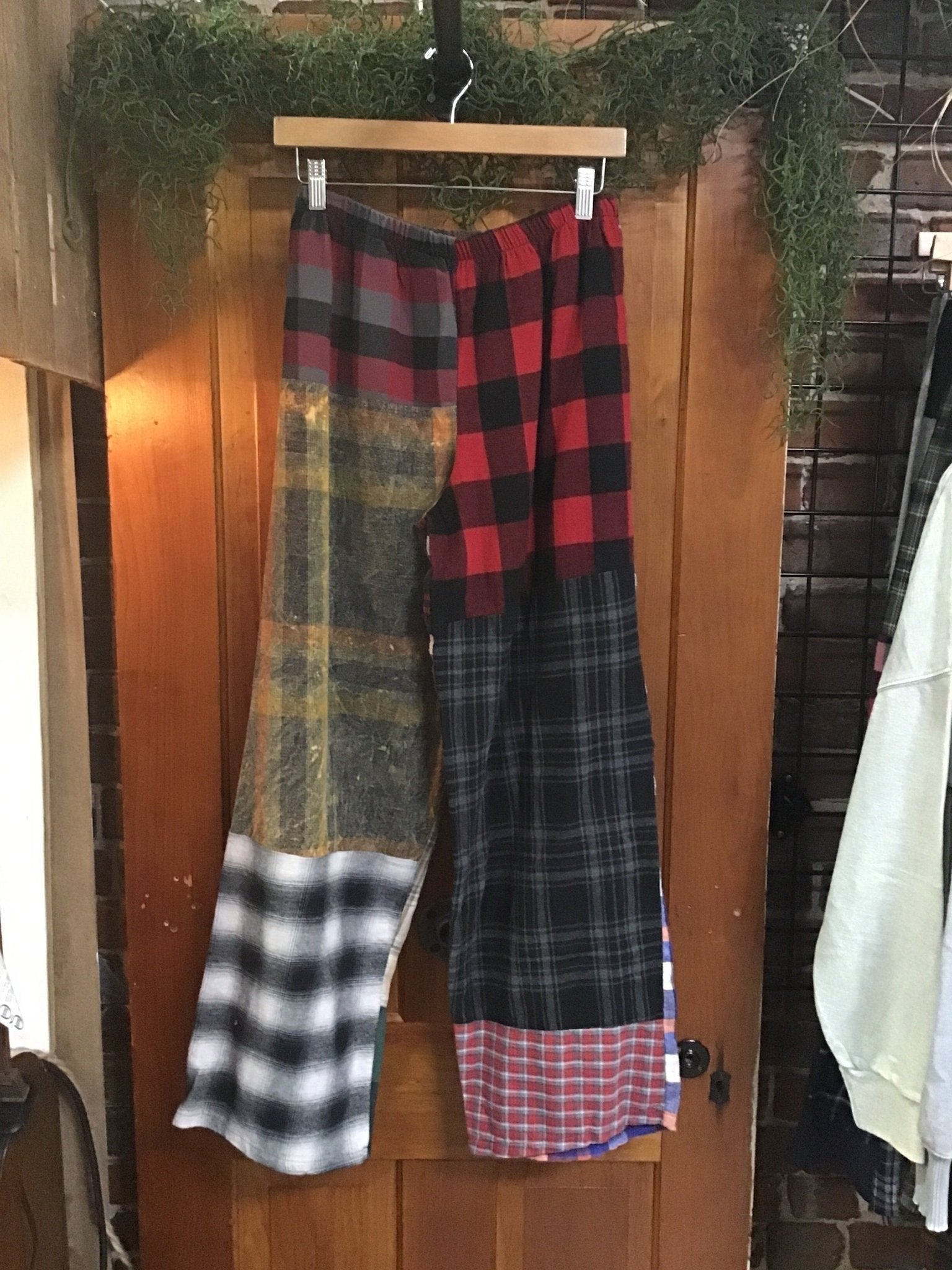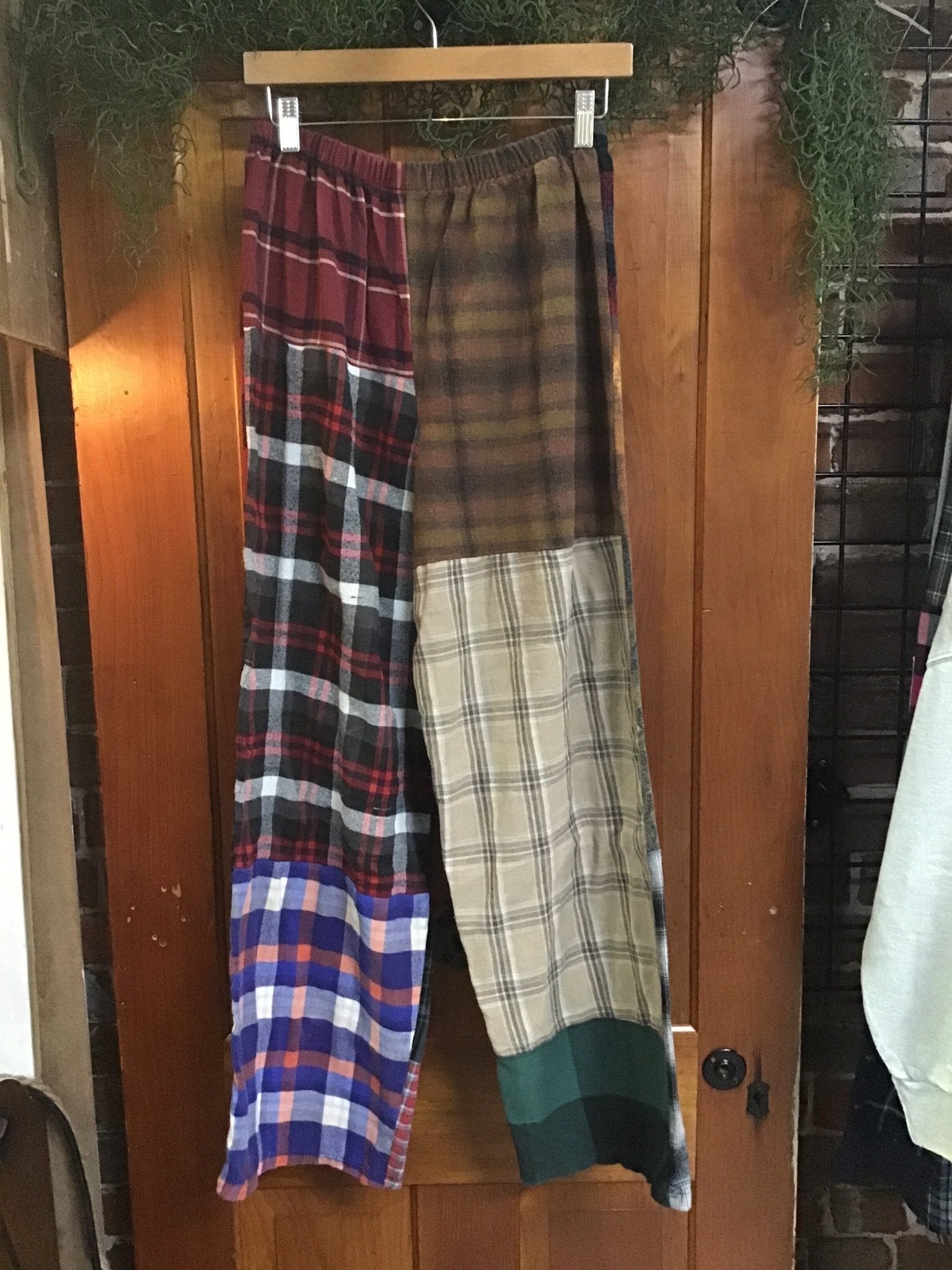 Authentic Vintage Flannel shirts reworked into an elastic waist pant. Each piece is unique and will come with a one-of-a-kind pattern and colors. This pair has a bleached plaid panels on the front.