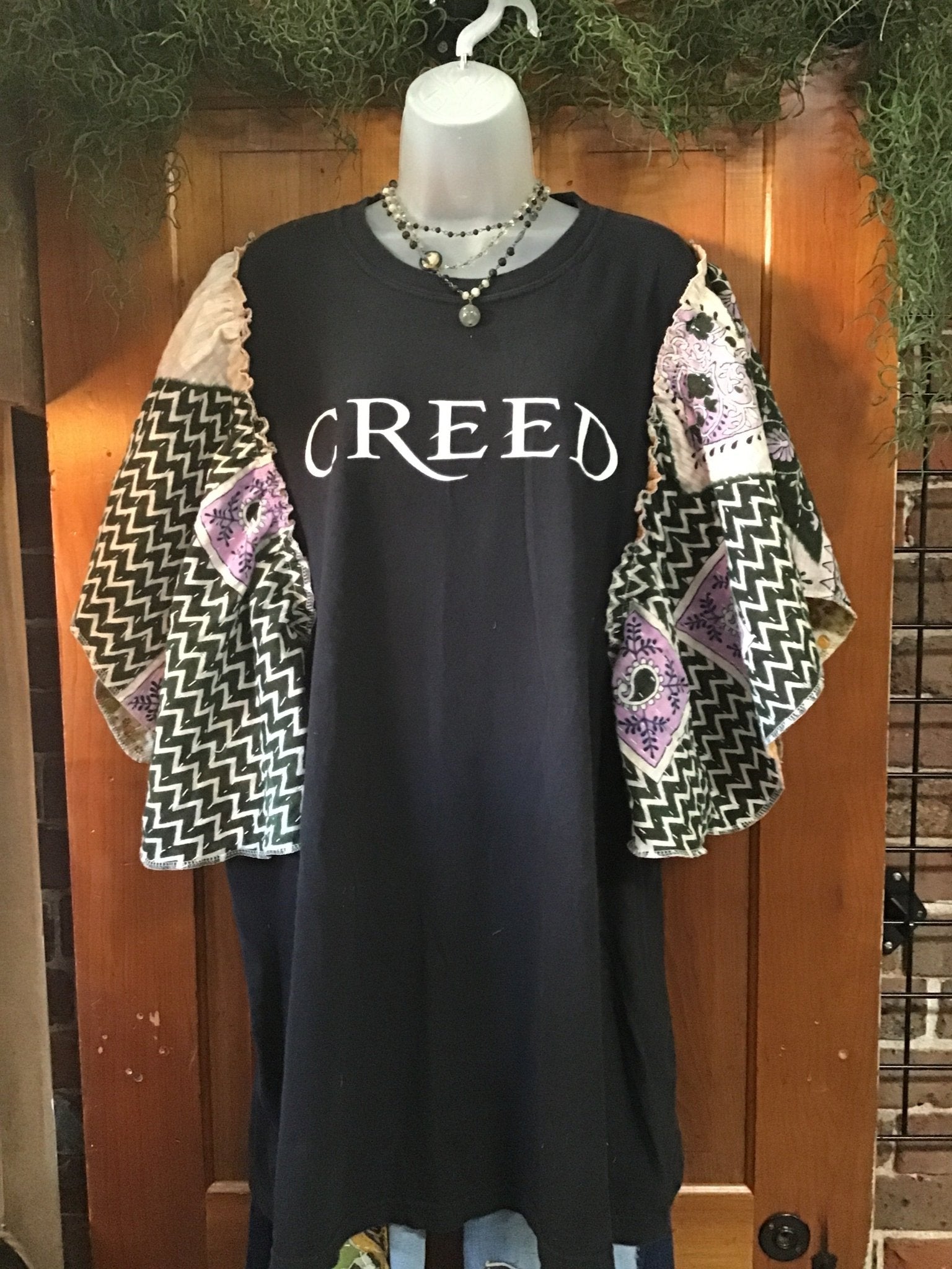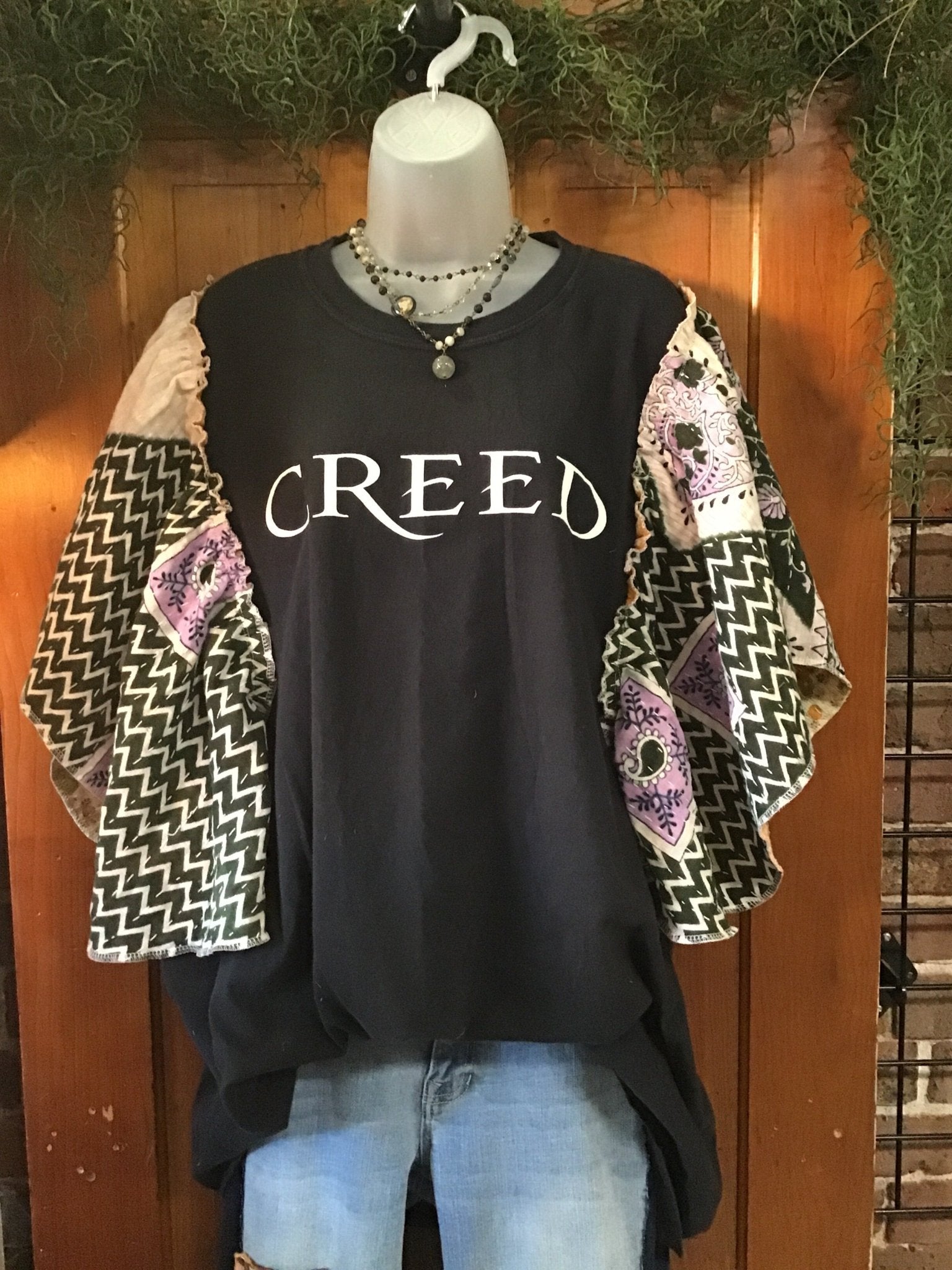 This CREED band tee will surely make you smile ... This will pair well with jeans or cutoffs for your next music festival or concert! This eco-friendly, sustainable statement piece is created from upcycled Kantha quilts -this unique band tee is one of a kind! There is a tag on the tee that says 3XL. The tshirt sleeves were cut off (raw edge) and the kantha edges have been serger finished. We recommend you compare your best-fitting t-shirt measurements with the measurements below:
