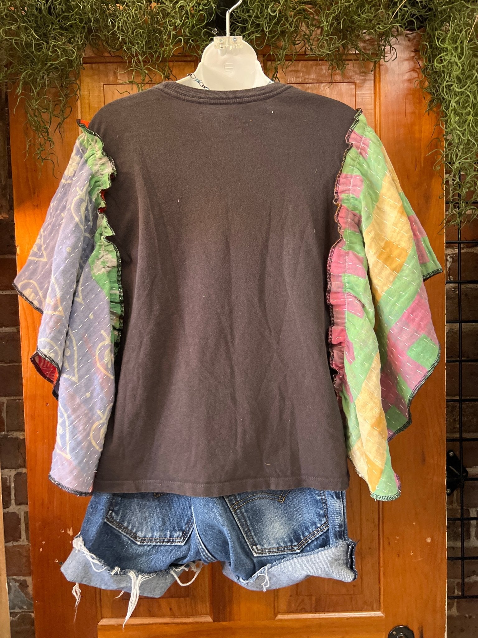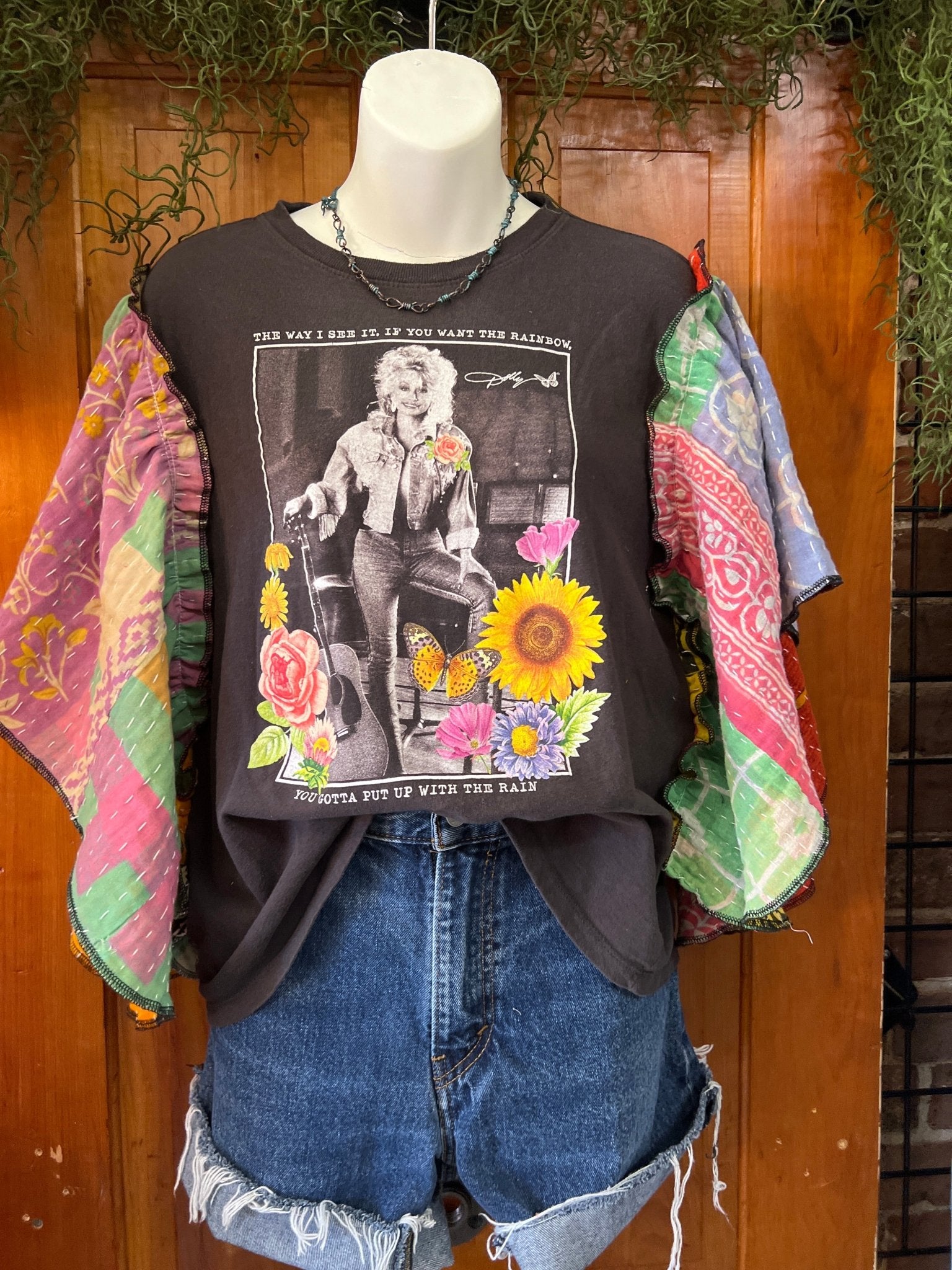 This Dolly tee will surely make you smile ... This will pair well with jeans or cutoffs for your next music festival or concert! This eco-friendly, sustainable statement piece is created from upcycled Kantha quilts -this unique tee is one of a kind! There is a tag on the tee that says MEDIUM. The tshirt sleeves were cut off (raw edge) and the kantha edges have been serger finished. We recommend you compare your best-fitting t-shirt measurements with the measurements below: