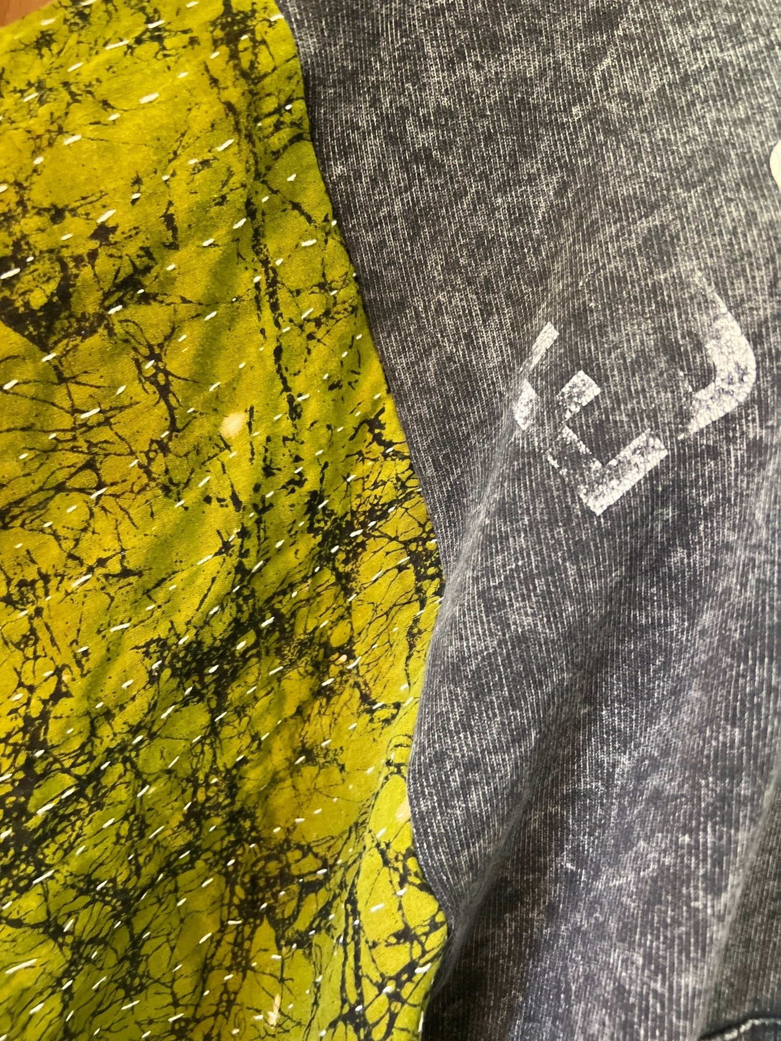 Upgrade your wardrobe with this one-of-a-kind, upcycled band sweatshirt now transformed into an eco-friendly Kantha poncho for concerts or everyday wear. Versatility at its finest, this piece goes great with jeans or shorts, letting you express your unique style... We consider our poncho sizes as "free size"-easily fitting up to 2X!