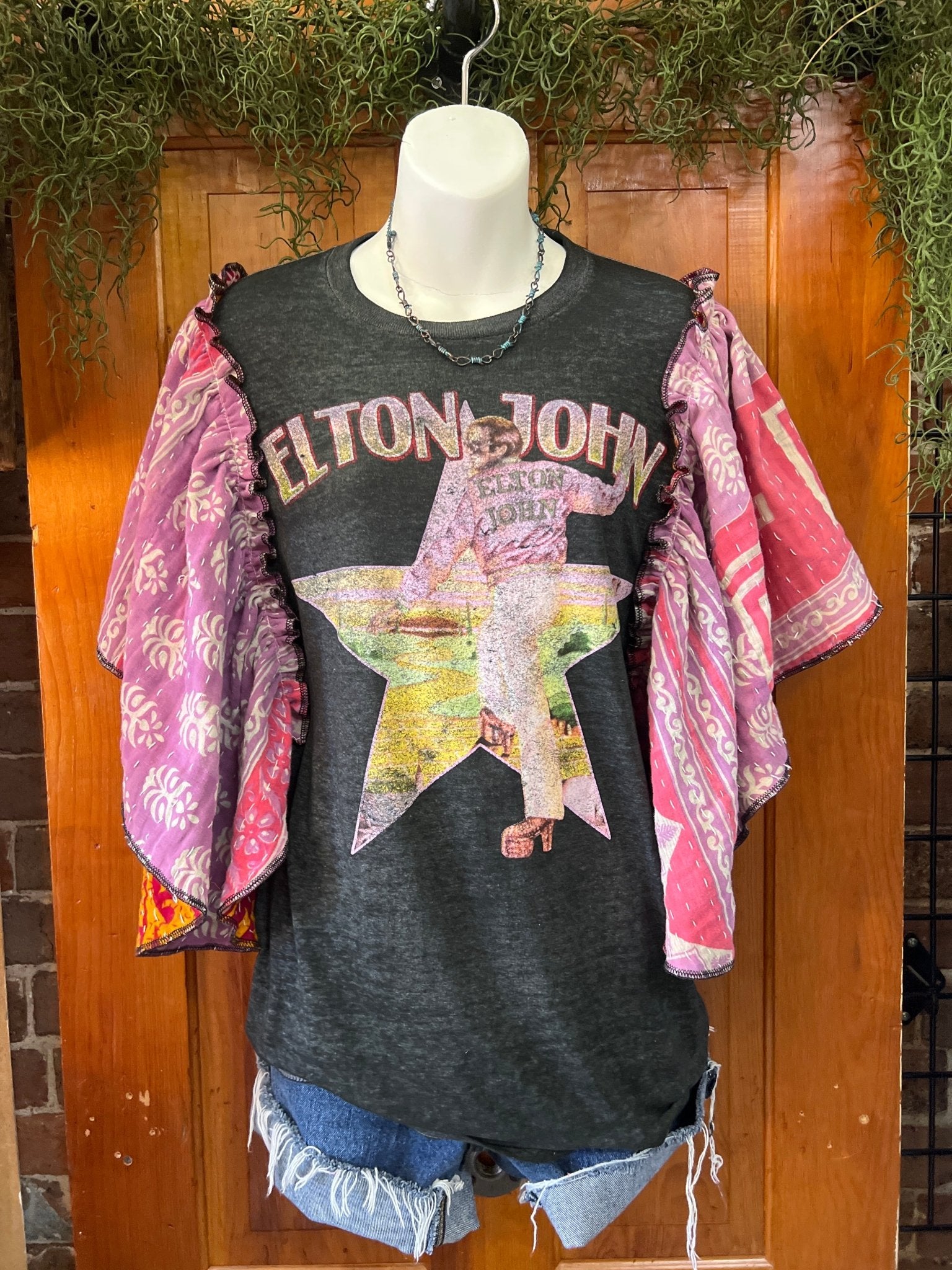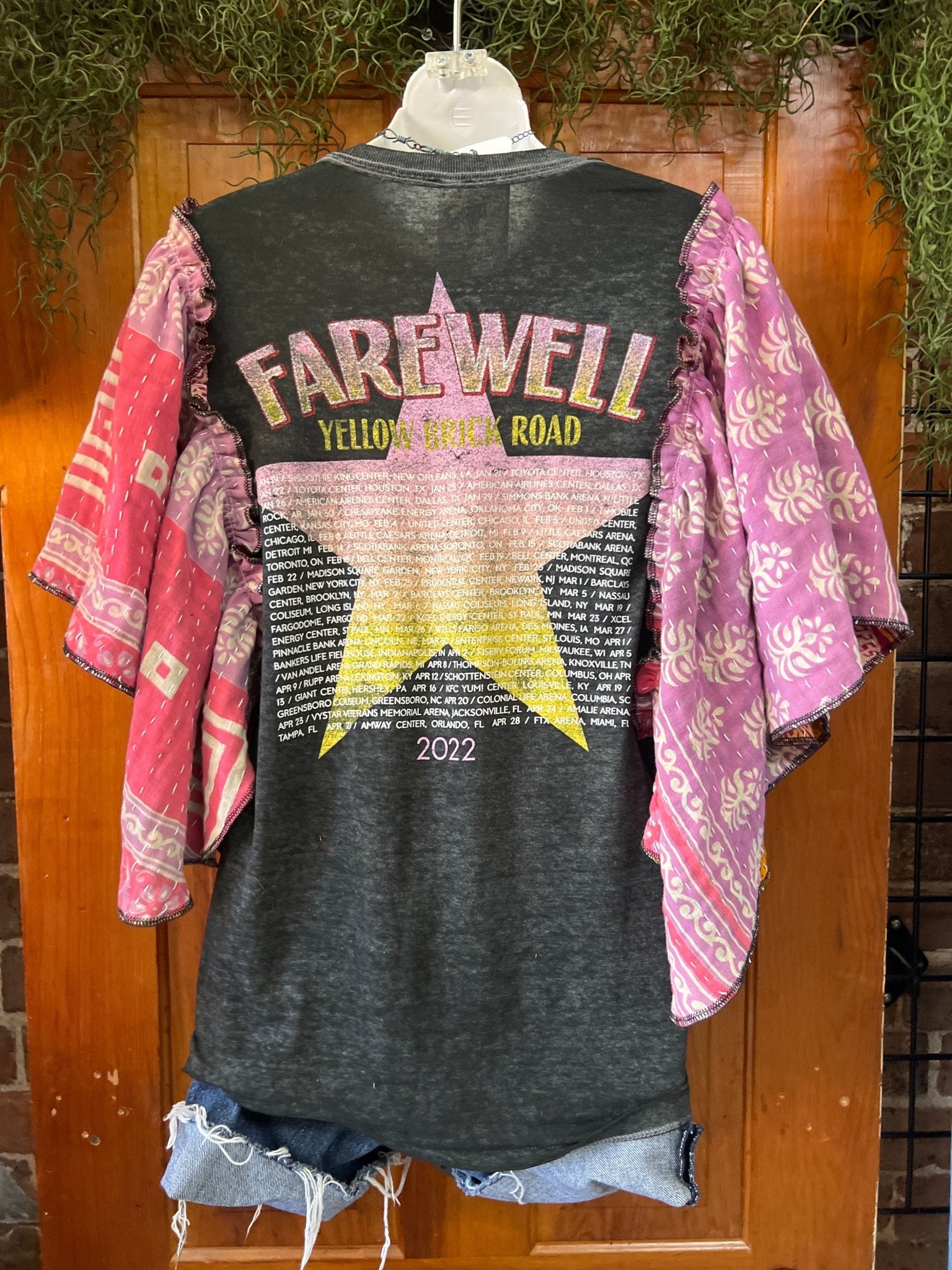 This band tee will surely make you smile ... This will pair well with jeans or cutoffs for your next music festival or concert! This eco-friendly, sustainable statement piece is created from upcycled Kantha quilts -this unique band tee is one of a kind! There is a tag on the tee that says small.... The tshirt sleeves were cut off (raw edge) and the kantha edges have been serger finished. We recommend you compare your best-fitting t-shirt measurements with the measurements below: