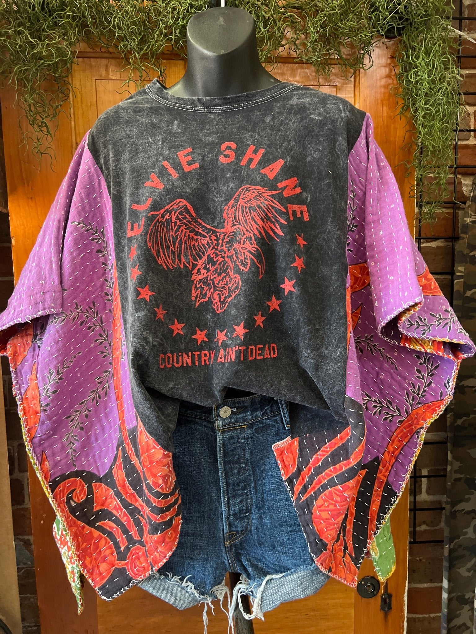 Upgrade your wardrobe with this one-of-a-kind, upcycled Elvie Shane band tee now transformed into an eco-friendly Kantha poncho for concerts or everyday wear. Versatility at its finest, this piece goes great with jeans or shorts, letting you express your unique style... We consider our poncho sizes as "free size"-easily fitting up to 2X!