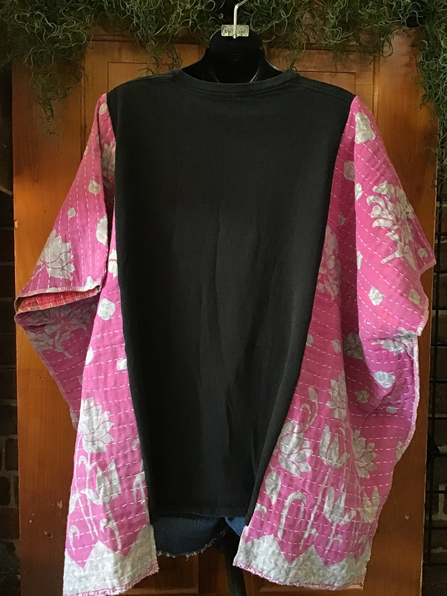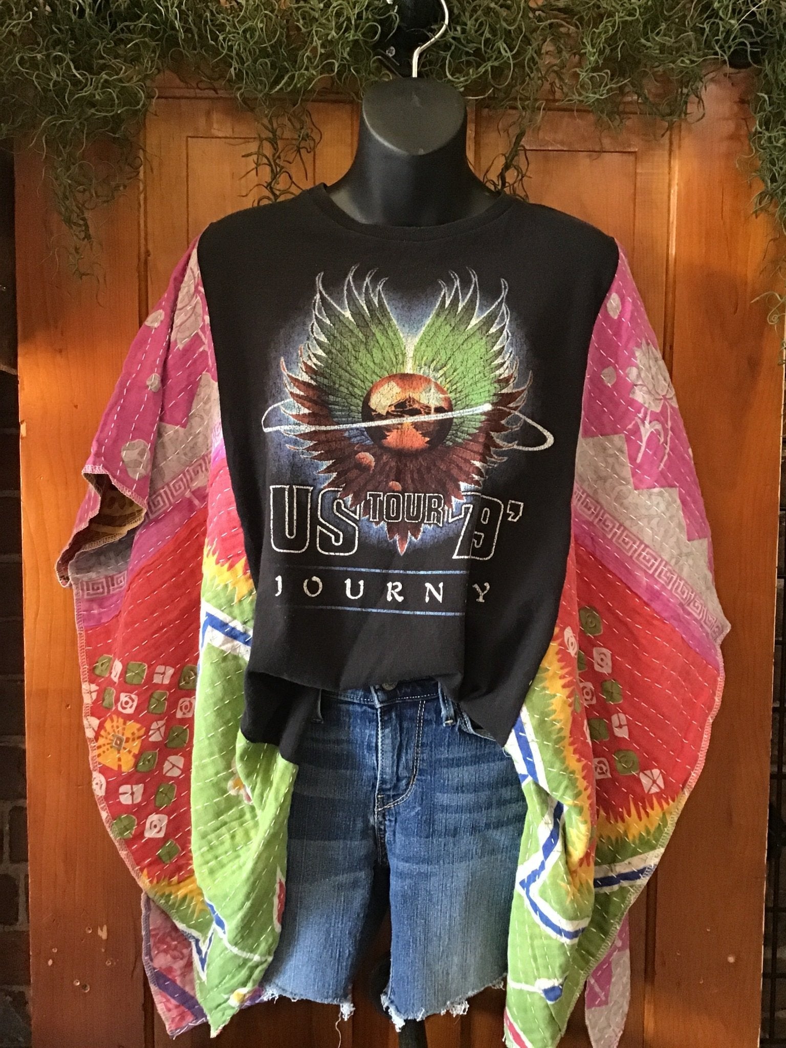 Upgrade your wardrobe with this one-of-a-kind, upcycled Journey band tee now transformed into an eco-friendly Kantha poncho for concerts or everyday wear. Versatility at its finest, this piece goes great with jeans or shorts, letting you express your unique style... We consider our poncho sizes as "free size"-easily fitting up to 2X!