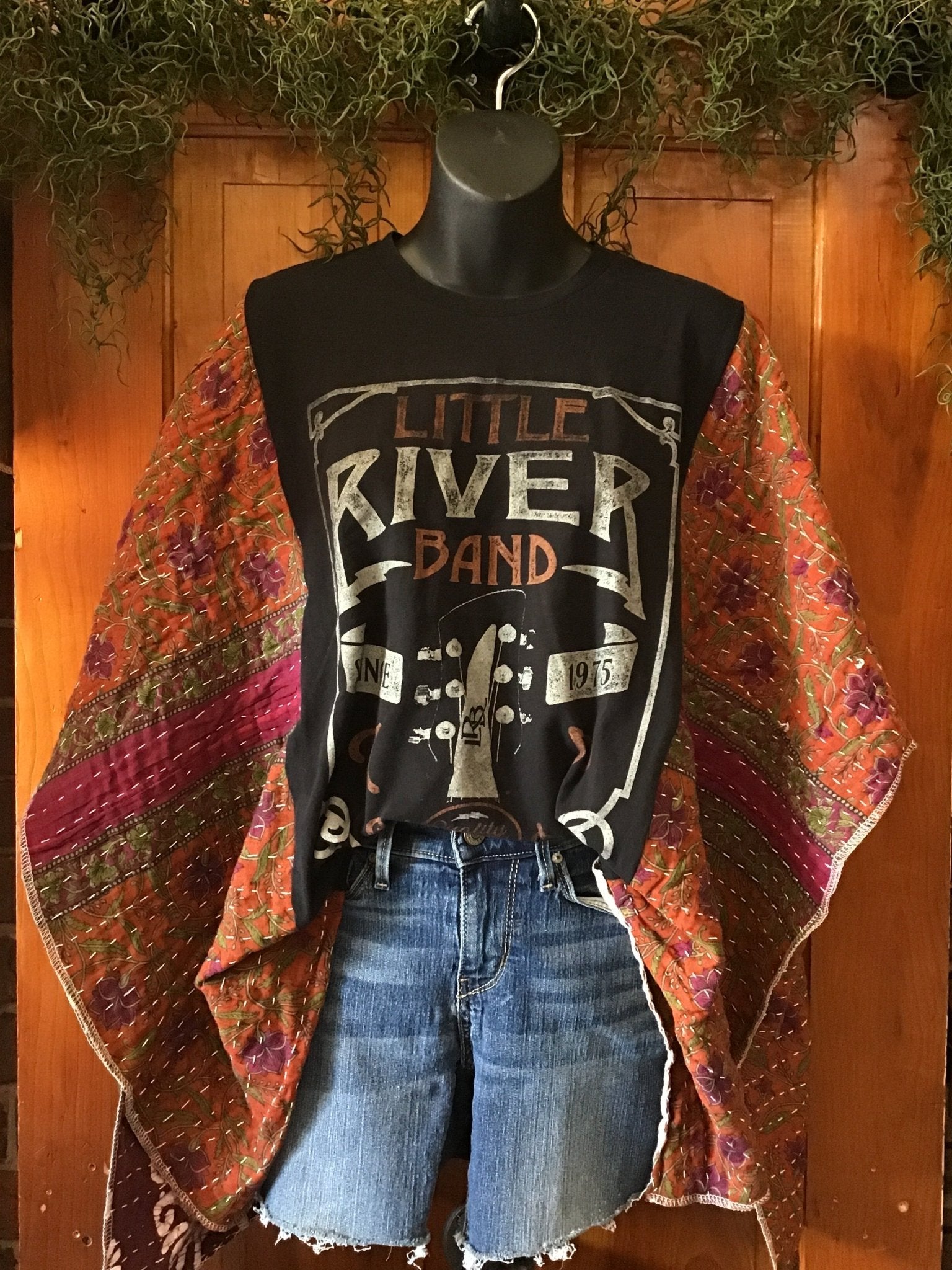 Upgrade your wardrobe with this one-of-a-kind, upcycled Little River Band band tee now transformed into an eco-friendly Kantha poncho for concerts or everyday wear. Versatility at its finest, this piece goes great with jeans or shorts, letting you express your unique style... We consider our poncho sizes as "free size"-easily fitting up to 2X!