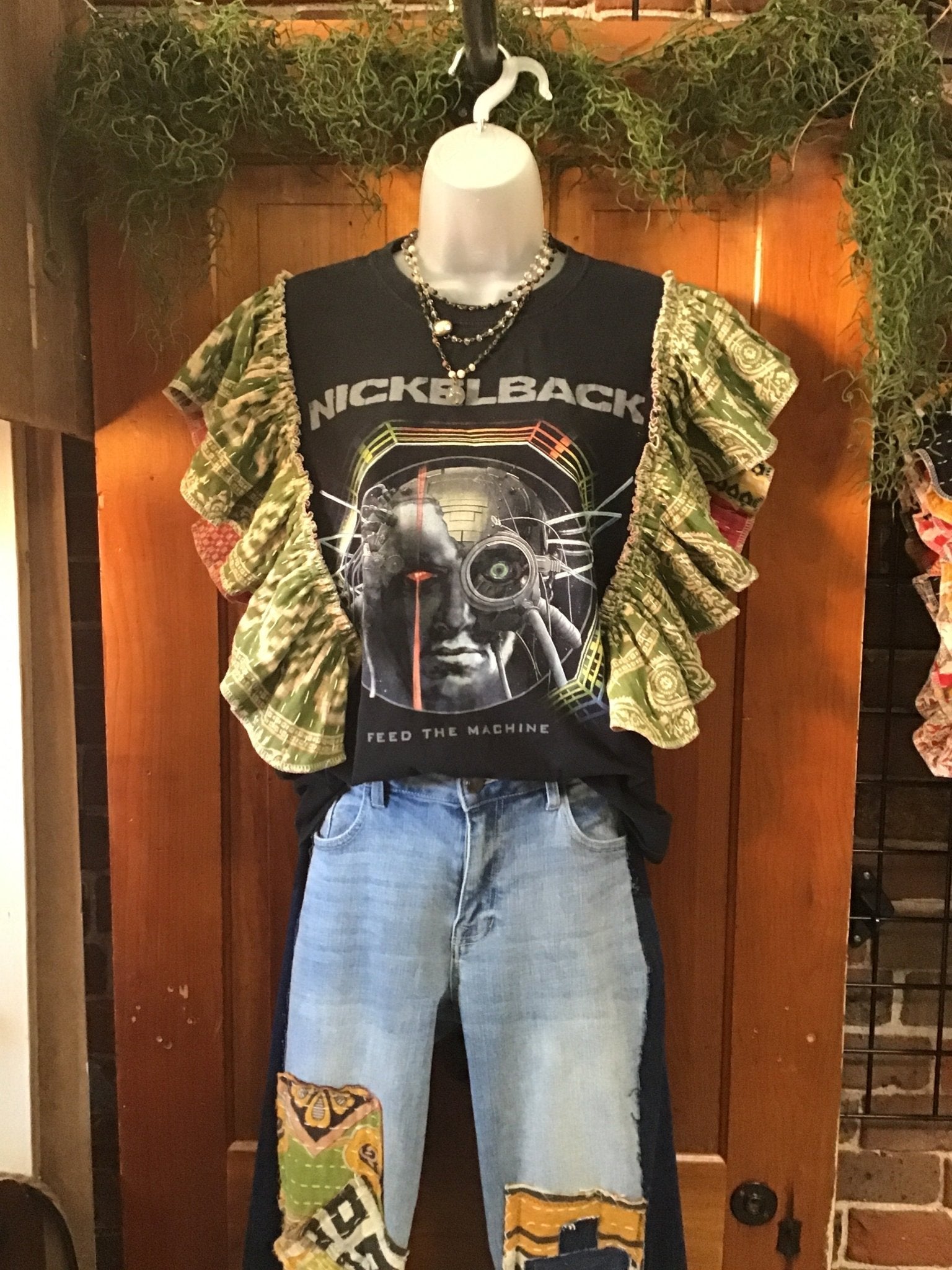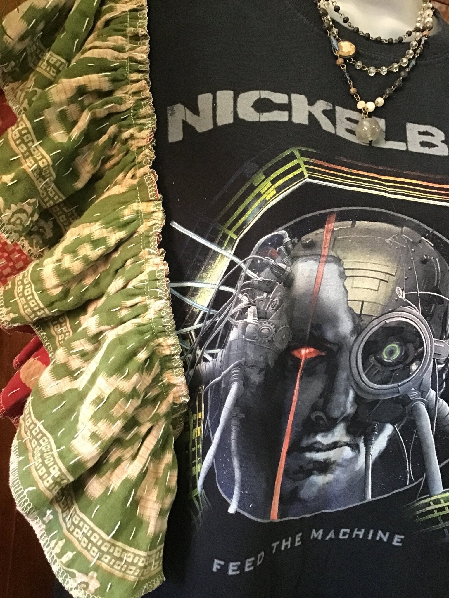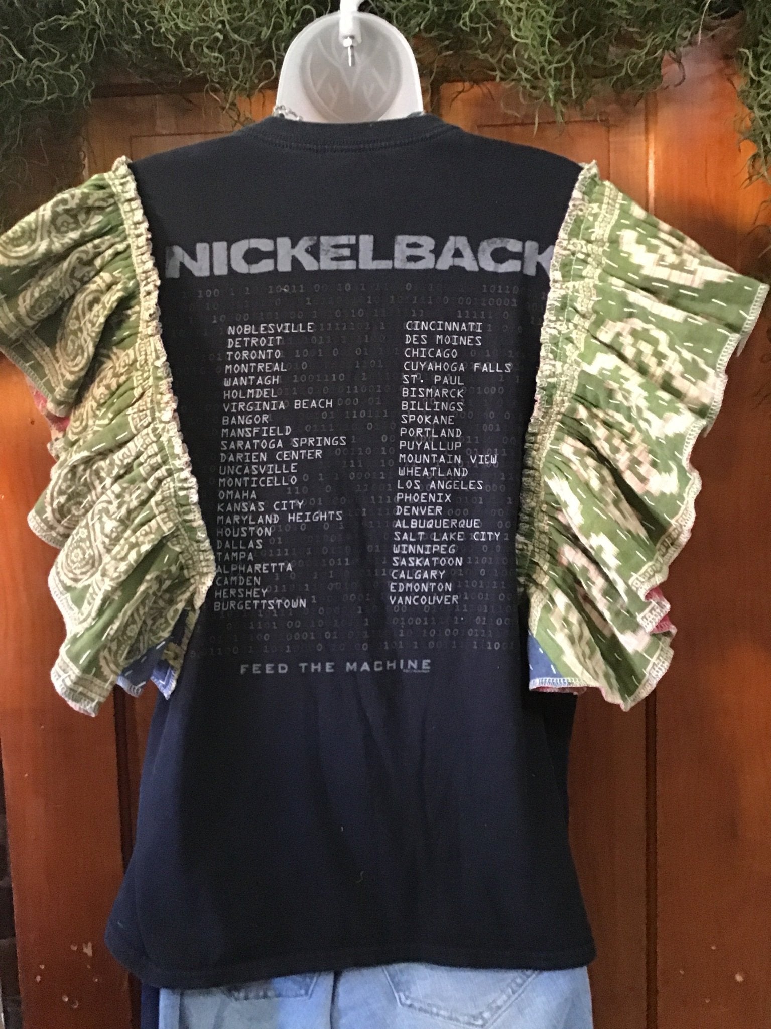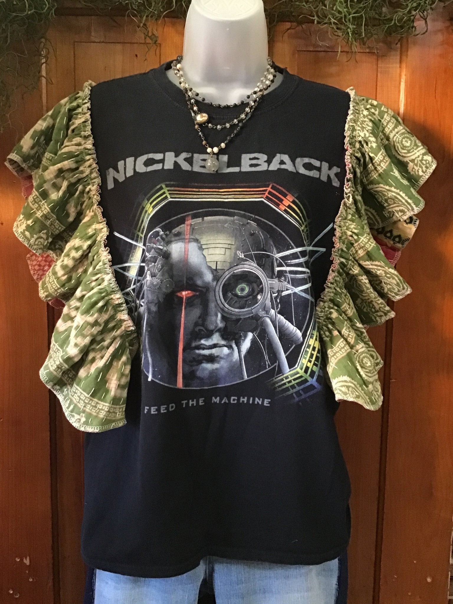This black Nickelback graphic tee will surely make you smile ... The sounds of Nickelback pair well with jeans or cutoffs for your next music festival or concert! This eco-friendly, sustainable statement piece is created from upcycled Kantha quilts -this unique band tee is one of a kind! The tag in the tee is illegible.Check the measurements closely! The tshirt sleeves were cut off (raw edge) and the kantha edges have been serger finished.. We recommend you compare your best-fitting t-shirt measurements with the measurements below: