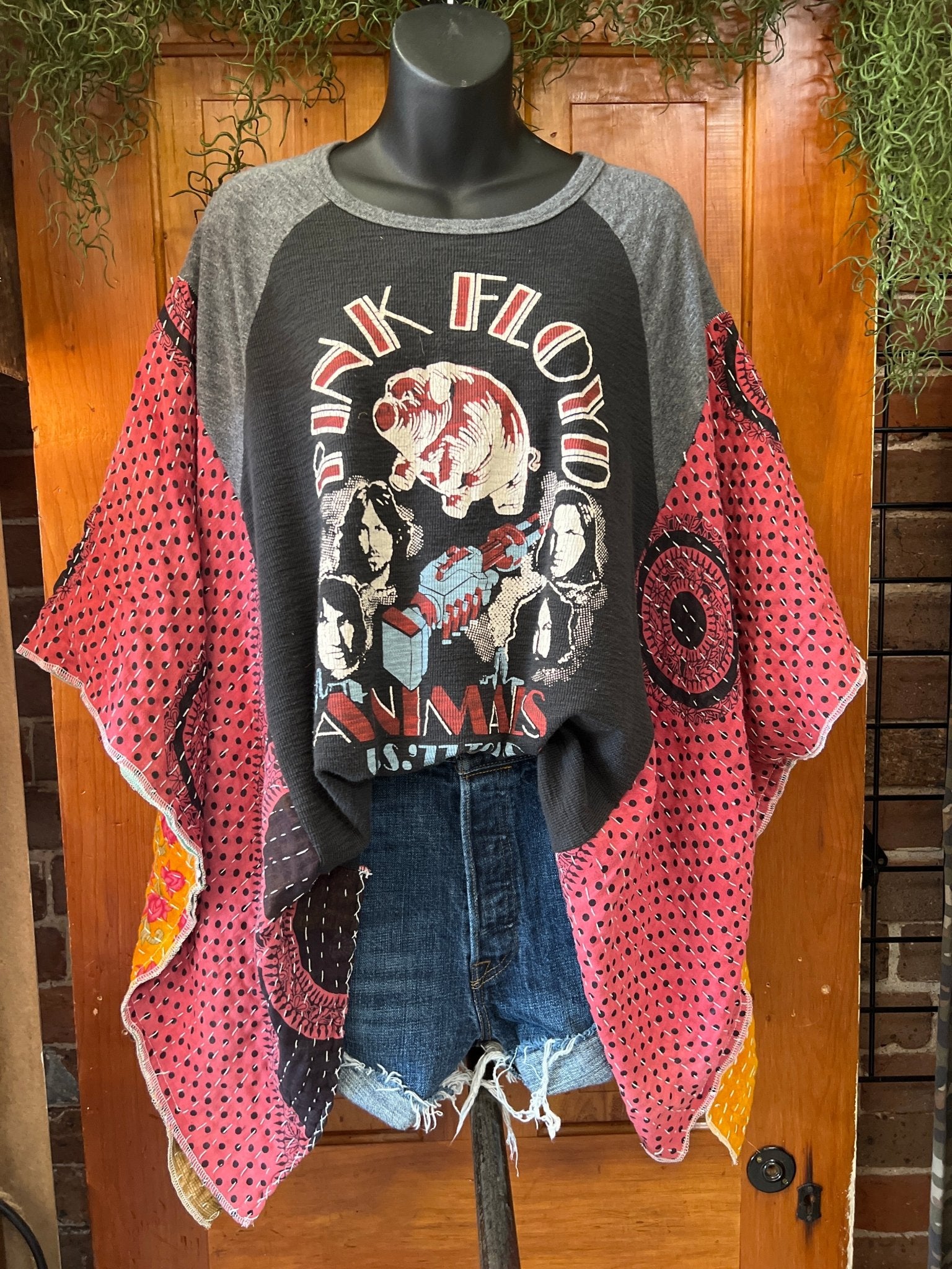 Upgrade your wardrobe with this one-of-a-kind, upcycled Pink Floyd Animals band tee now transformed into an eco-friendly Kantha poncho for concerts or everyday wear. Versatility at its finest, this piece goes great with jeans or shorts, letting you express your unique style... We consider our poncho sizes as "free size"-easily fitting up to 2X!