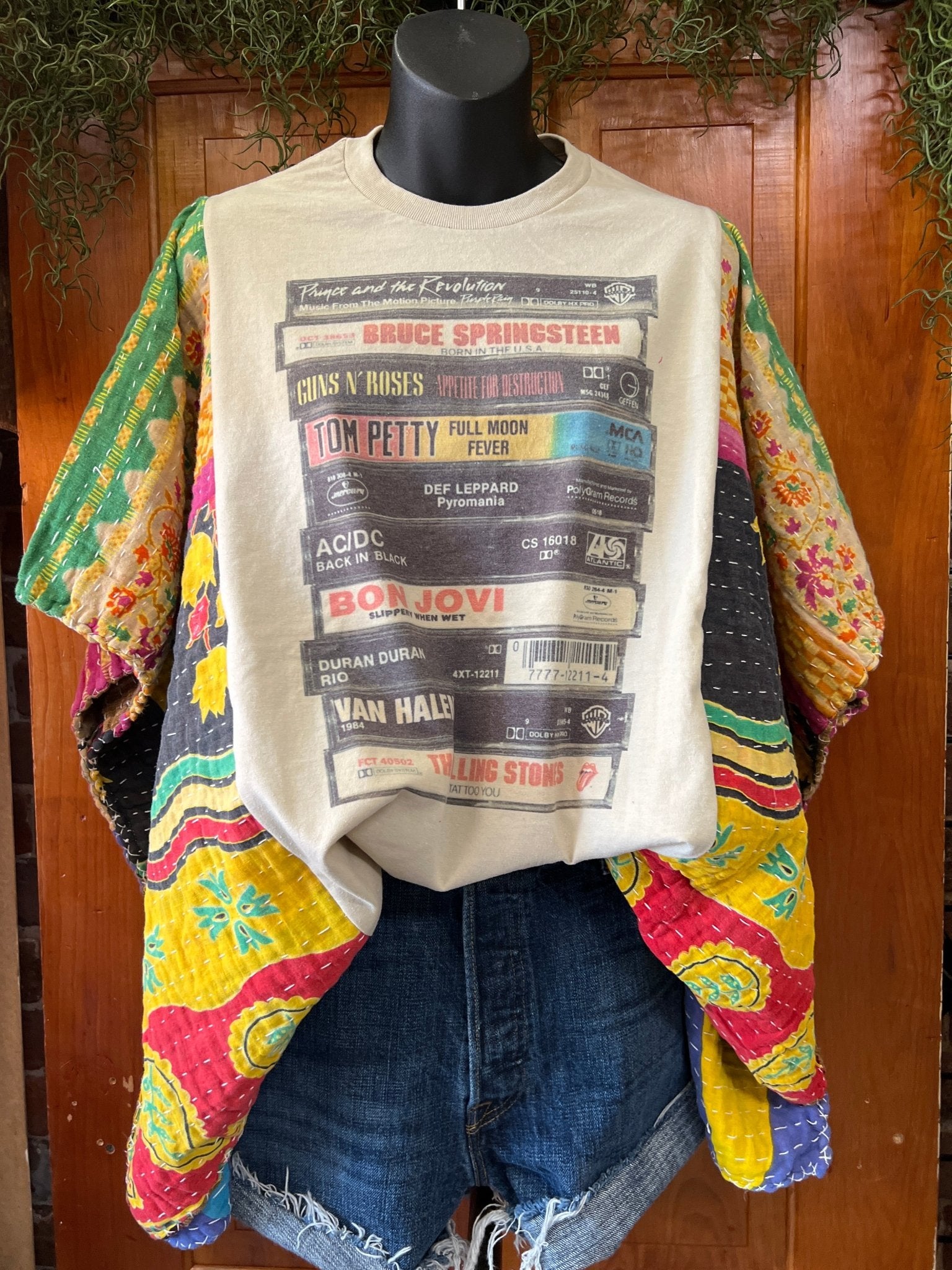 Upgrade your wardrobe with this one-of-a-kind, upcycled Playlist band tee now transformed into an eco-friendly Kantha poncho for concerts or everyday wear. Versatility at its finest, this piece goes great with jeans or shorts, letting you express your unique style... We consider our poncho sizes as "free size"-easily fitting up to 2X!