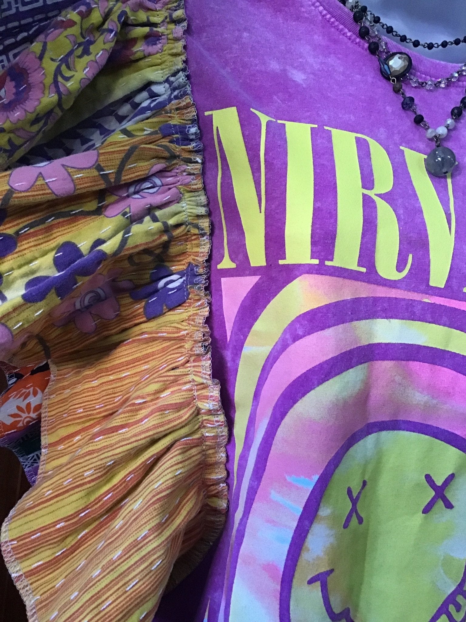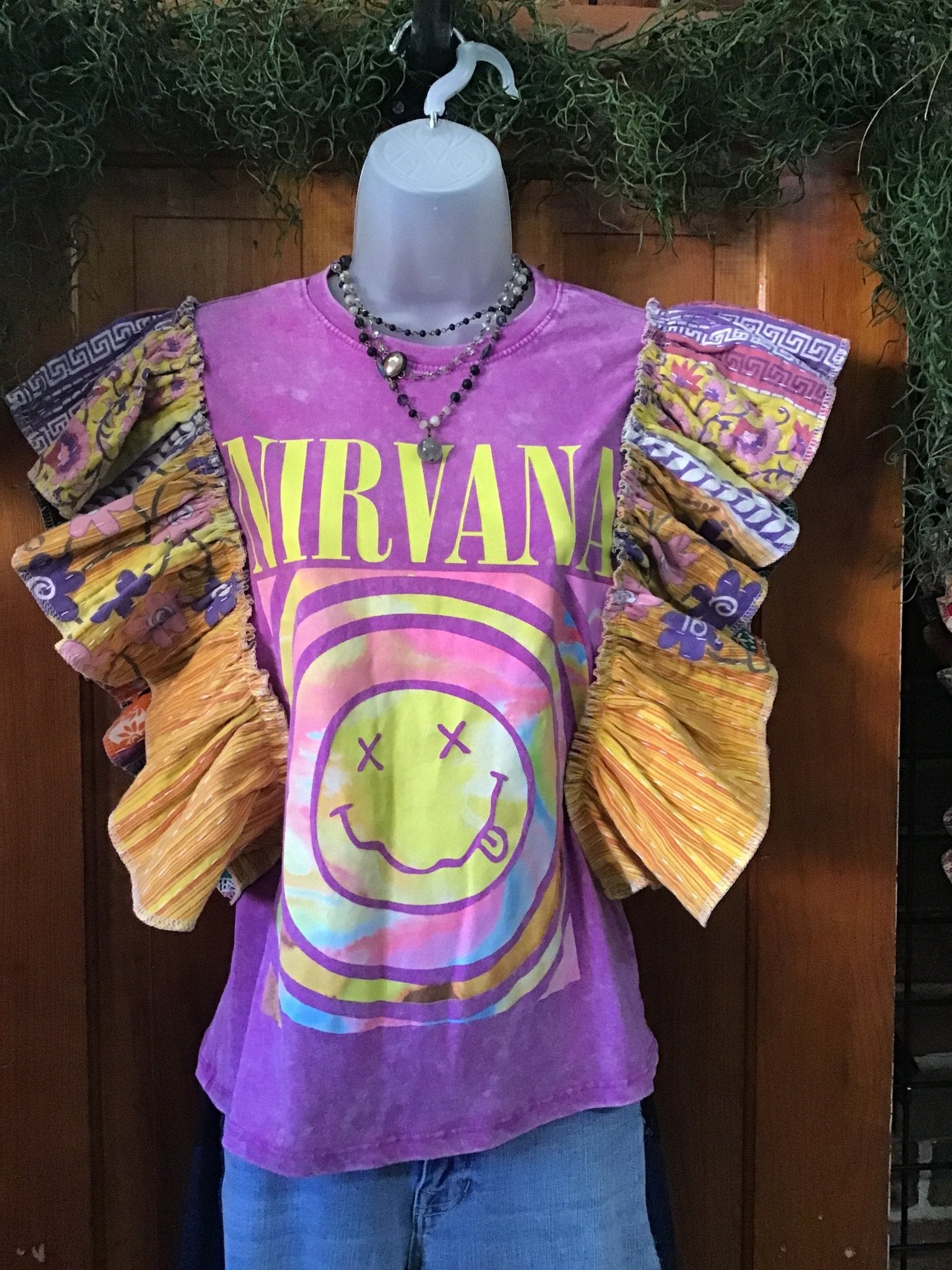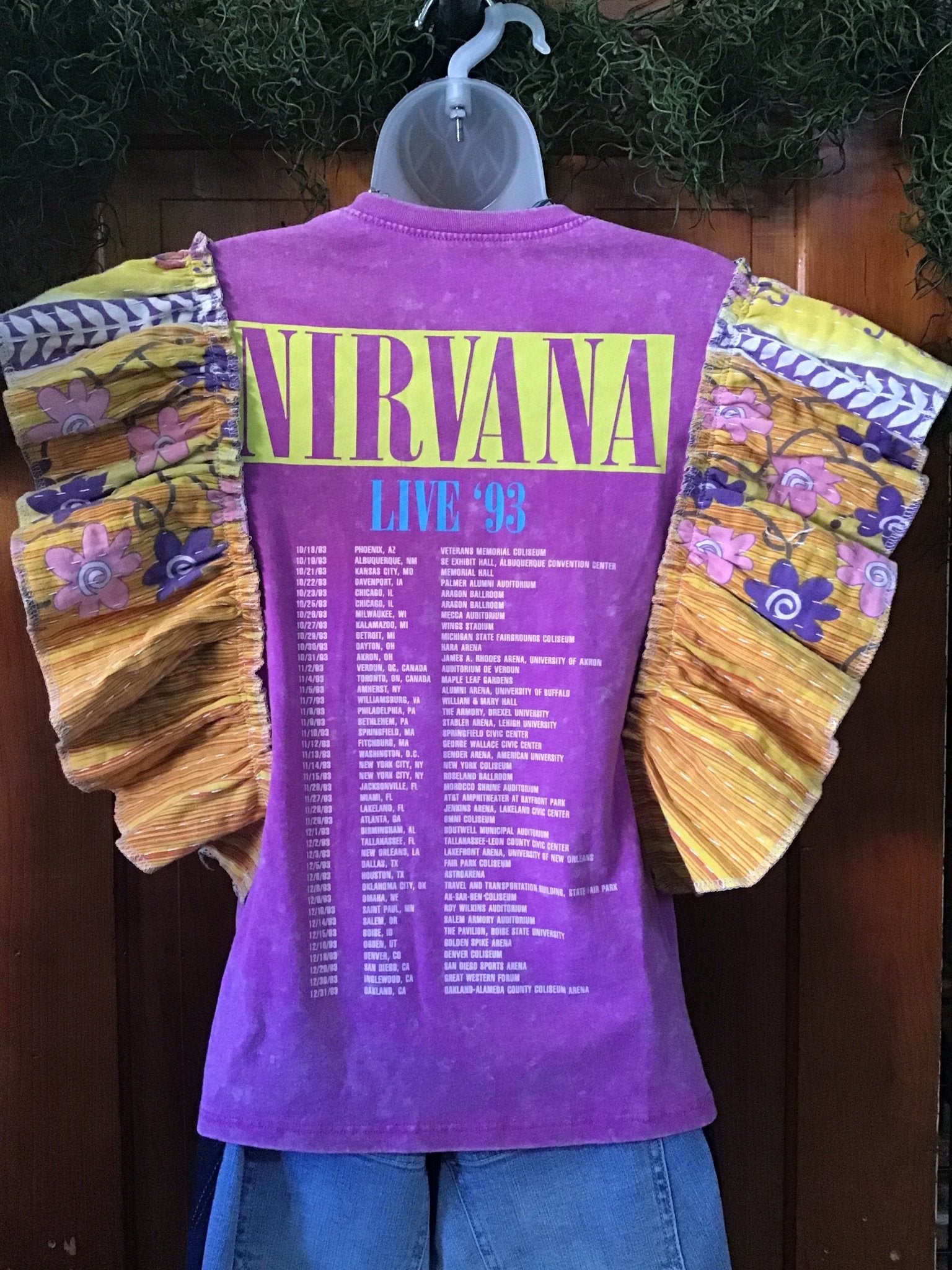 This purple Nirvana graphic tee will surely make you smile ... The sounds of Nirvana pair well with jeans or cutoffs for your next music festival or concert! This eco-friendly, sustainable statement piece is created from upcycled Kantha quilts -this unique band tee is one of a kind! The tag in the tee is XS.The tshirt sleeves were cut off (raw edge) and the kantha edges have been serger finished.. We recommend you compare your best-fitting t-shirt measurements with the measurements below: