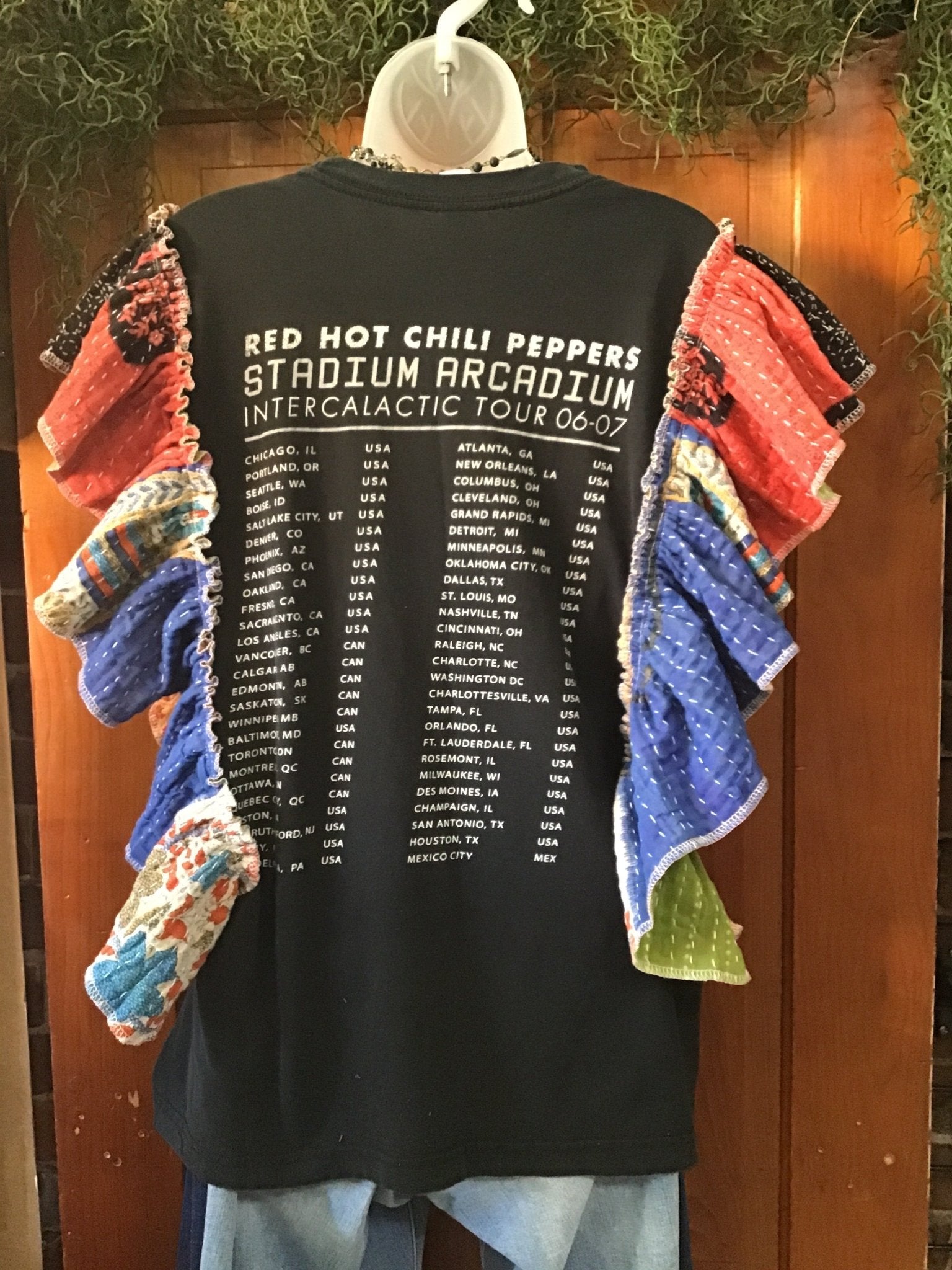 This black Red Hot Chili Peppers graphic tee will surely make you smile ... The sounds of the Peppers pair well with jeans or cutoffs for your next music festival or concert! This eco-friendly, sustainable statement piece is created from upcycled Kantha quilts -this unique band tee is one of a kind! The tag in the tee is XL. The tshirt sleeves were cut off (raw edge) and the kantha edges have been serger finished.. This tee appears to be an actual concert tee and does show signs of wear. A couple holes near the bottom front seam... We recommend you compare your best-fitting t-shirt measurements with the measurements below: