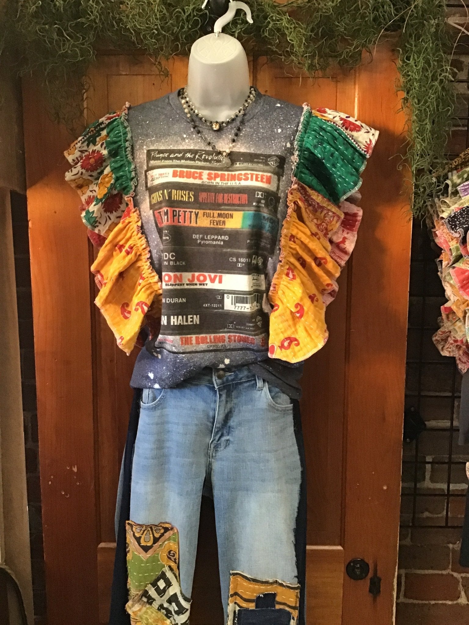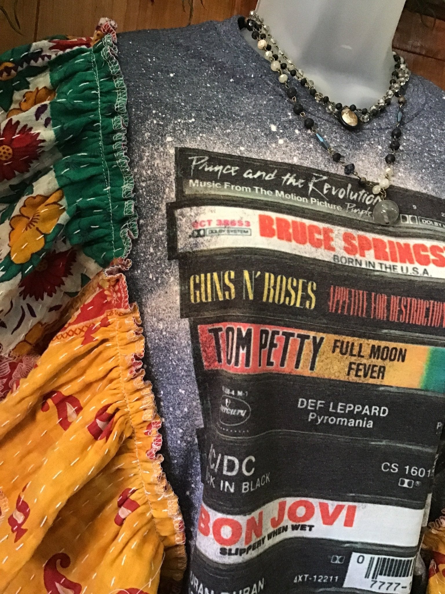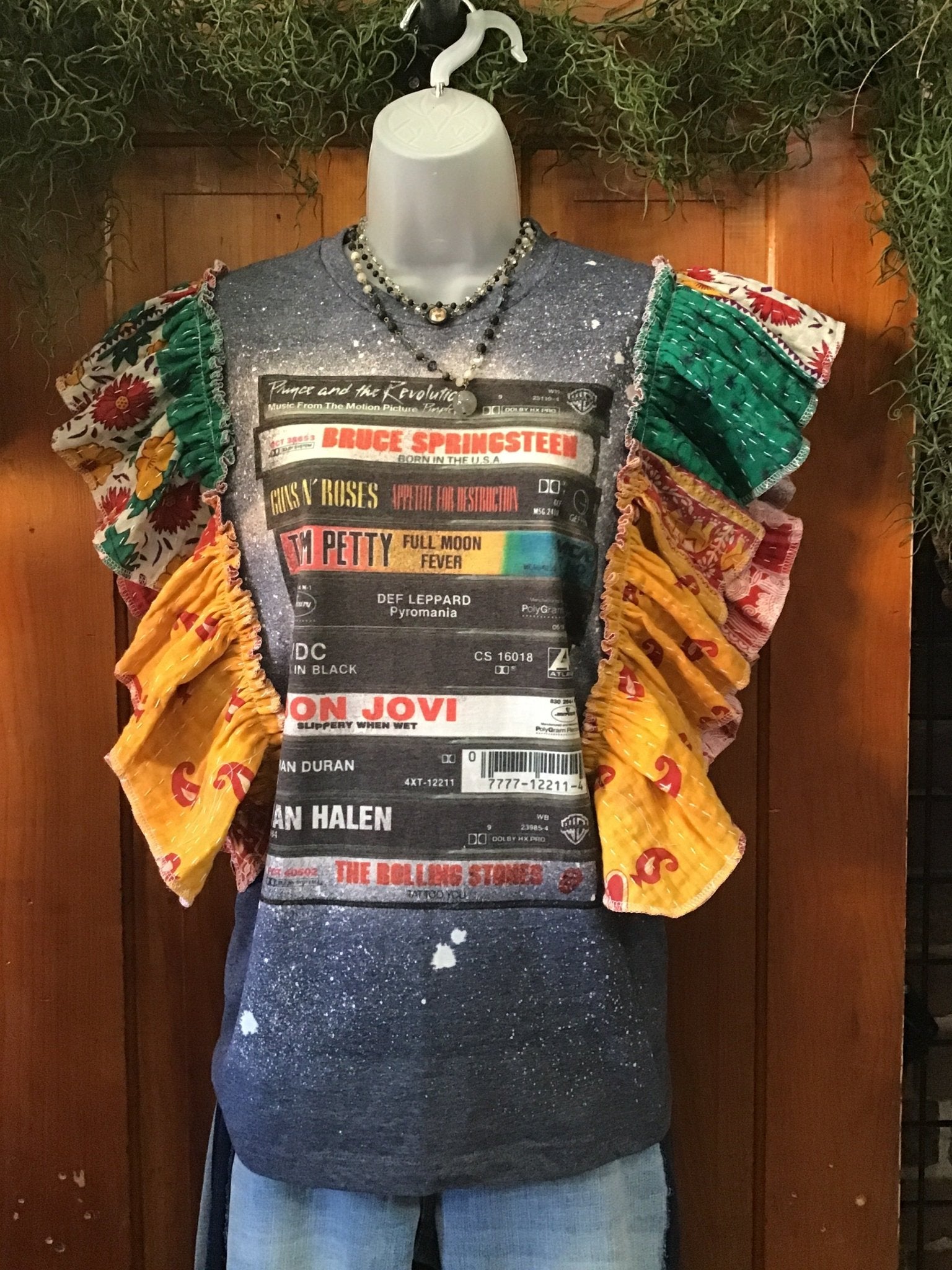 This Rock playlist graphic tee will surely make you smile ... The sounds of these artists pair well with jeans or cutoffs for your next music festival or concert! This eco-friendly, sustainable statement piece is created from upcycled Kantha quilts -this unique band tee is one of a kind! The tag in the tee is small. The tshirt sleeves were cut off (raw edge) and the kantha edges have been serger finished.. We recommend you compare your best-fitting t-shirt measurements with the measurements below: