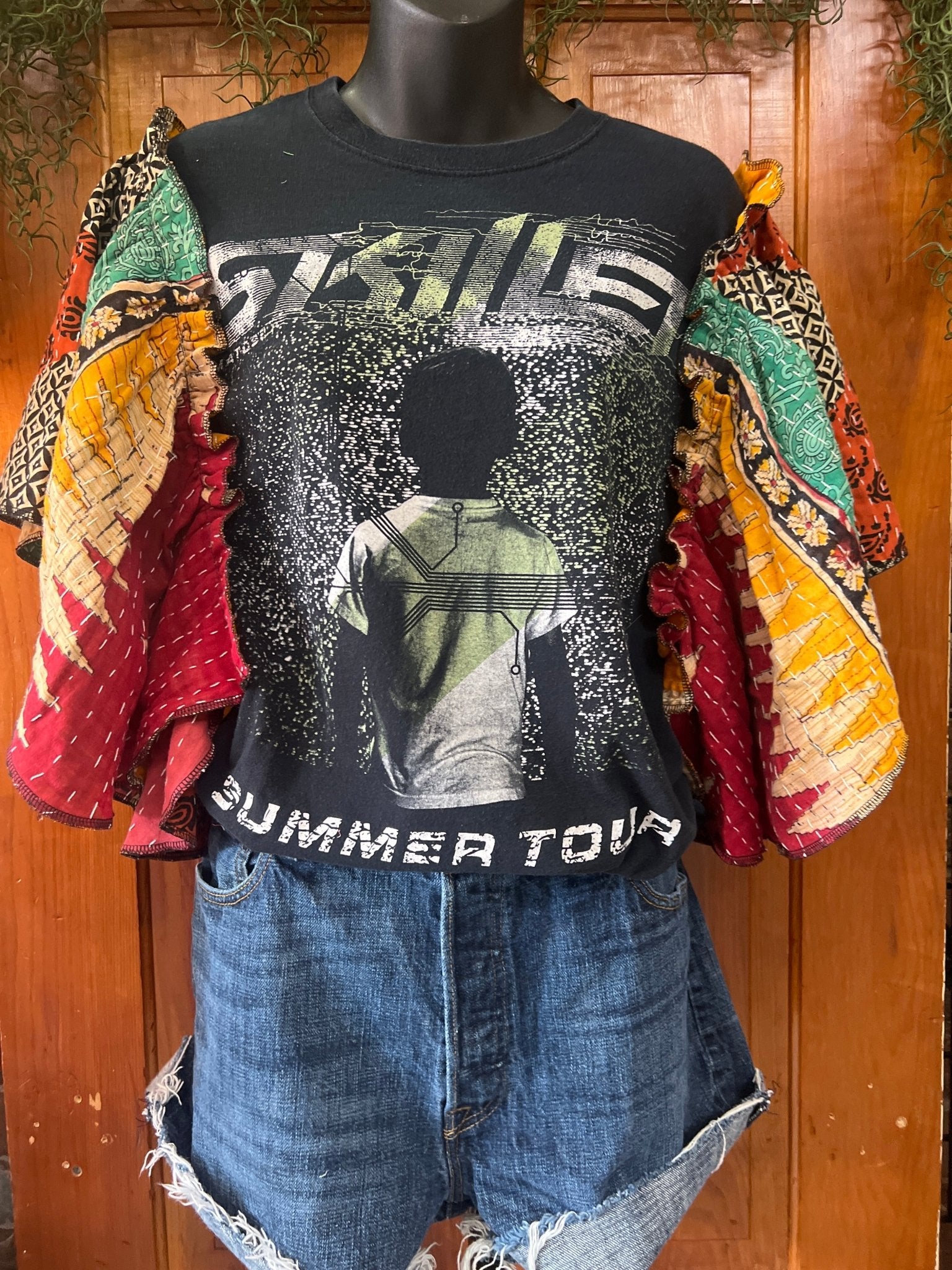 This SKILLET band tee will surely make you smile ... The sounds of SKILLET pair well with jeans or cutoffs for your next music festival or concert! This eco-friendly, sustainable statement piece is created from upcycled Kantha quilts -this unique band tee is one of a kind! There is a tag on the tee that says SMALL. The tshirt sleeves were cut off (raw edge) and the kantha edges have been serger finished. We recommend you compare your best-fitting t-shirt measurements with the measurements below: