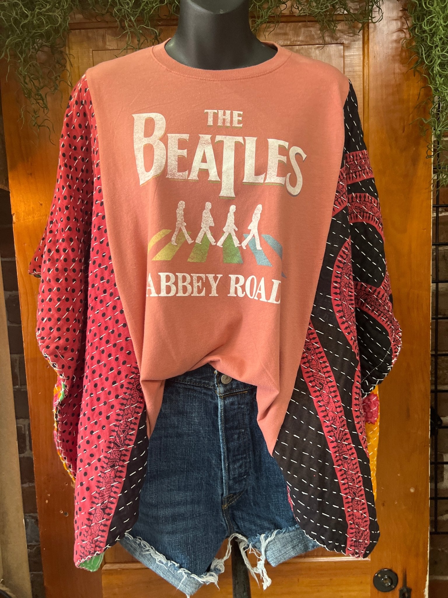 Upgrade your wardrobe with this one-of-a-kind, upcycled Beatles "Abbey Road" band tee now transformed into an eco-friendly Kantha poncho for concerts or everyday wear. Versatility at its finest, this piece goes great with jeans or shorts, letting you express your unique style... We consider our poncho sizes as "free size"-easily fitting up to 2X!