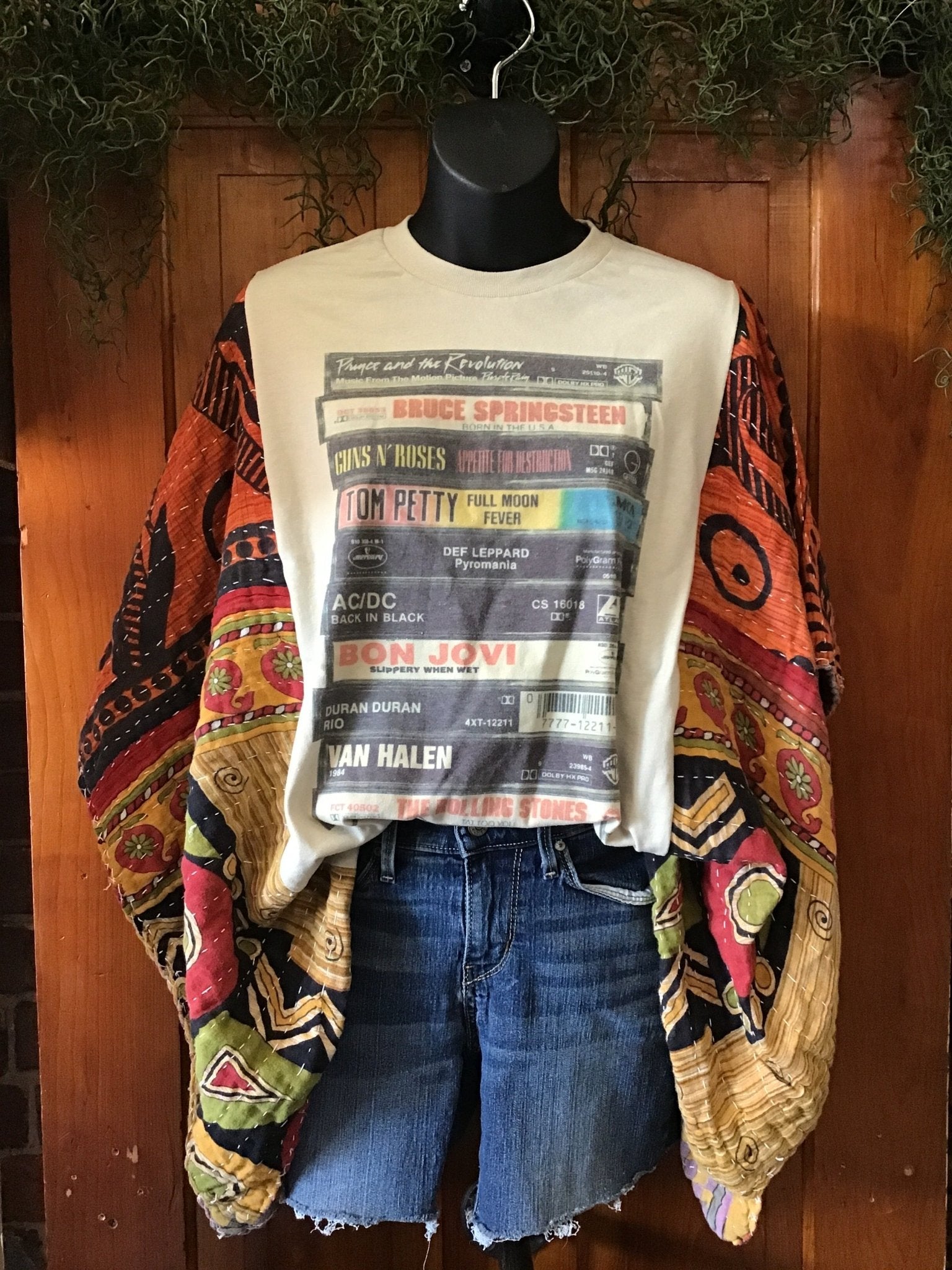 Upgrade your wardrobe with this one-of-a-kind, upcycled VHS Tapes of various artists graphic tee now transformed into an eco-friendly Kantha poncho for concerts or everyday wear. Versatility at its finest, this piece goes great with jeans or shorts, letting you express your unique style... We consider our poncho sizes as "free size"-easily fitting up to 2X!