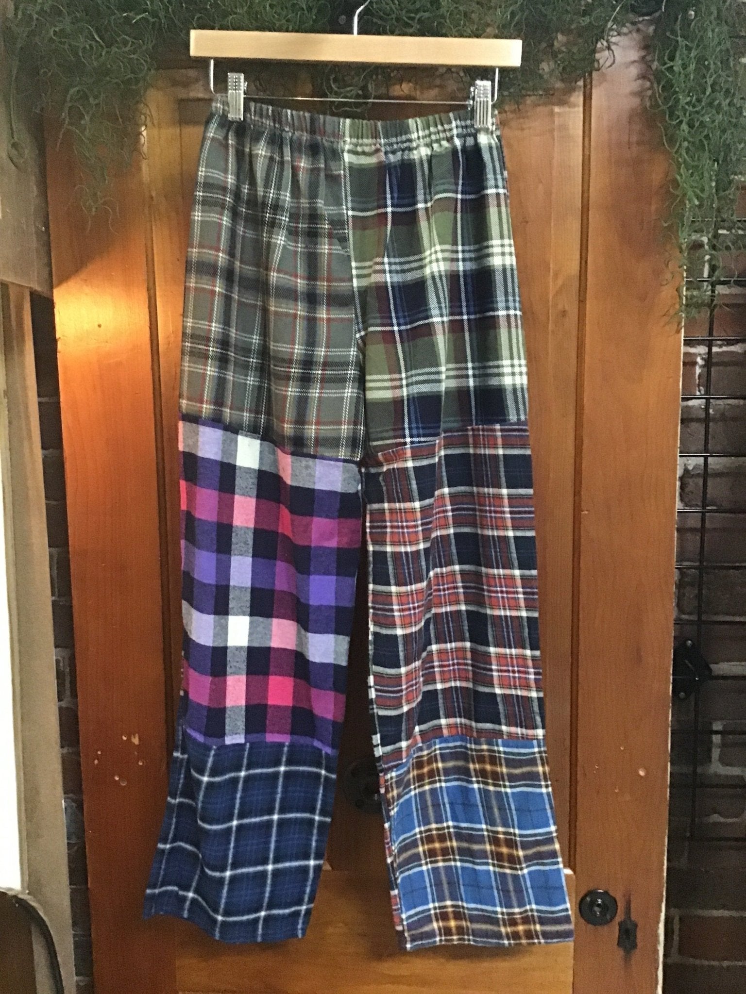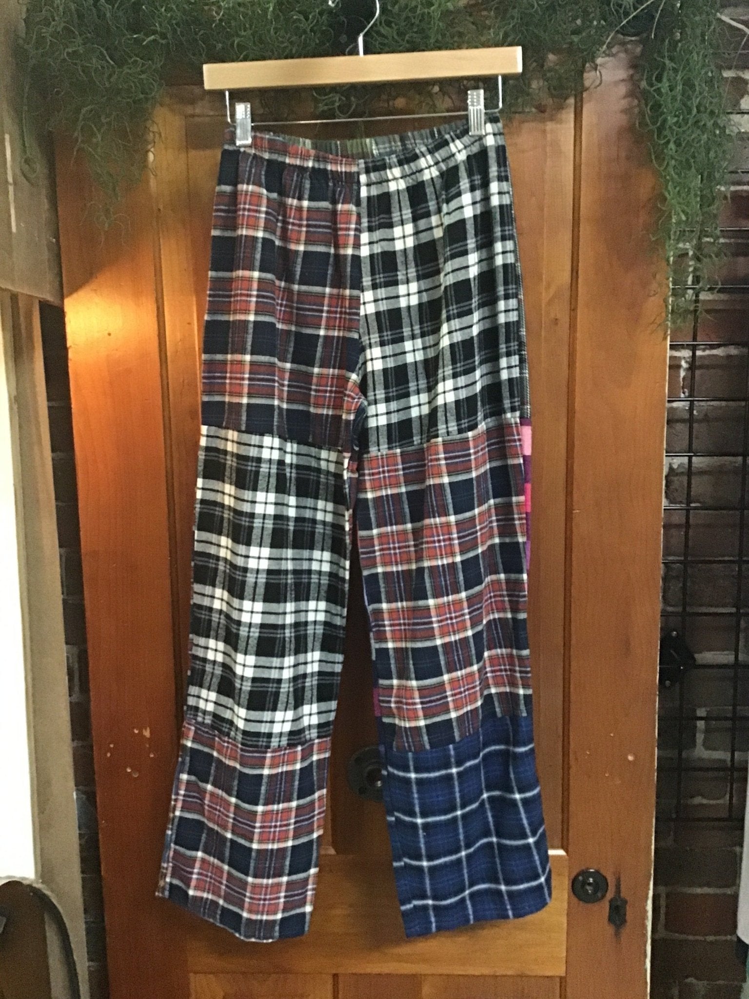 Authentic Vintage Flannel shirts reworked into an elastic waist pant. Each piece is unique and will come with a one-of-a-kind pattern and colors. This pair has black & blue plaids on the front.