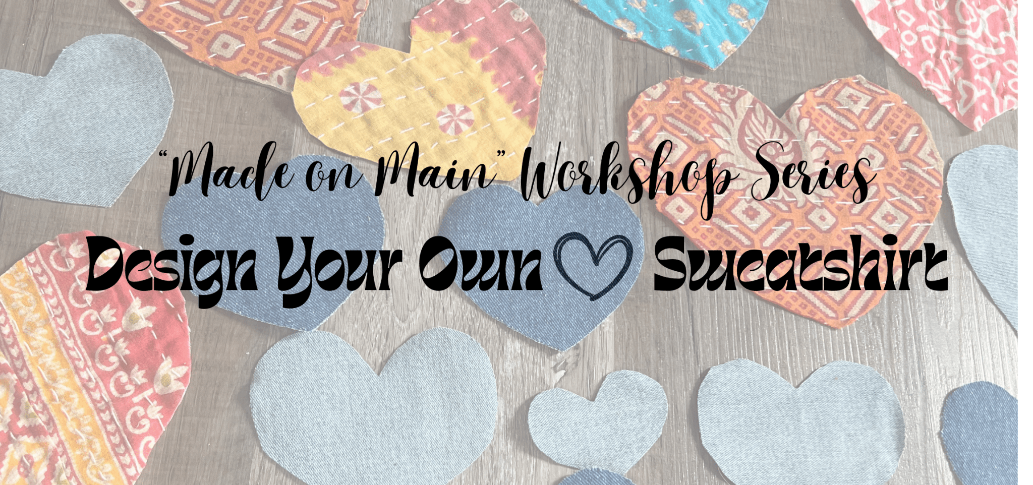 We are so excited to announce the first of our "MADE ON MAIN WORKSHOP SERIES" and design your own Valentine Heart Sweatshirt! This is a drop in event Friday or Saturday where you will pick out up to ten hearts (kantha, lace and denim) and place them and safety pin them to your sweatshirt. We will take them to the Rethreadz studio and sew them on for you to pick up the following weekend!