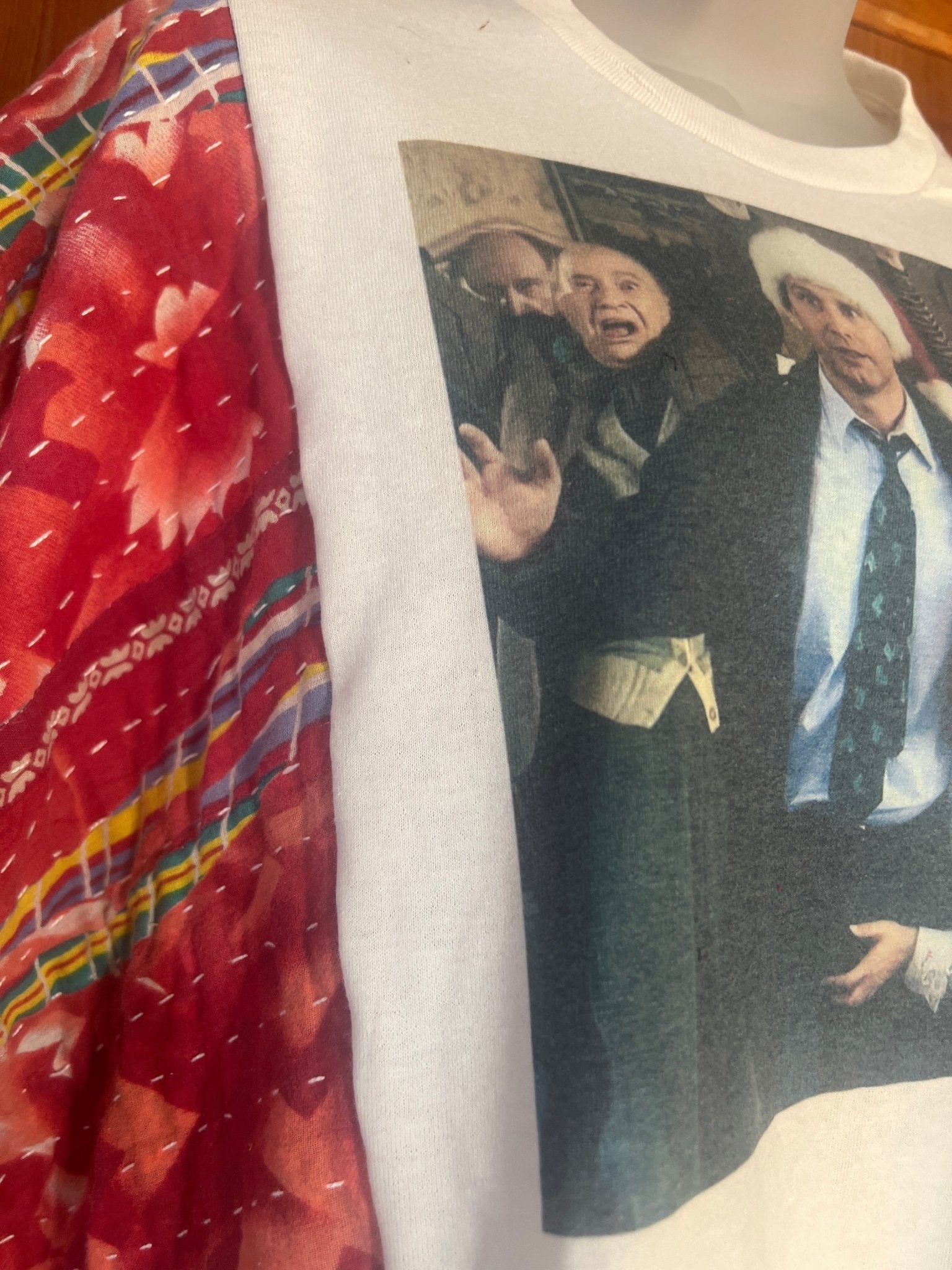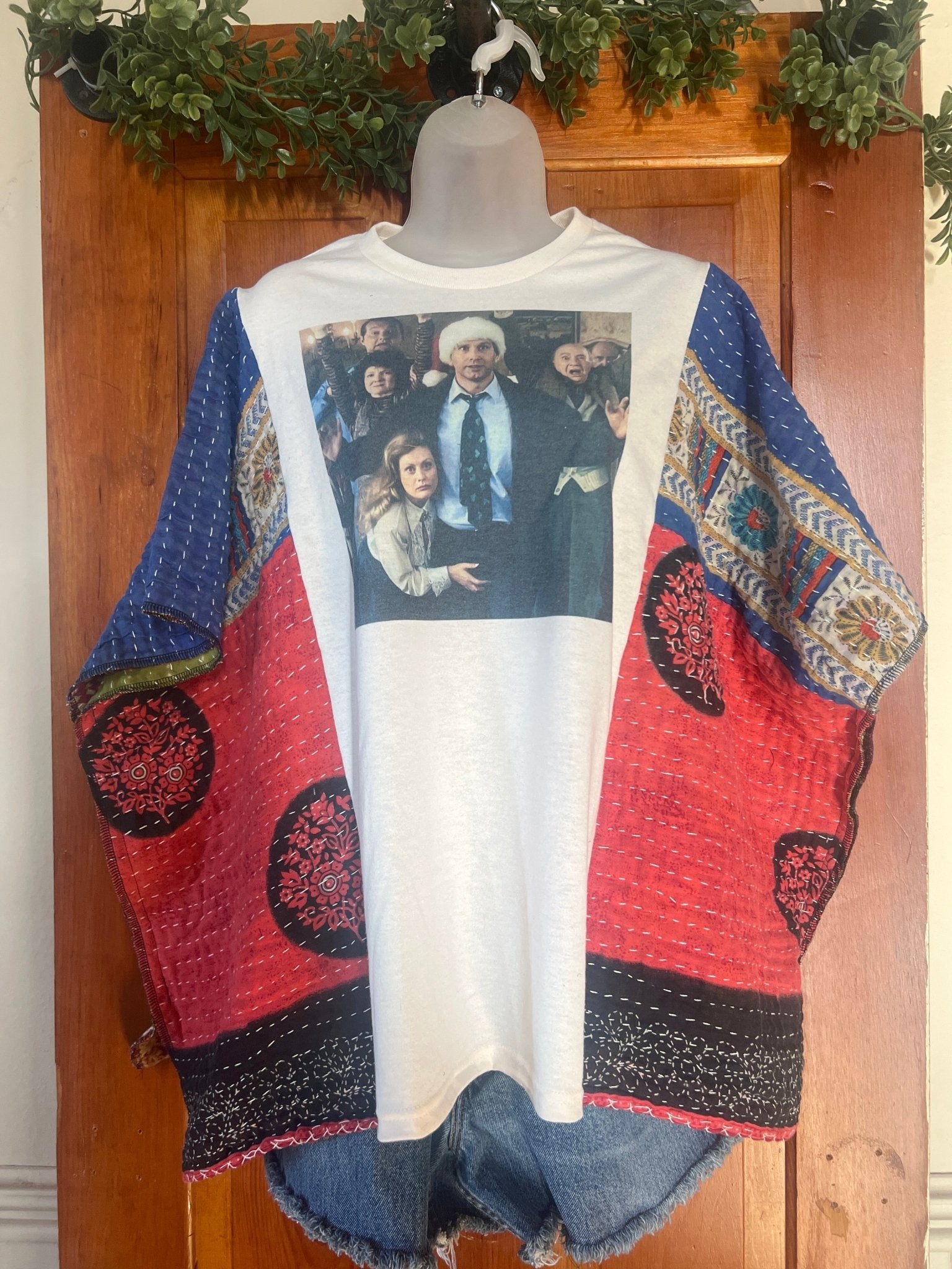 Upgrade your wardrobe with this tee featuring a fun snapshot from one of our favorite classic movies now transformed into an eco-friendly kantha poncho for all your Seasonal wear. Versatility at its finest, this piece goes great with jeans or leggings-letting you express your unique style... We consider our poncho sizes as "free size"-easily fitting up to 2X-3X!