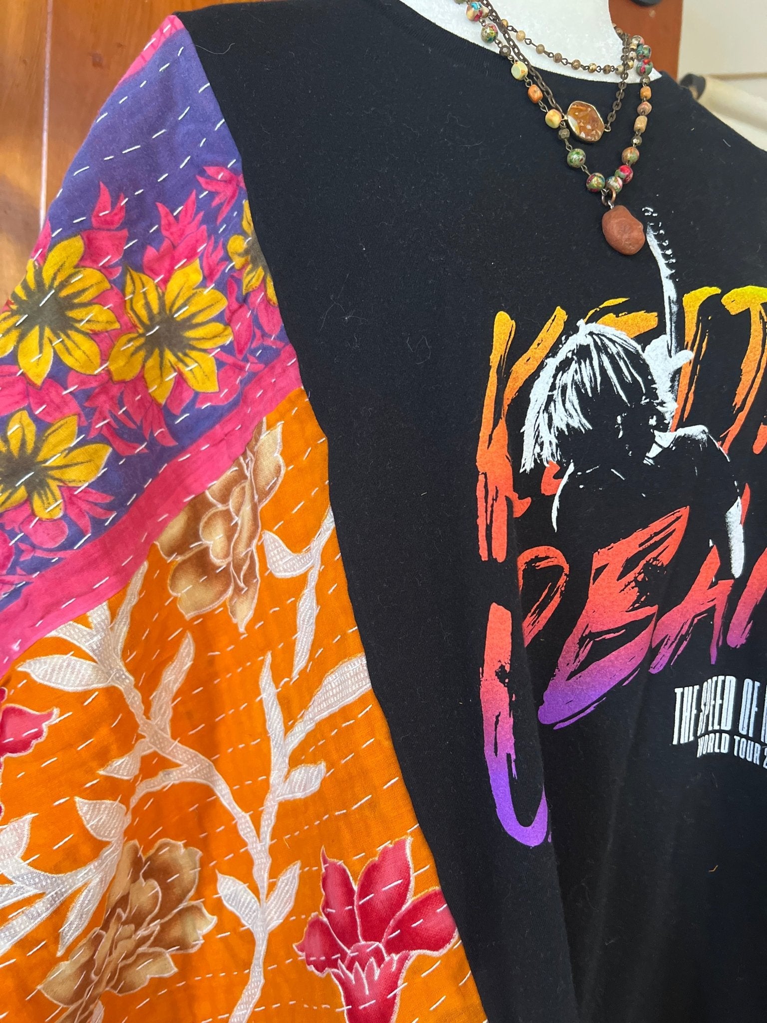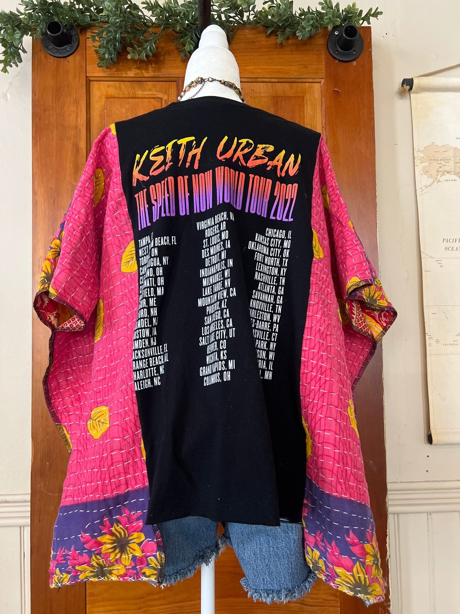 The KEITH URBAN Kantha Poncho is a unique, eco-friendly garment crafted from upcycled band tees. Designed for versatility, it comfortably fits sizes up to 2X making it suitable for various occasions, from concerts to casual outings. Pair it effortlessly with jeans or shorts for a distinctive look!