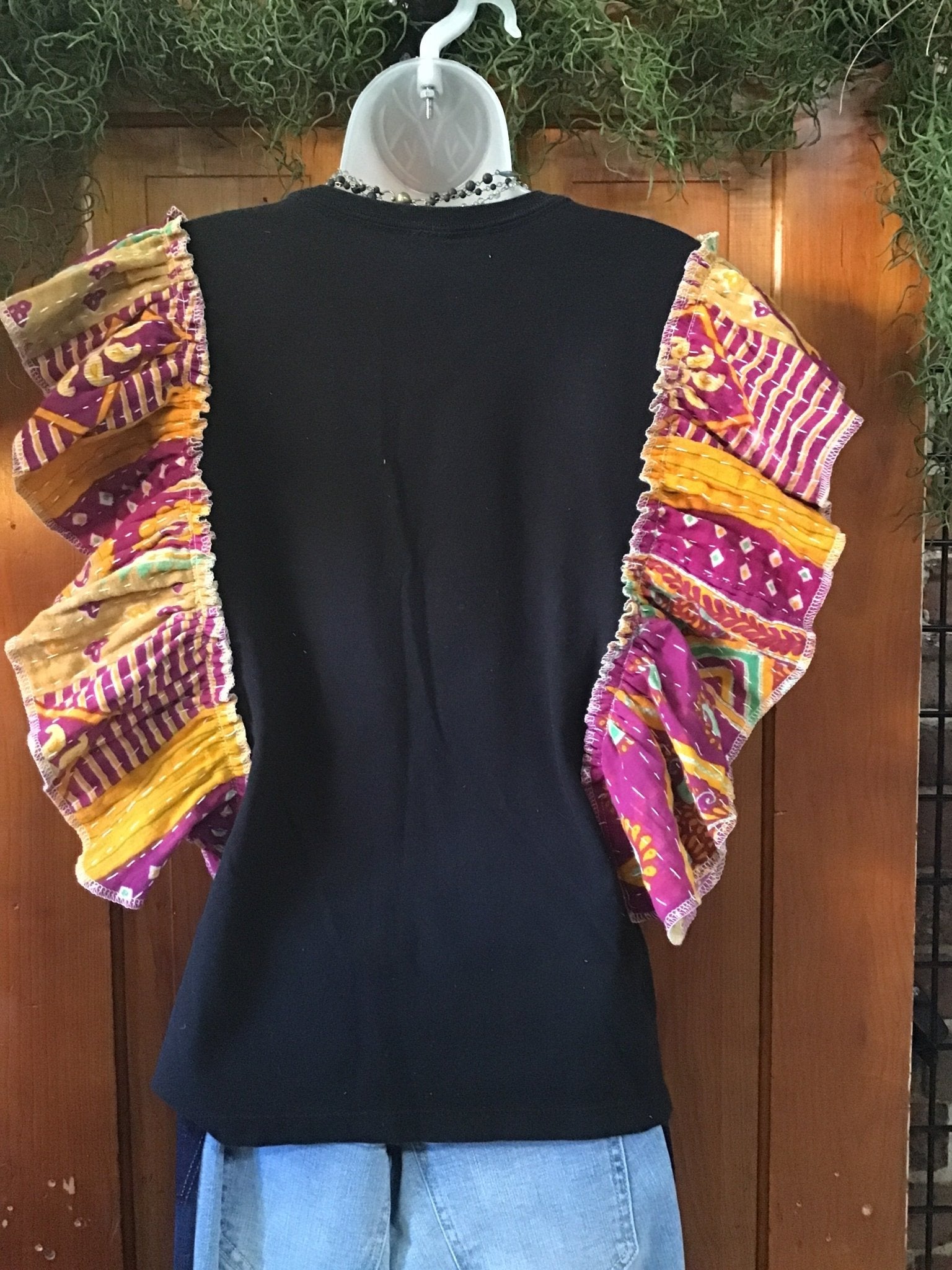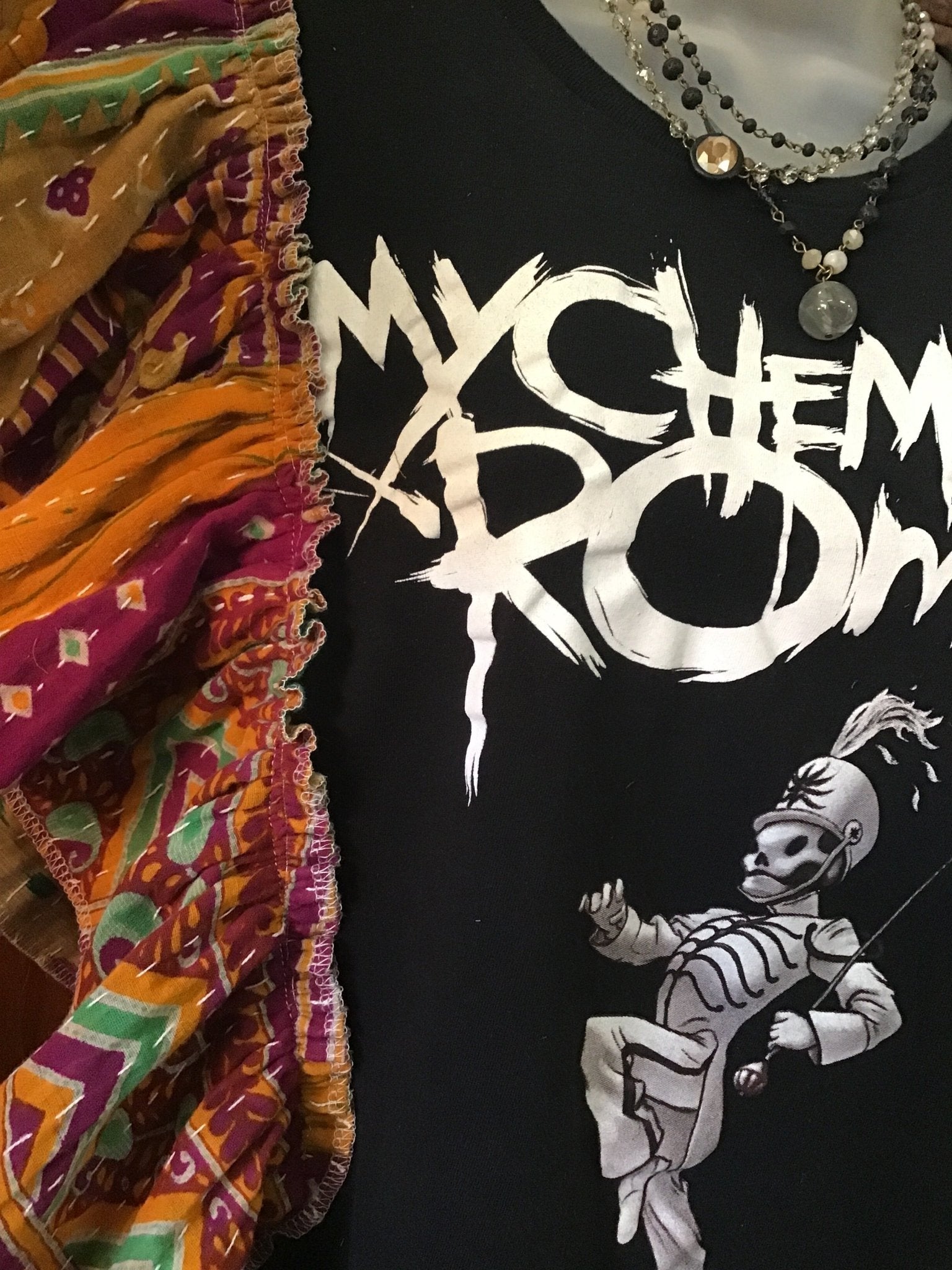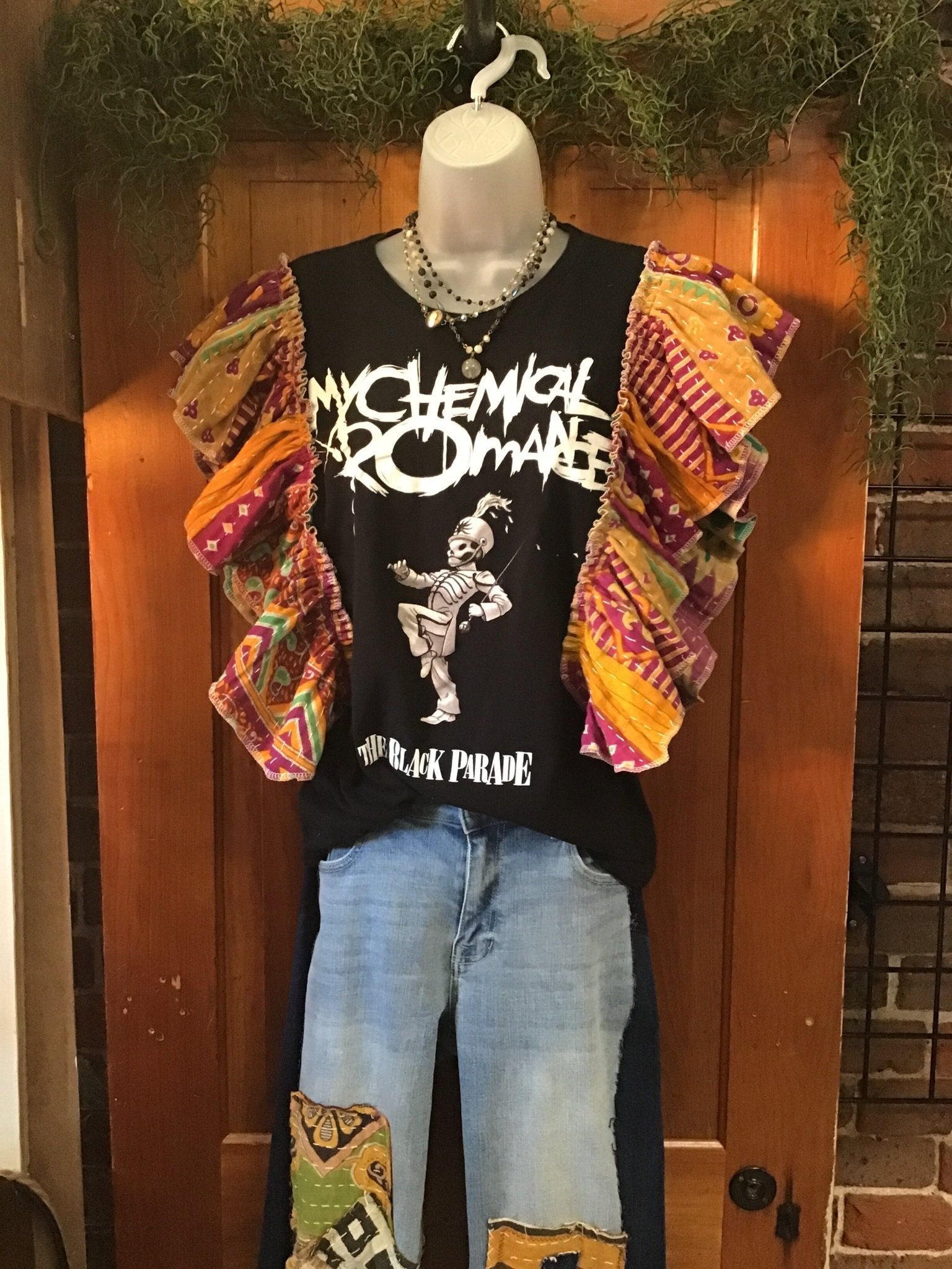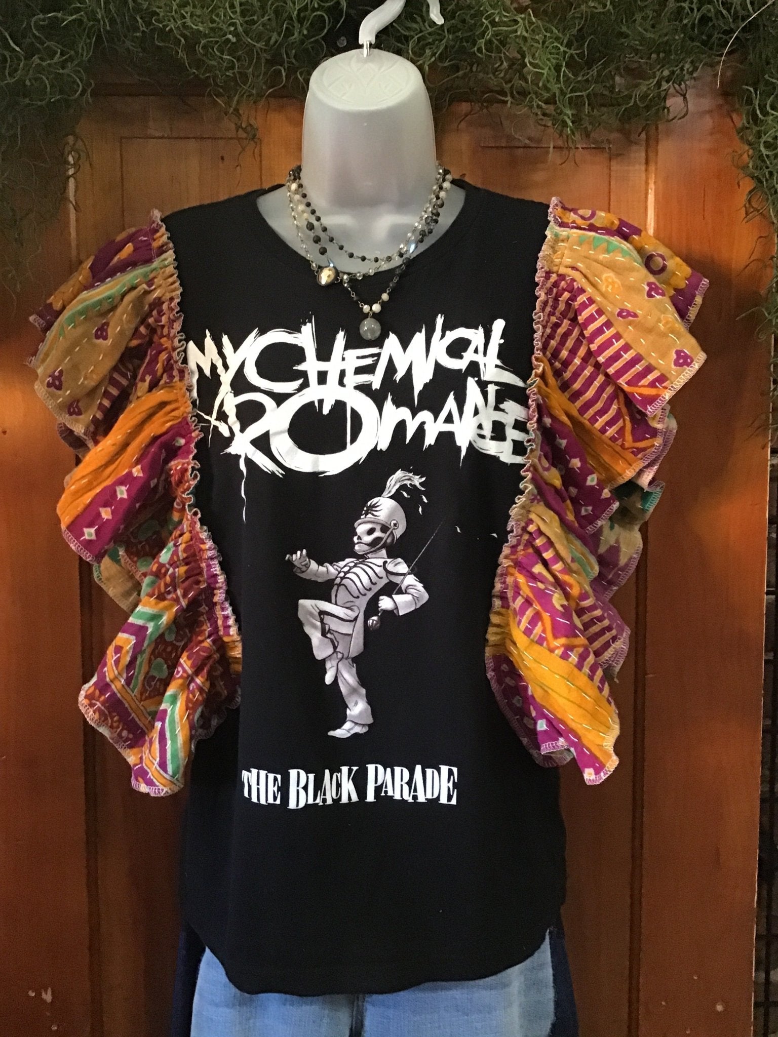 This black My Chemical Romance graphic tee will surely make you smile ... The sounds of My Chemical Romance pair well with jeans or cutoffs for your next music festival or concert! This eco-friendly, sustainable statement piece is created from upcycled Kantha quilts -this unique band tee is one of a kind! The tag in the tee is illegible. Check the measurements - probably a small/medium-ish... The tshirt sleeves were cut off (raw edge) and the kantha edges have been serger finished.. We recommend you compare your best-fitting t-shirt measurements with the measurements below: