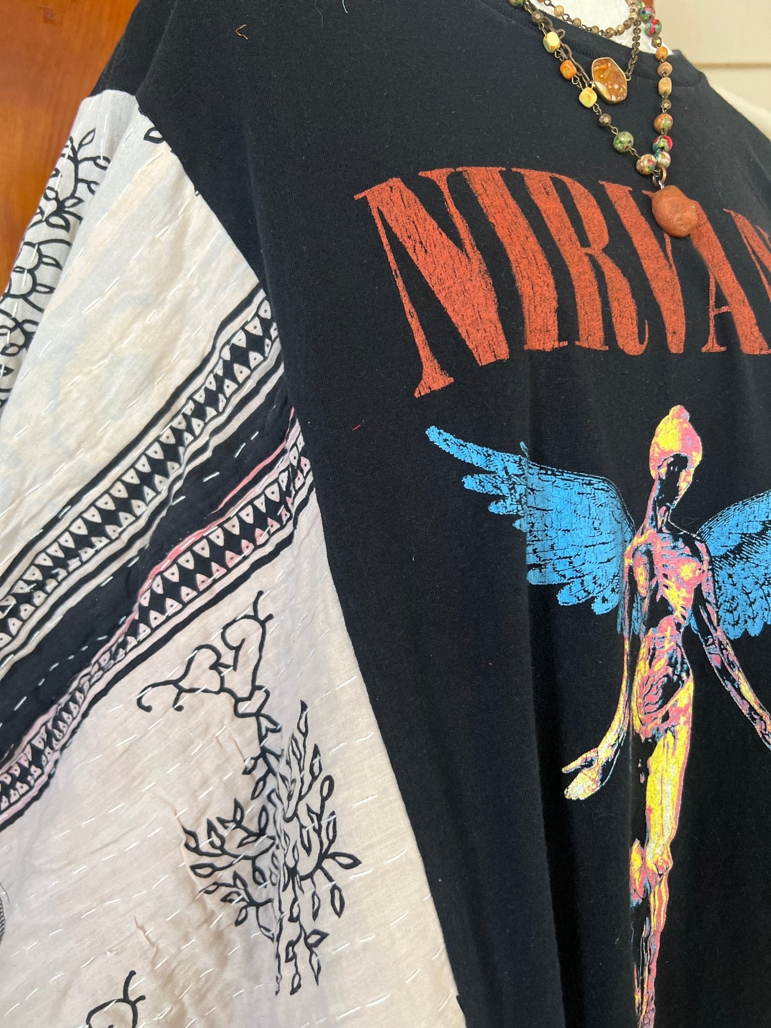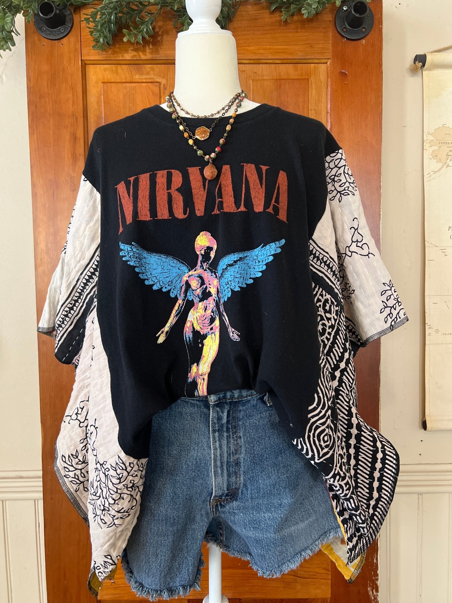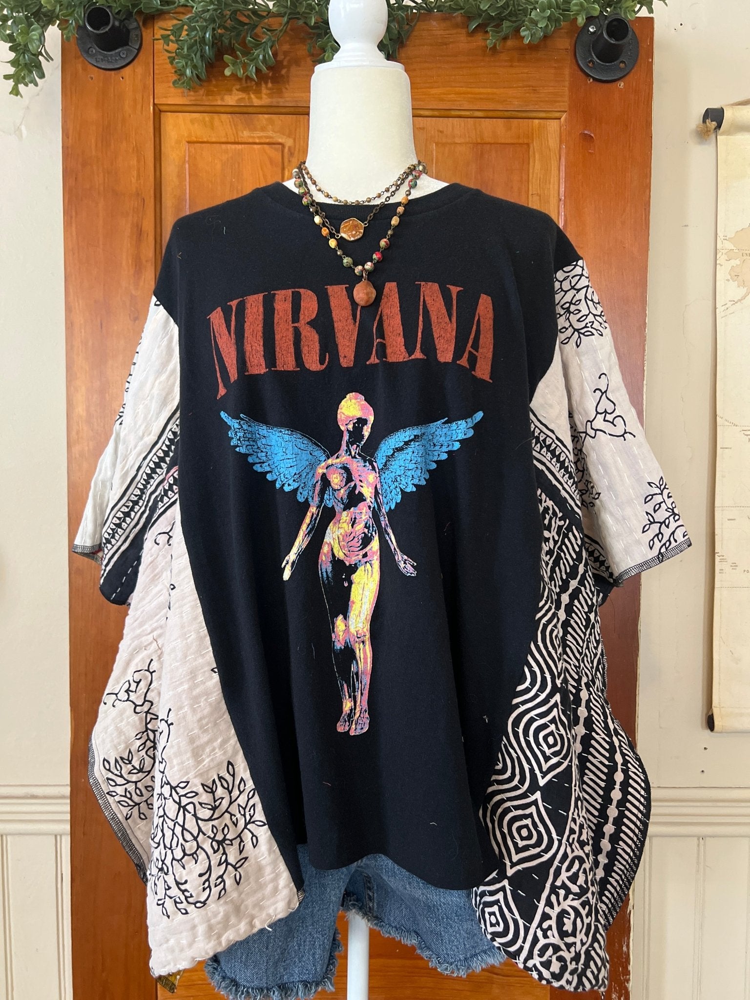 The NIRVANA Kantha Poncho is a unique, eco-friendly garment crafted from upcycled band tees. Designed for versatility, it comfortably fits sizes up to 2X making it suitable for various occasions, from concerts to casual outings. Pair it effortlessly with jeans or shorts for a distinctive look!