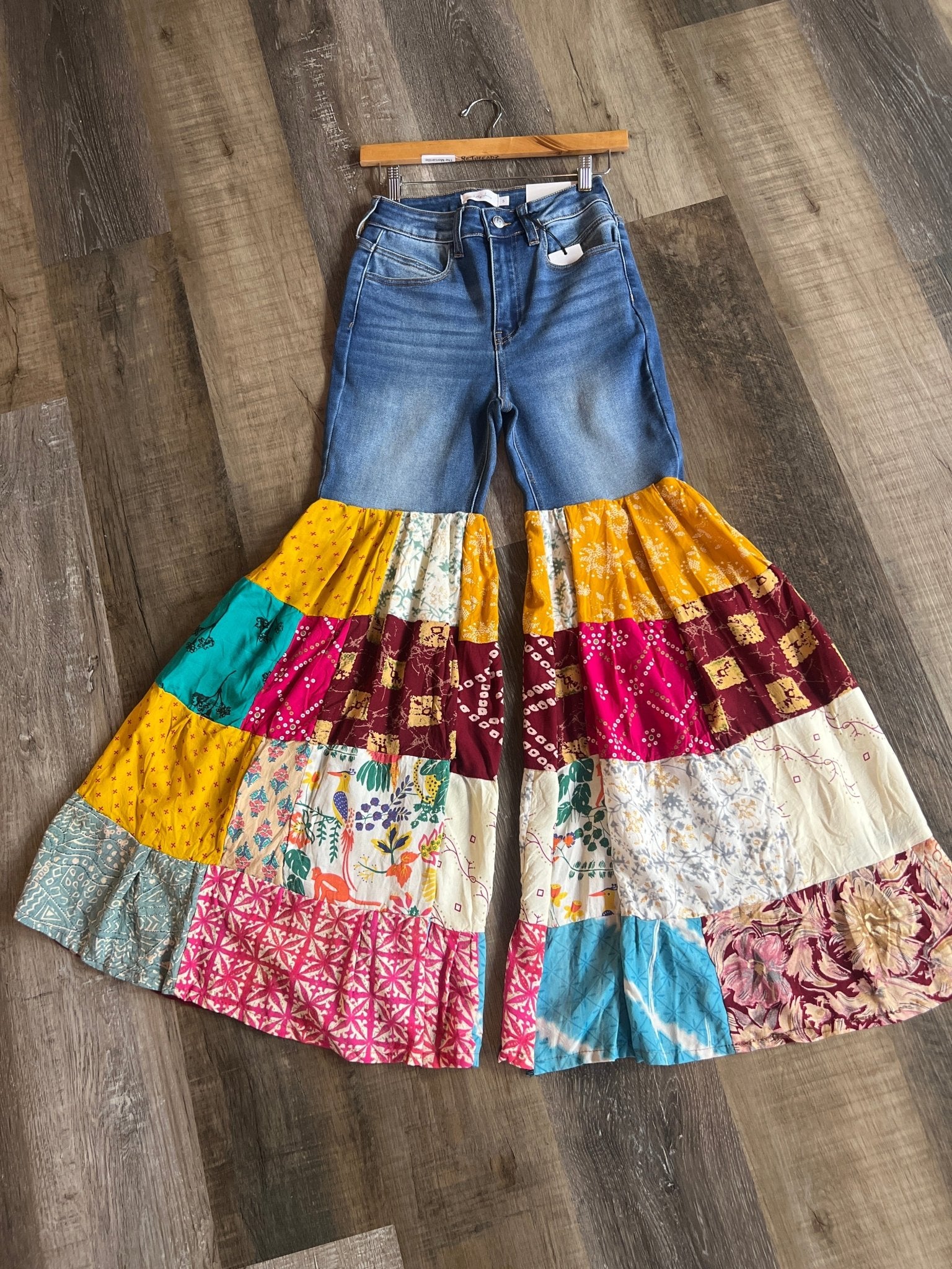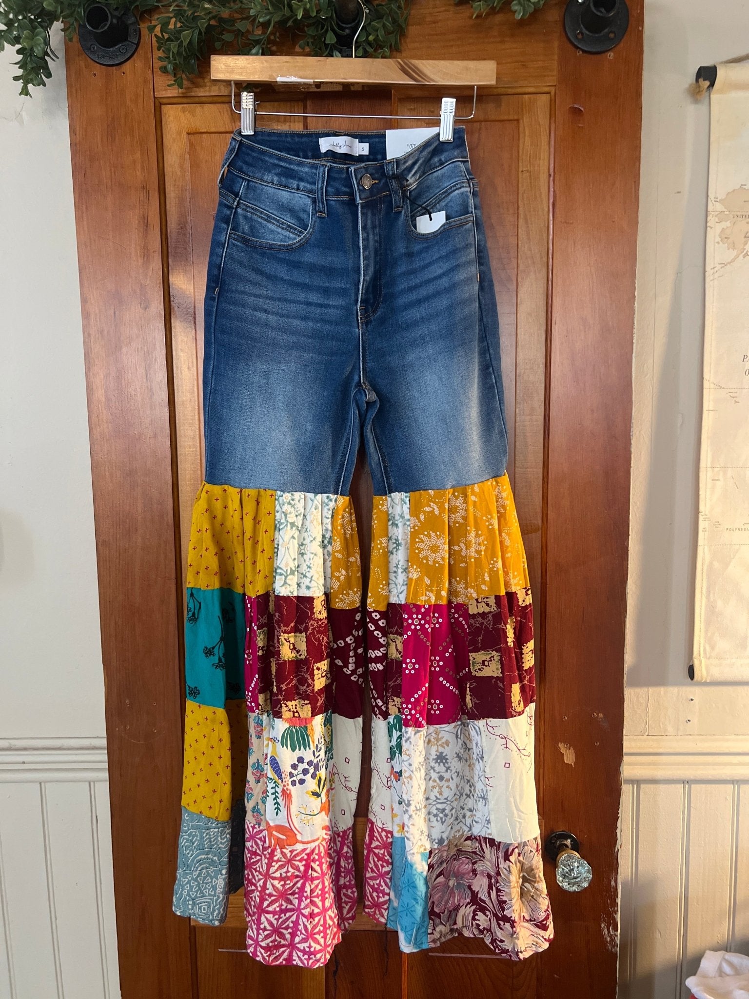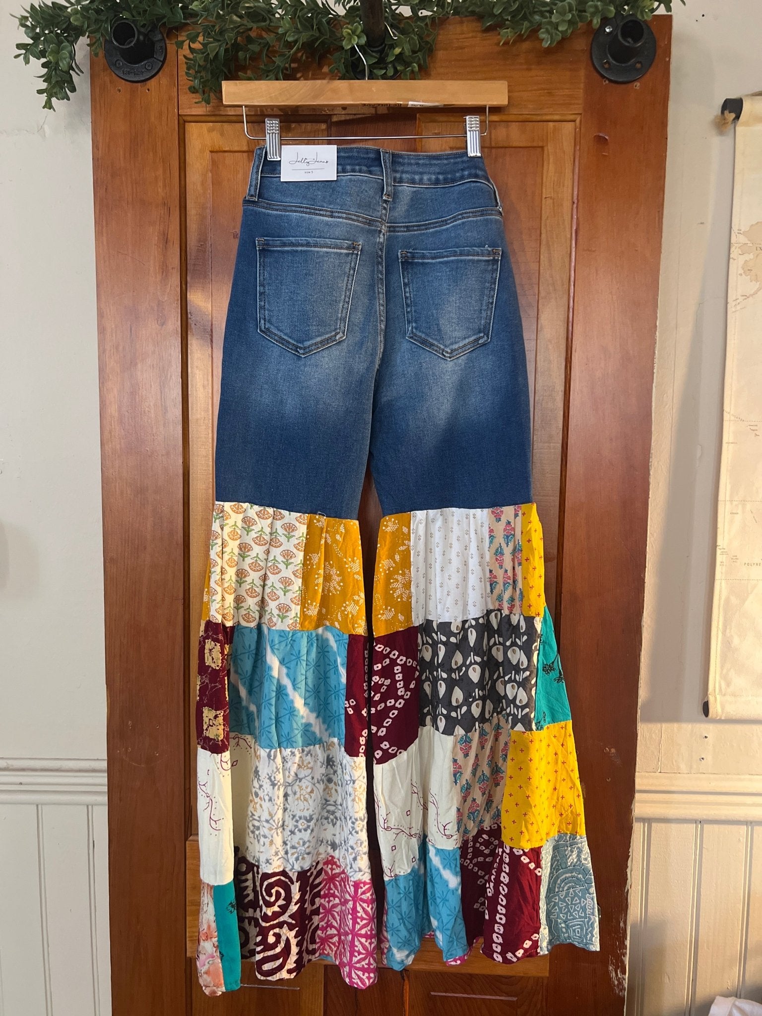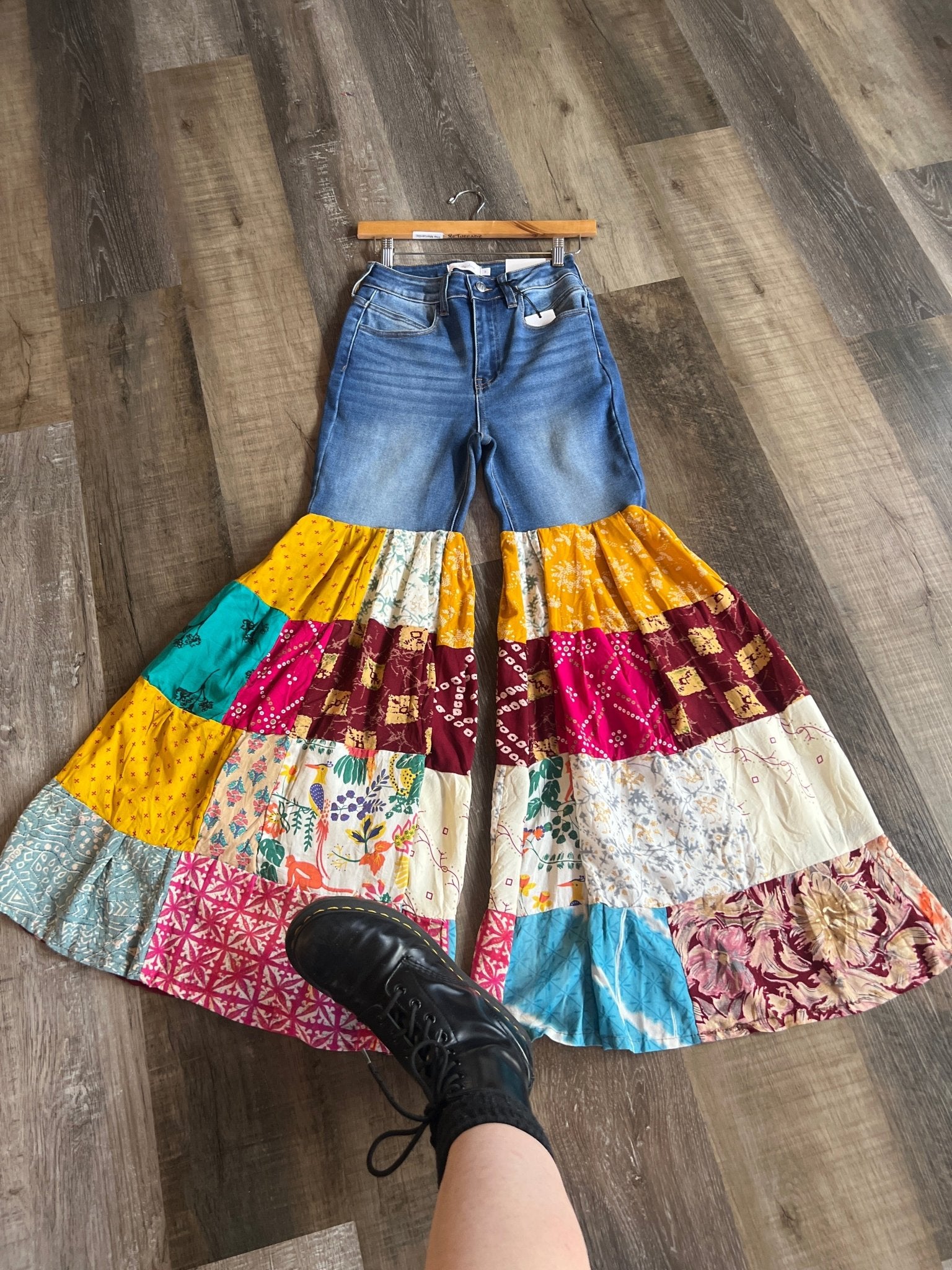 Giving all the hippie vibes! We love denim, patchwork, and flared jeans— this piece checks all the boxes. These can literally be dressed up or down to be worn with a tee, sweater, blazer, or whatever you’re feeling! We upcycled a new pair of jeans using patchwork- all rayon. Hand wash to ensure no shrinkage. These are a size 5 but do seem to run small. We can hem these at no extra charge if they are too long for ya! Check exact measurements below and compare to your best fitting jeans.