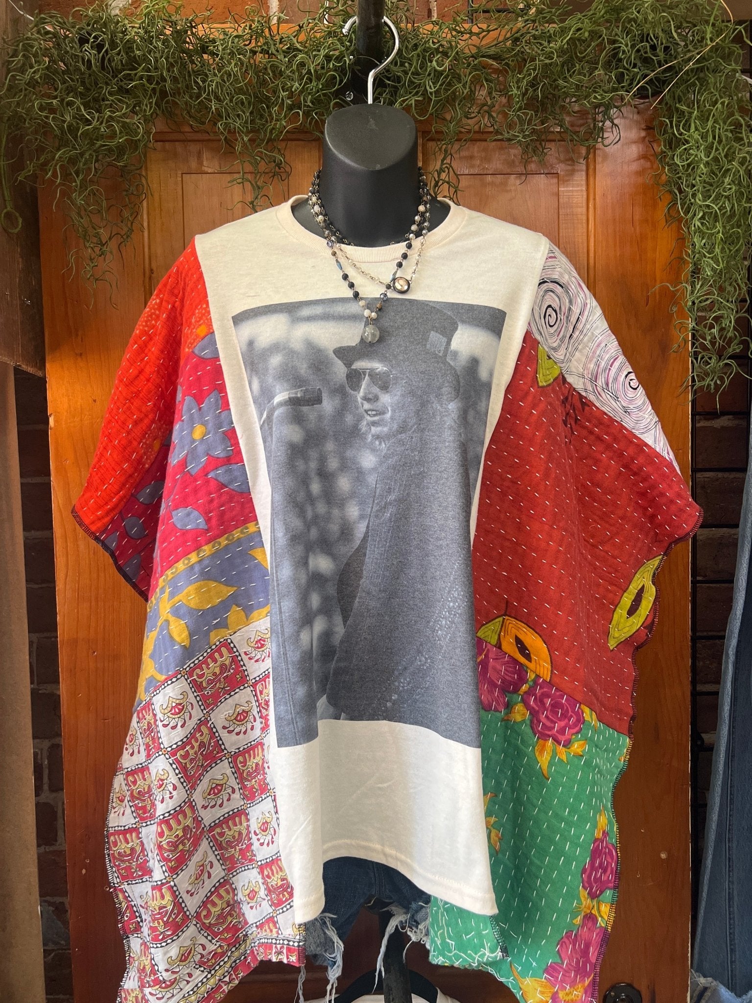 Upgrade your wardrobe with this one-of-a-kind, upcycled Tom Petty tee now transformed into an eco-friendly multi-pattern kantha poncho for concerts or everyday wear. Versatility at its finest, this piece goes great with jeans or shorts, letting you express your unique style... We consider our poncho sizes as "free size"-easily fitting up to 2X-3X!