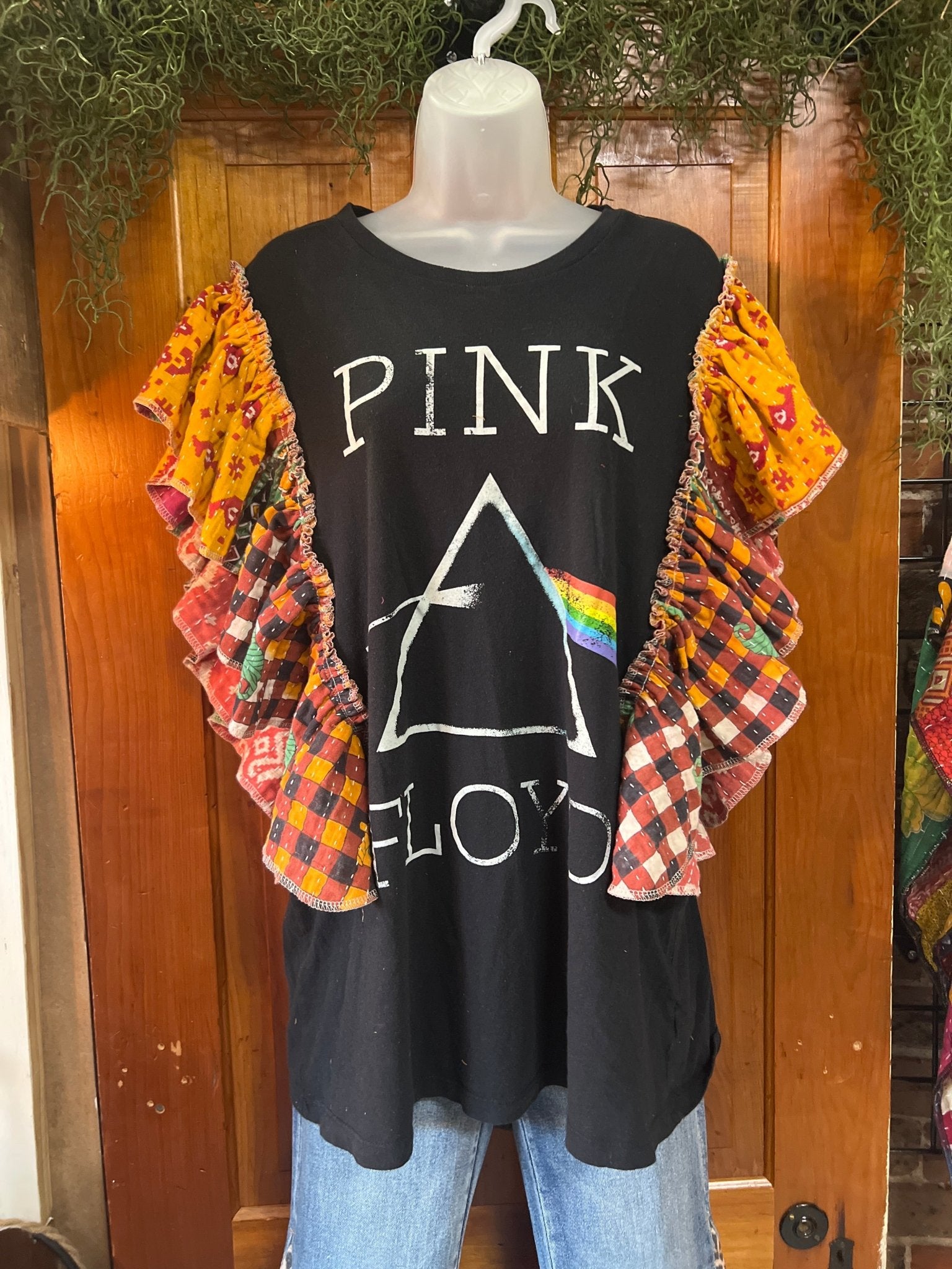 This black Pink Floyd graphic tee will surely make you smile ... The sounds of the pink floyd pair well with jeans or cutoffs for your next music festival or concert! This eco-friendly, sustainable statement piece is created from upcycled Kantha quilts -this unique band tee is one of a kind! The tag in the tee says XL... The tshirt sleeves were cut off (raw edge) and the kantha edges have been serger finished.. We recommend you compare your best-fitting t-shirt measurements with the measurements below: