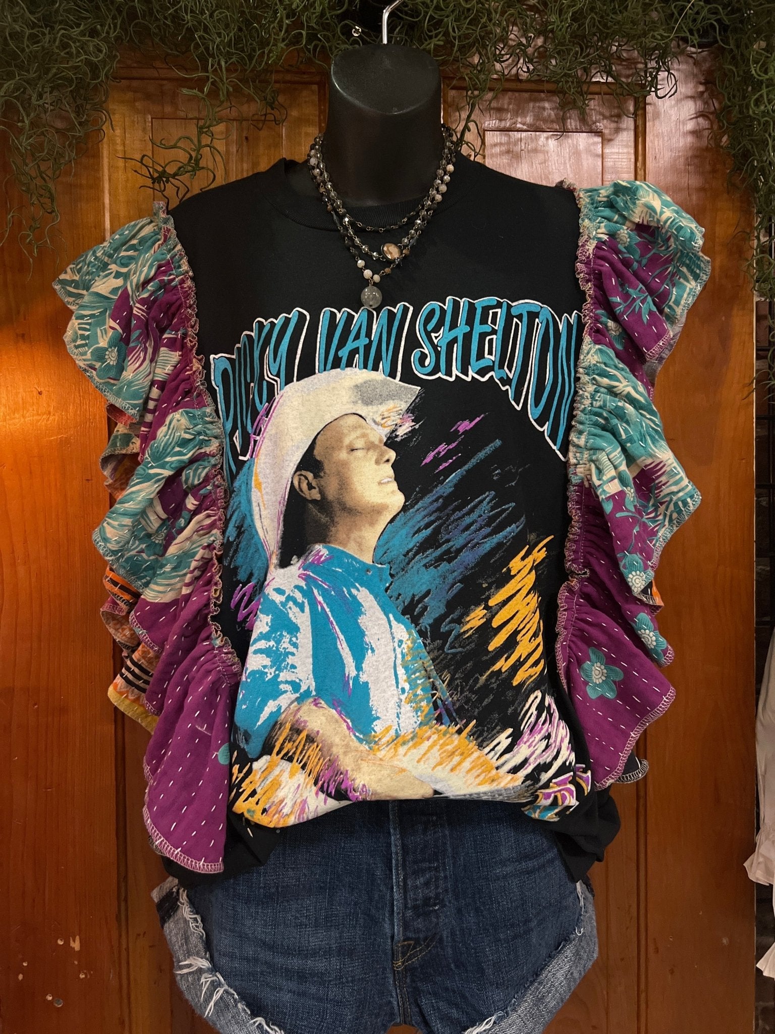 This Ricky Van Shelton graphic tee will surely make you smile ... The sounds of the Ricky pair well with jeans or cutoffs for your next music festival or concert! This eco-friendly, sustainable statement piece is created from upcycled Kantha quilts -this unique band tee is one of a kind! The tag in the tee says XL.. The tshirt sleeves were cut off (raw edge) and the kantha edges have been serger finished.. We recommend you compare your best-fitting t-shirt measurements with the measurements below: