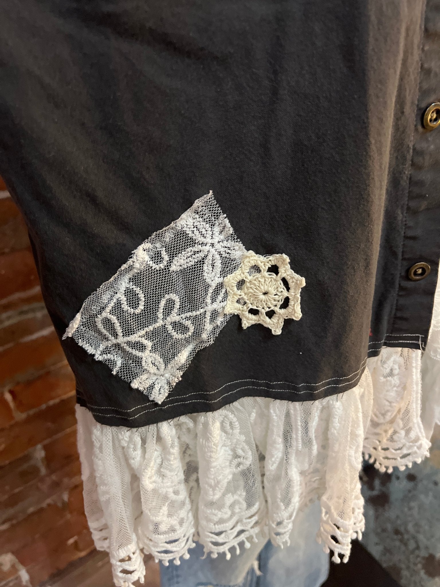 This one of a kind jacket began as a Men's Coleman over shirt in a size medium. We added tattered lace, crochet and doillies to create a this statement piece!!!