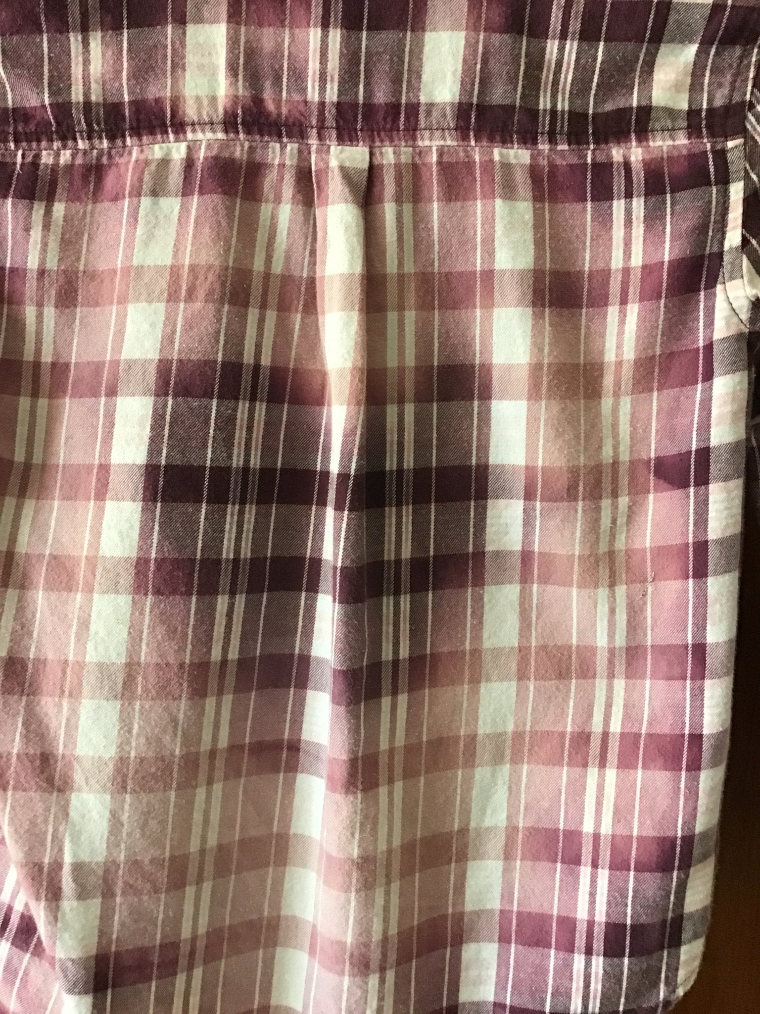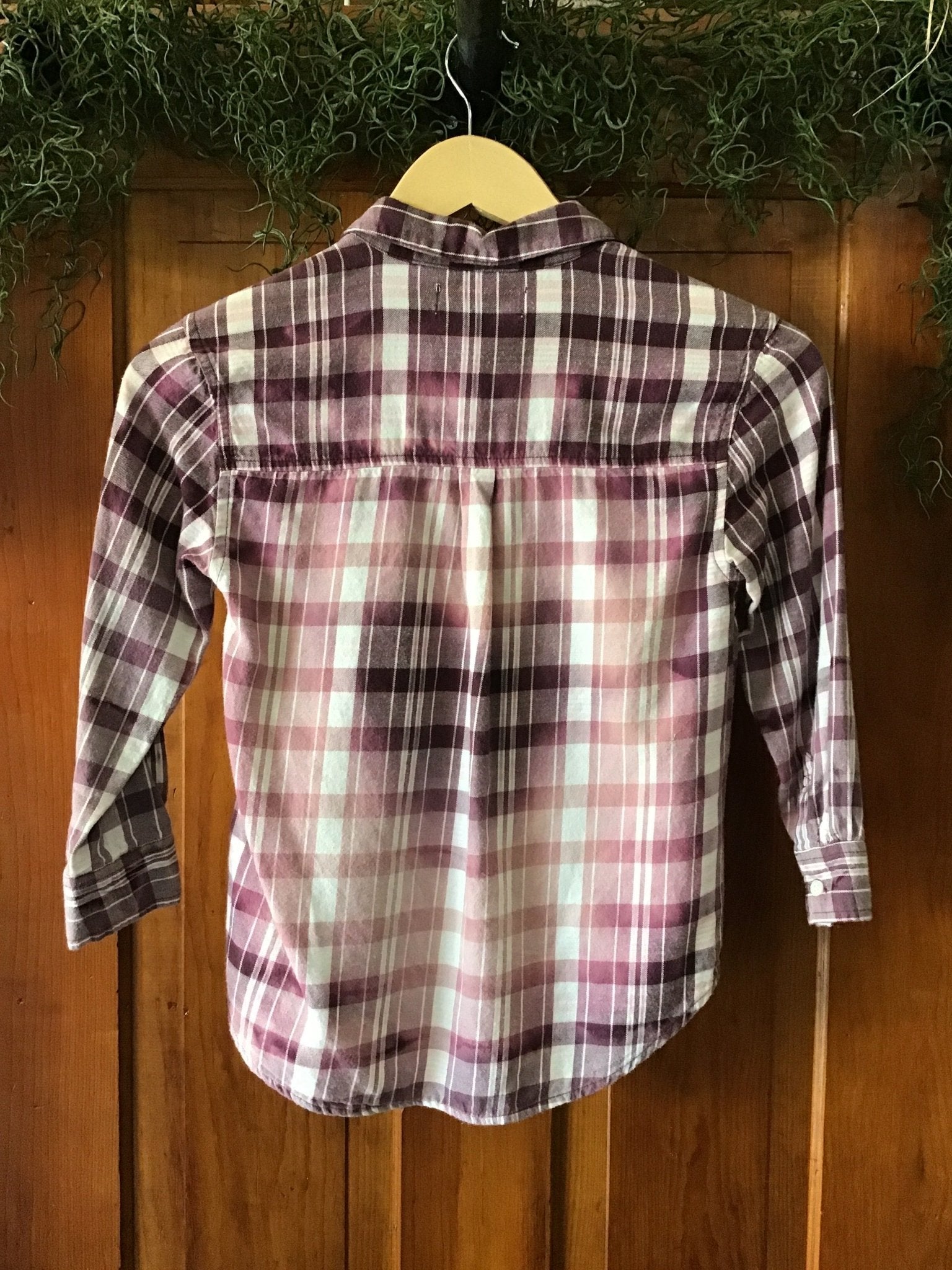 This one of a kind (OOAK) shirt/jacket began as a basic plaid flannel - Old Navy Brand, Girls Size S (6-7). 100% Cotton. Bleach used to give it a distressed look and heart shape on back.