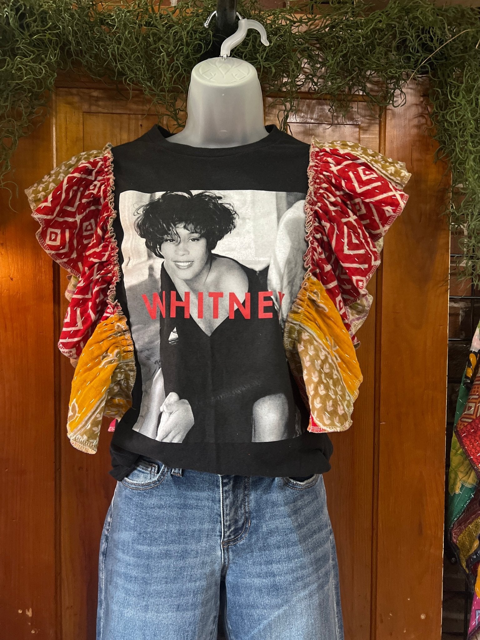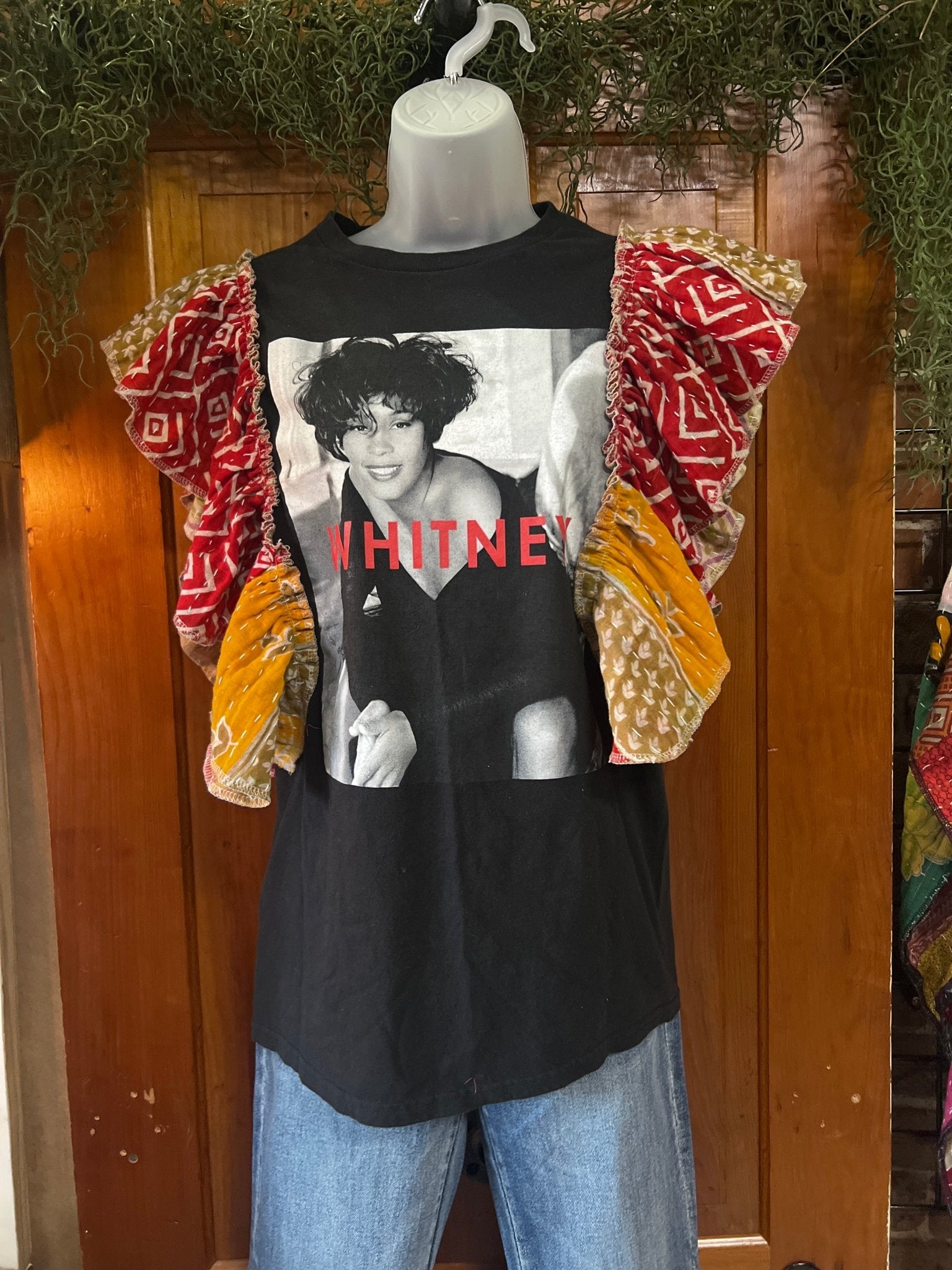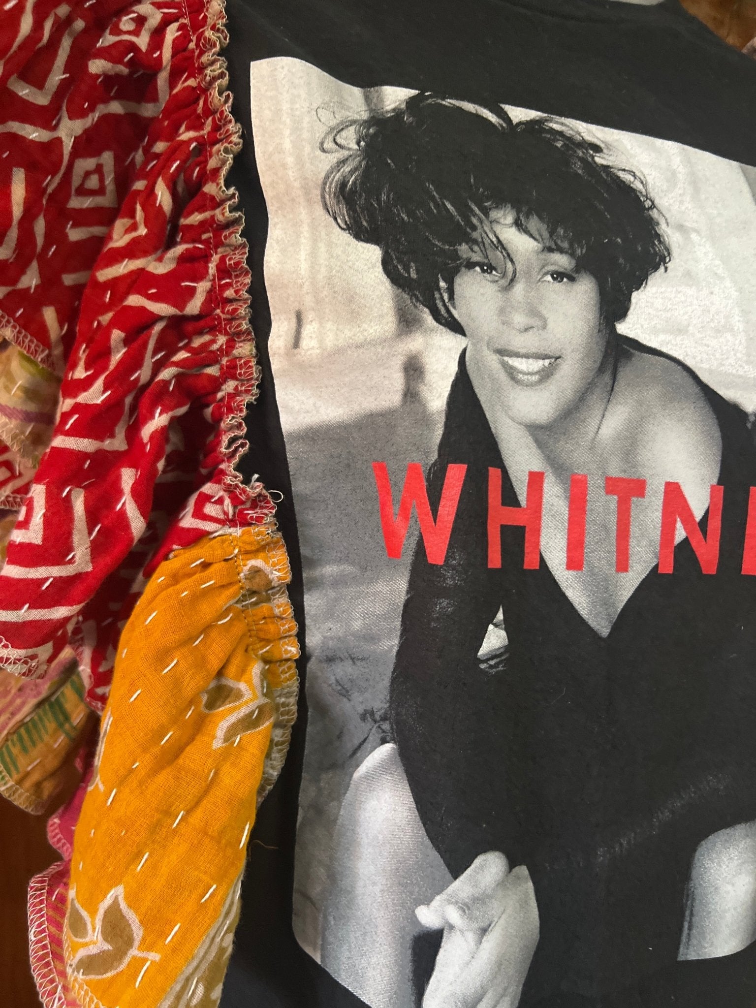 This black Whitney Houston graphic tee will surely make you smile ... The sounds of the Whitney pair well with jeans or cutoffs for your next music festival or concert! This eco-friendly, sustainable statement piece is created from upcycled Kantha quilts -this unique band tee is one of a kind! The tag in the tee says small..The tshirt sleeves were cut off (raw edge) and the kantha edges have been serger finished.. We recommend you compare your best-fitting t-shirt measurements with the measurements below: