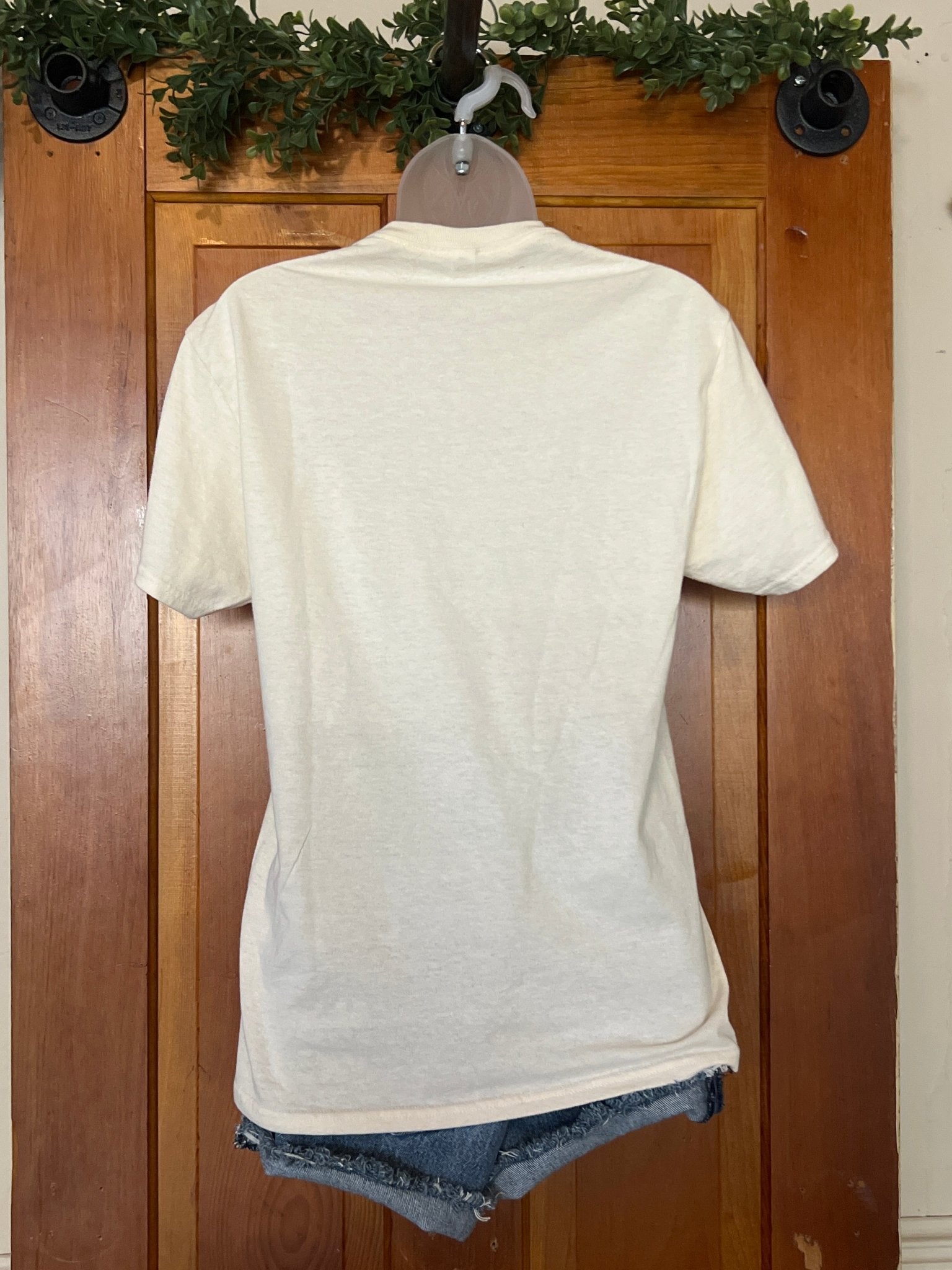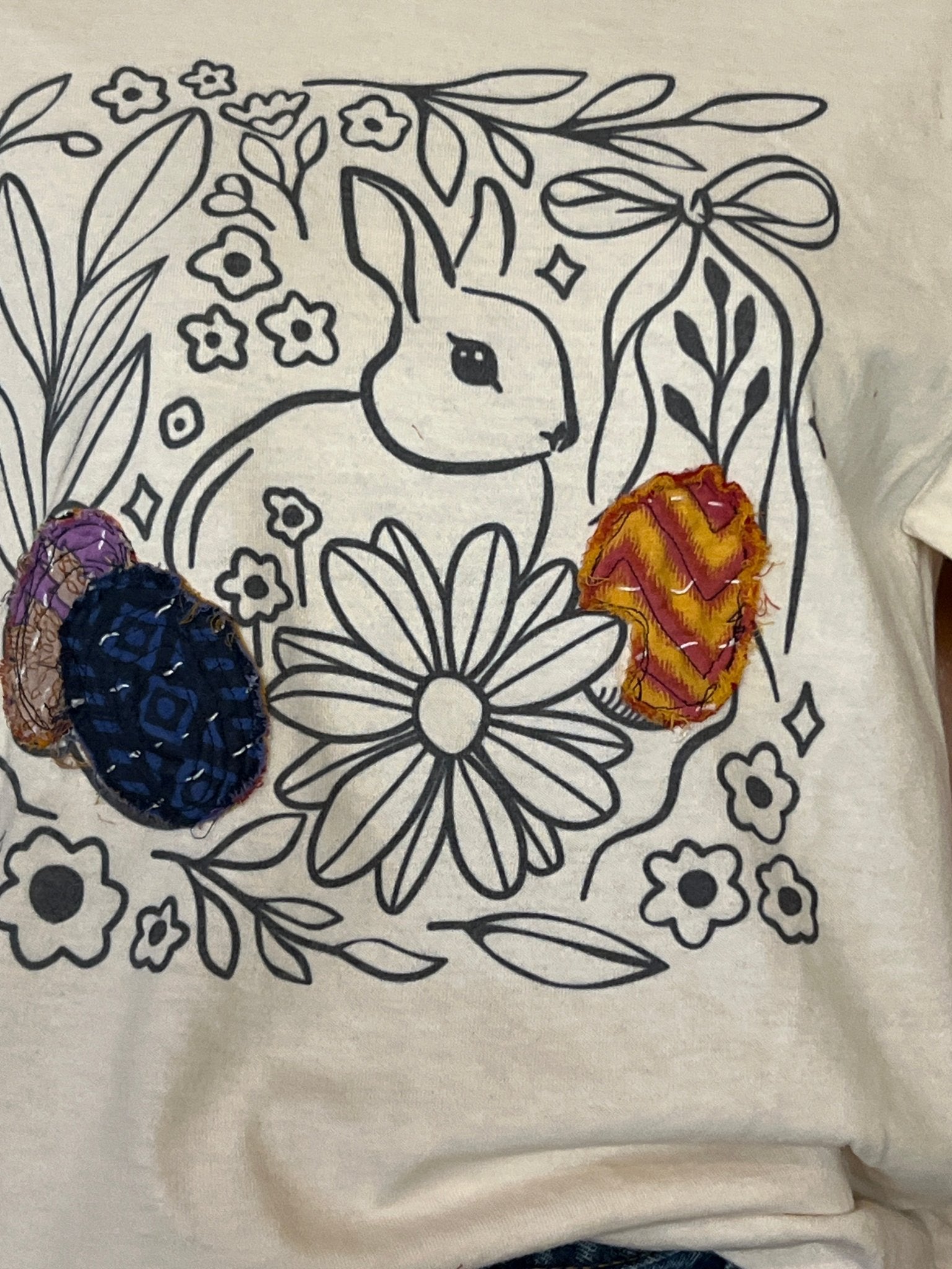 Beautiful sublimated image on a 50 poly/ 50 cotton off-white/cream-colored tee with kantha accents!!!