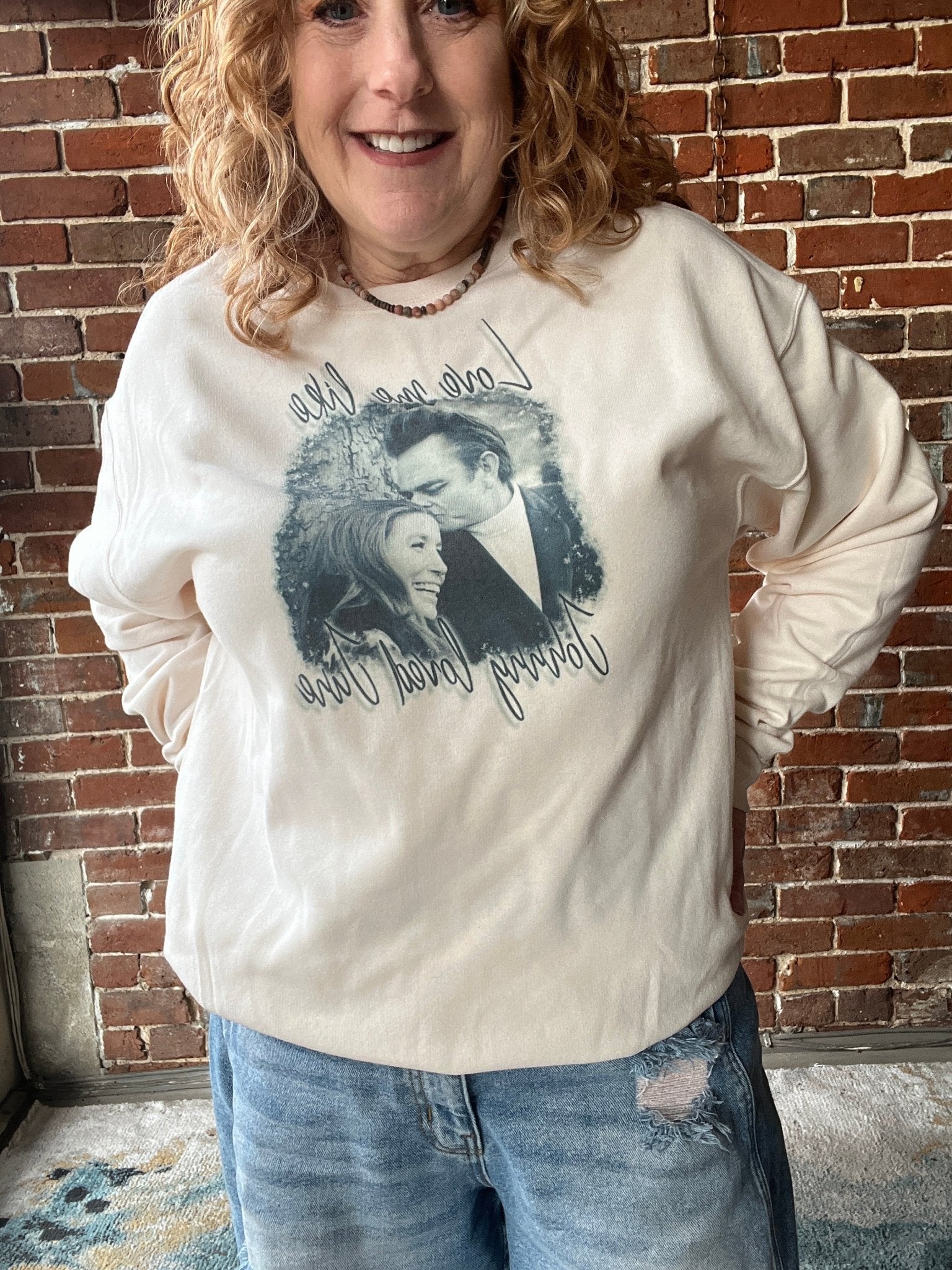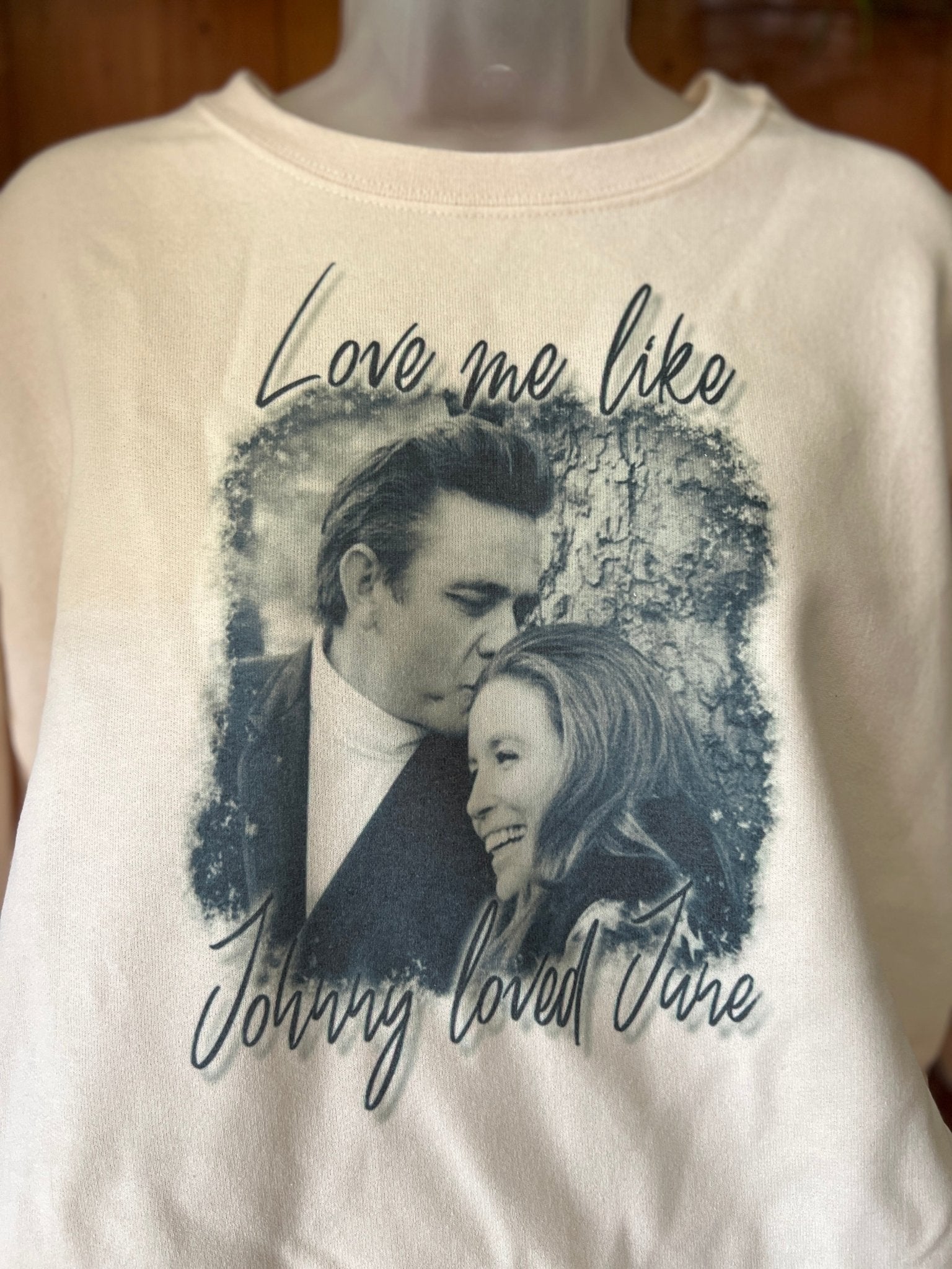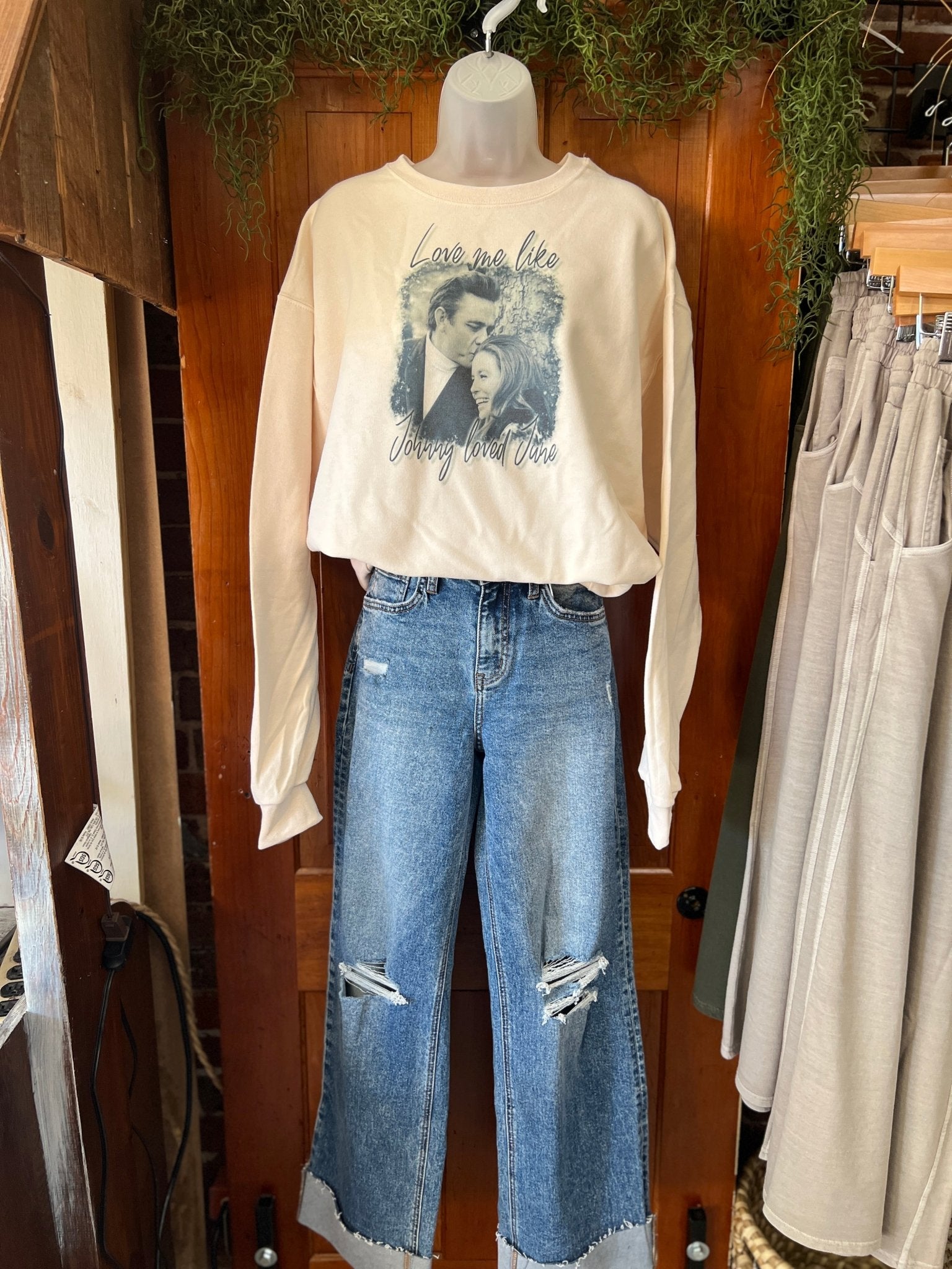 "Add a touch of playful charm and sentiment to your Valentine wardrobe with our "Love me like Johnny loved June" sweatshirt. This versatile sweatshirt pairs perfectly with any outfit, from camo or leopard to all the denim colors....