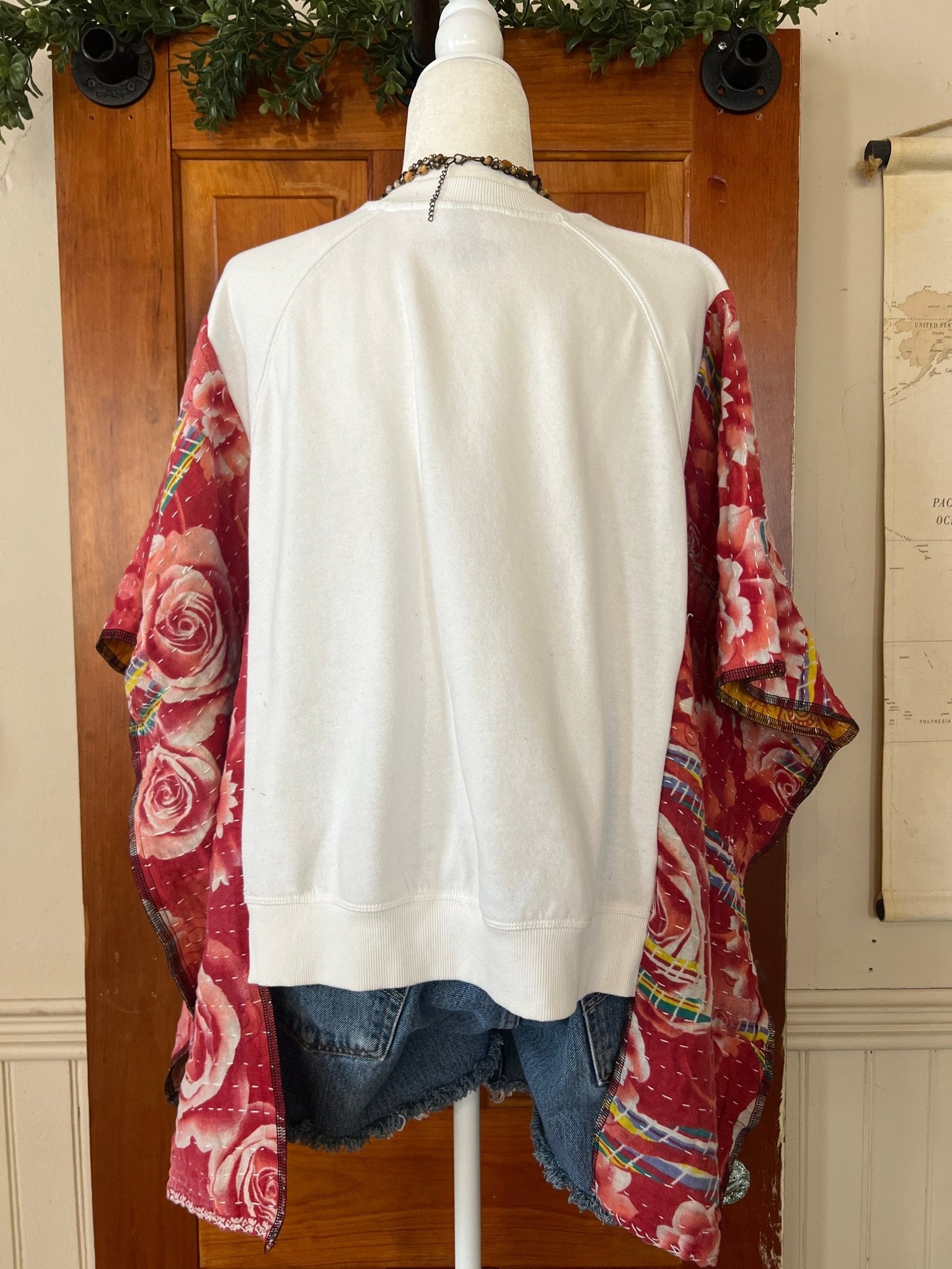 The KURT COBAIN sweatshirt Kantha Poncho is a unique, eco-friendly garment crafted from upcycled band tees. Designed for versatility, it comfortably fits sizes up to 2X making it suitable for various occasions, from concerts to casual outings. Pair it effortlessly with jeans or shorts for a distinctive look!