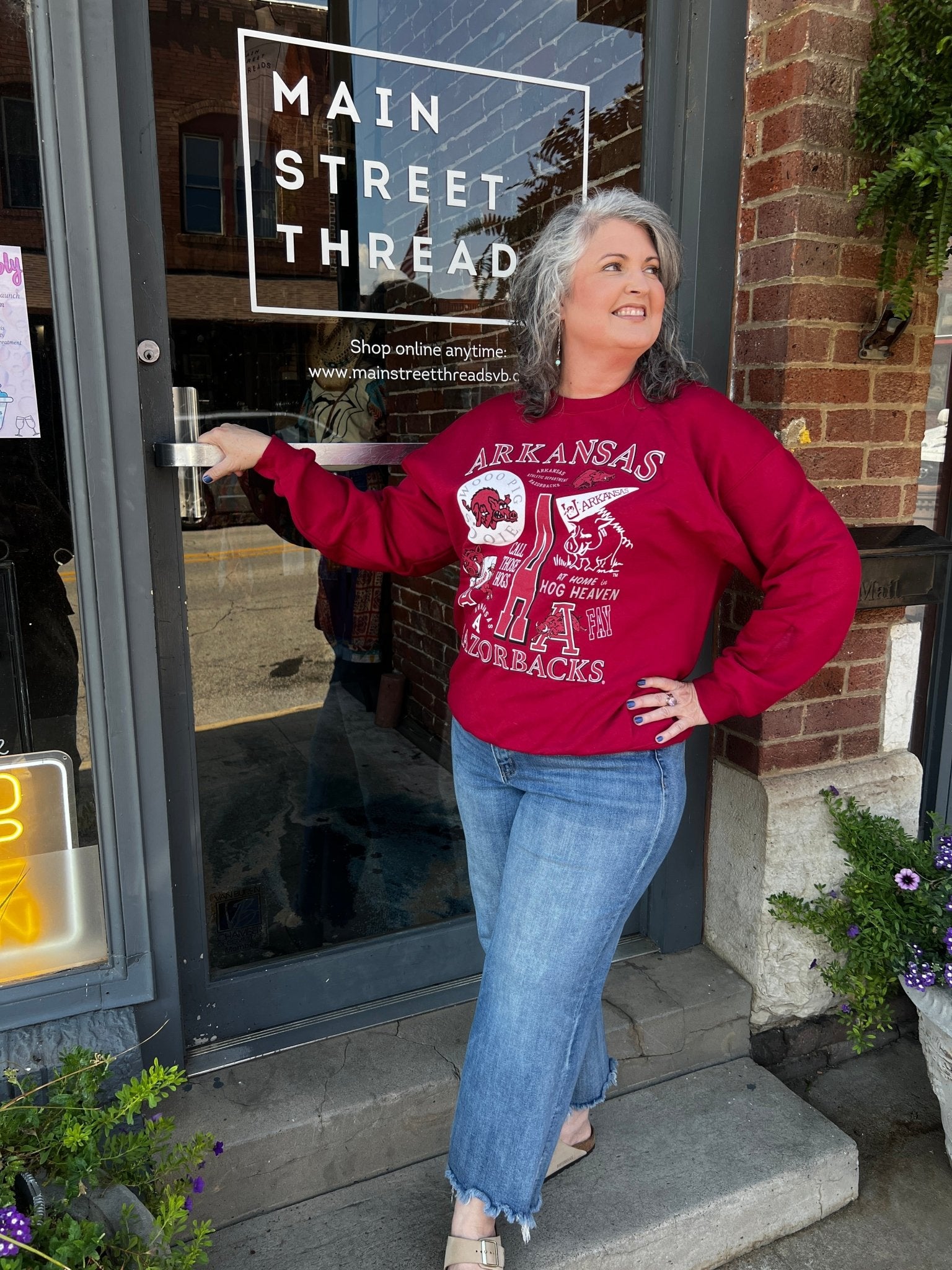From Southern Trend Clothing comes the Arkansas Razorbacks Collage, a screen-printed, unisex sweatshirt. Our brand, established in Fayetteville, Arkansas, is known for high-quality, fashionable apparel. This sweatshirt is designed to represent your love for the Razorbacks.