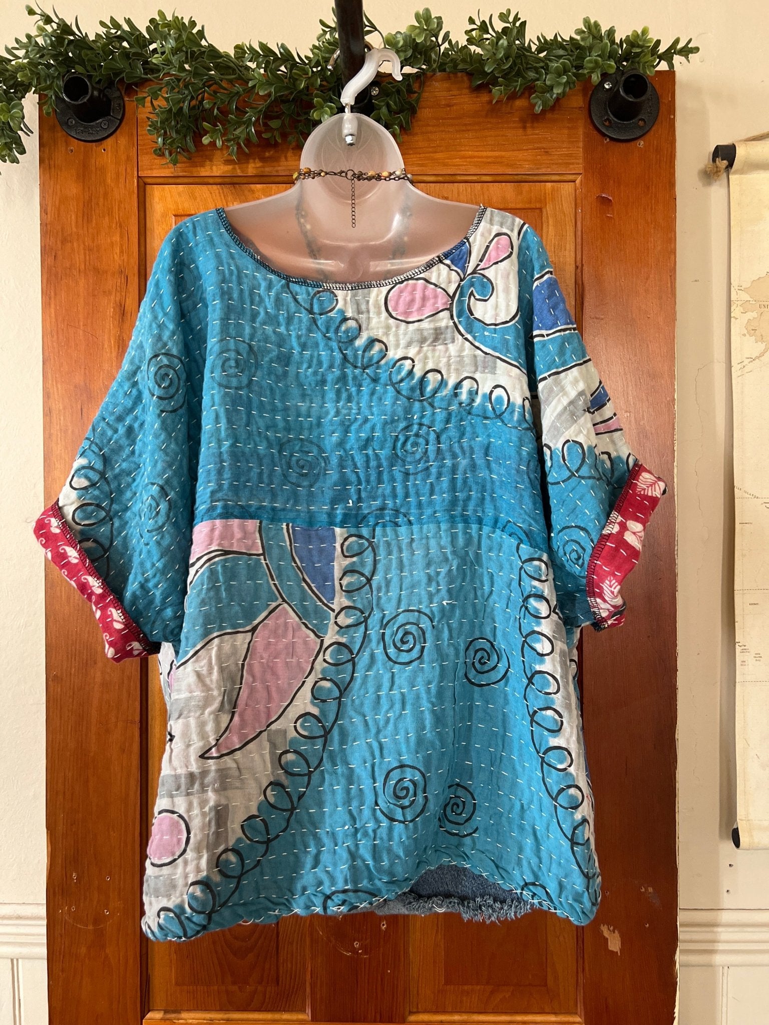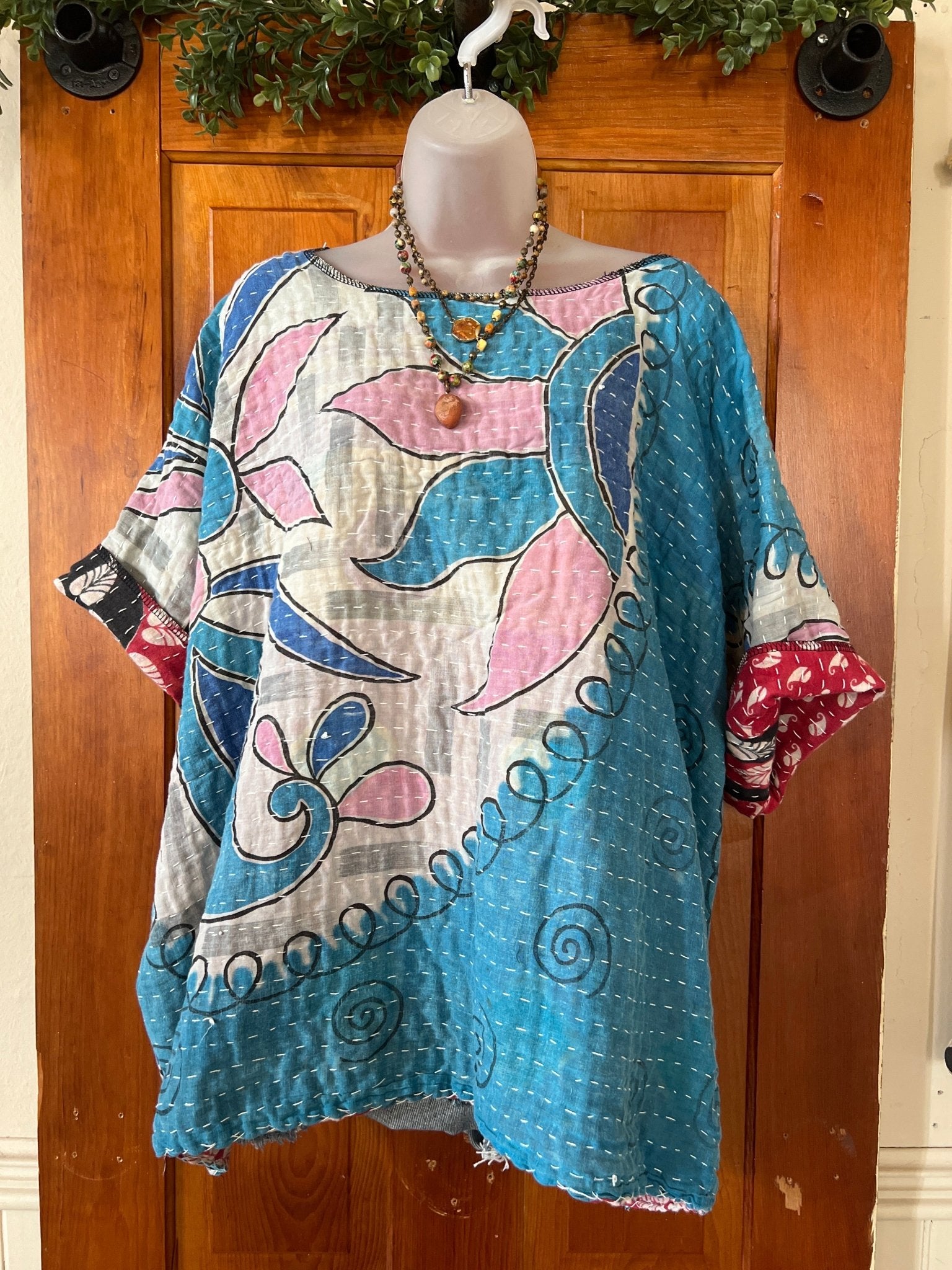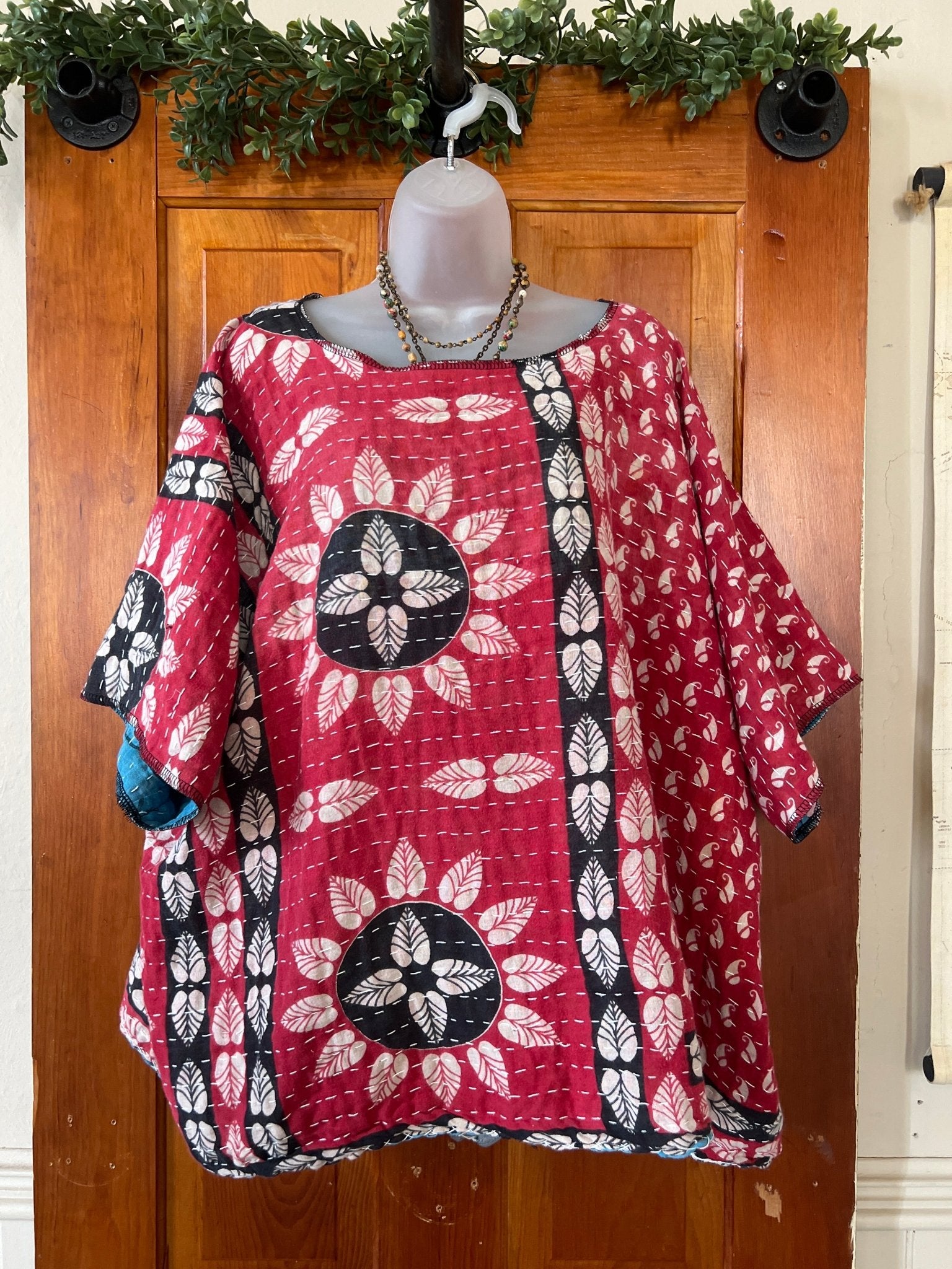 Get ready to LOVE this reversible kantha top-it's like TWO TOPS IN ONE!!! Perfect for pairing with cutoffs, jeans, linen pants and so many other possibilities-great for travel too-as it can be worn two entirely different ways! This eco-chic, planet-loving gem is crafted from upcycled Kantha quilts—talk about a one-of-a-kind treasure! The tag? There is no tag but we call it a free size (S-3X) with a wider neckline-but check the measurements!!! Just a friendly tip: peek at your fave oversized top measurements and compare them with the ones below!