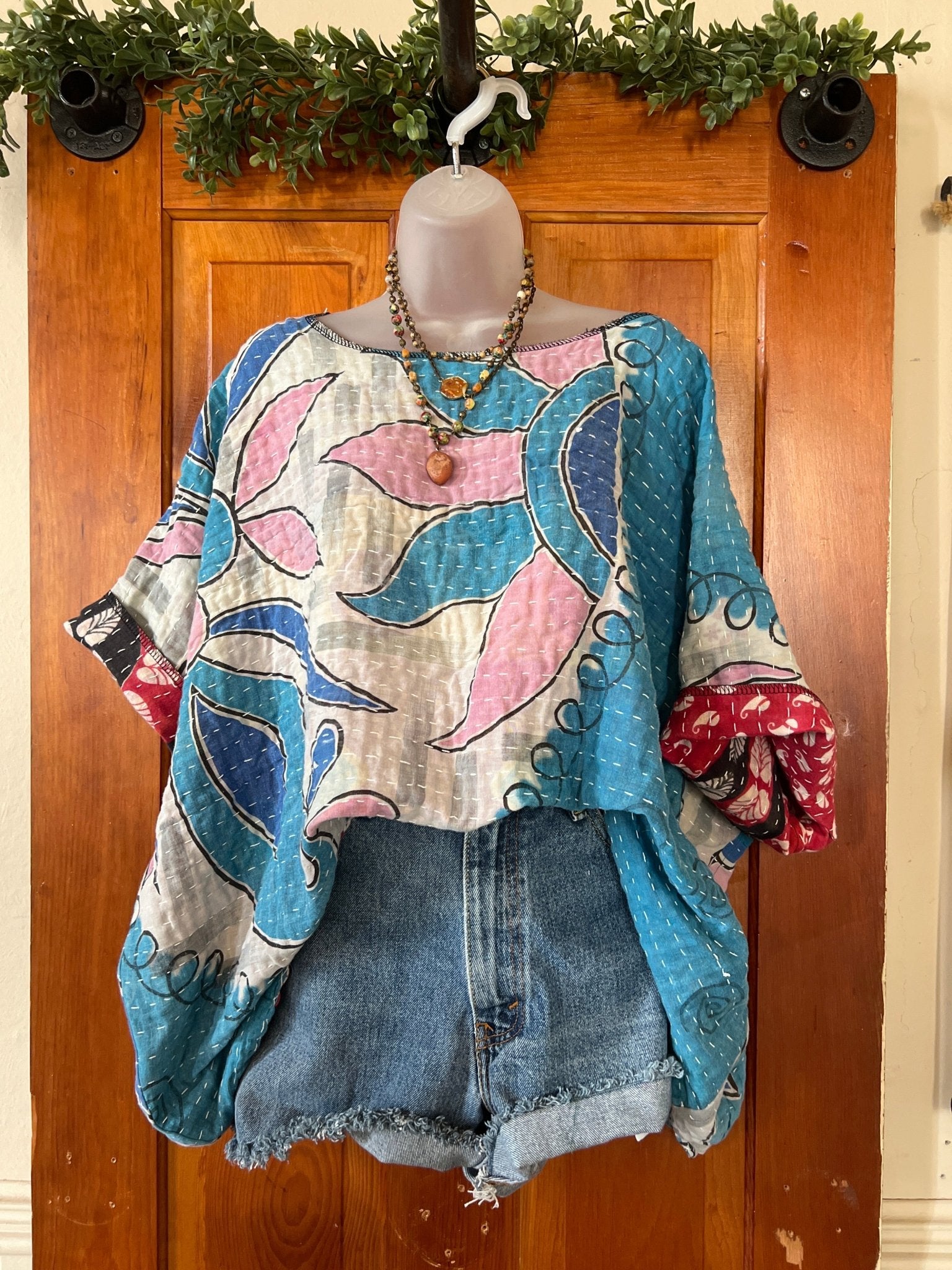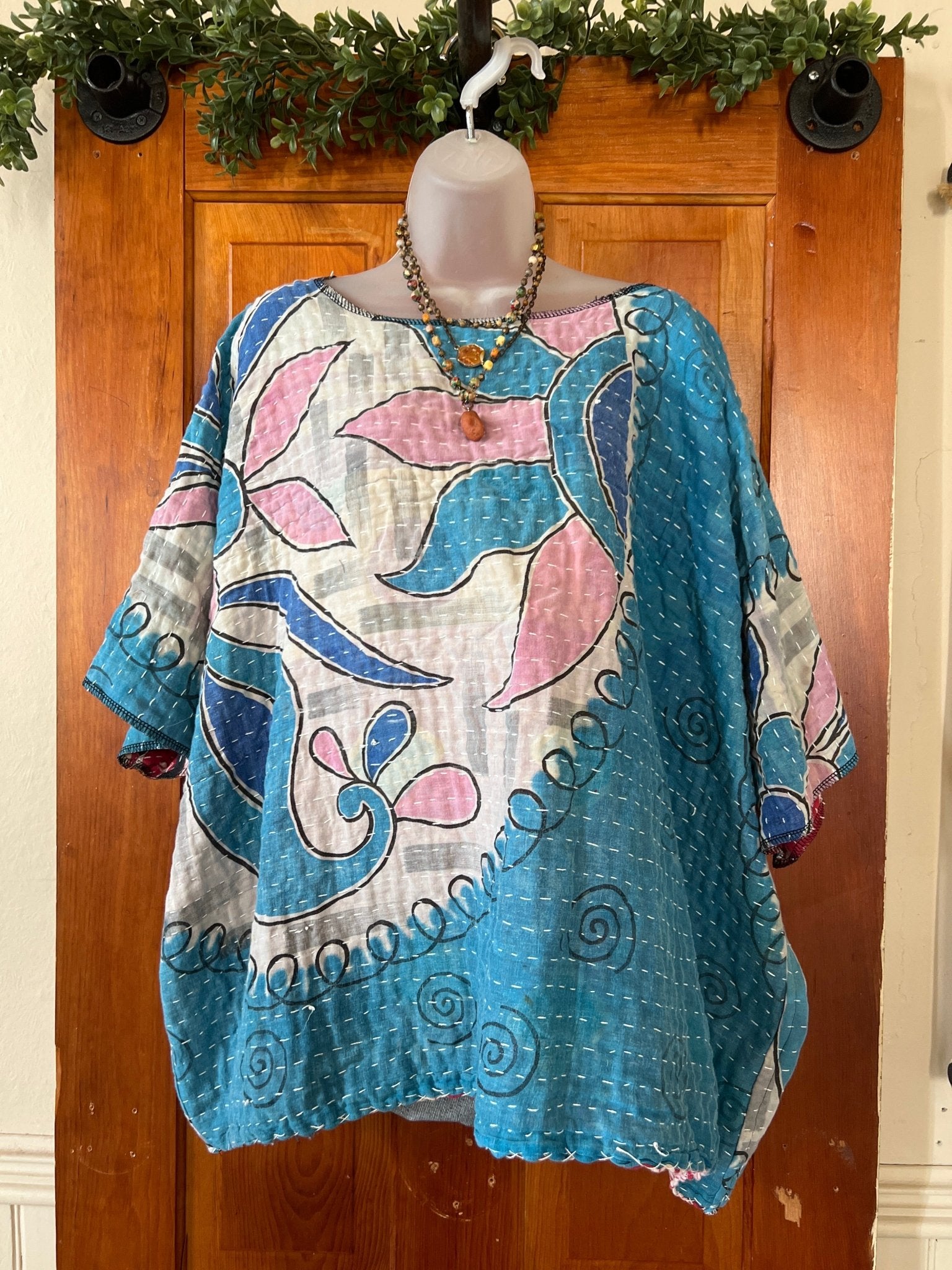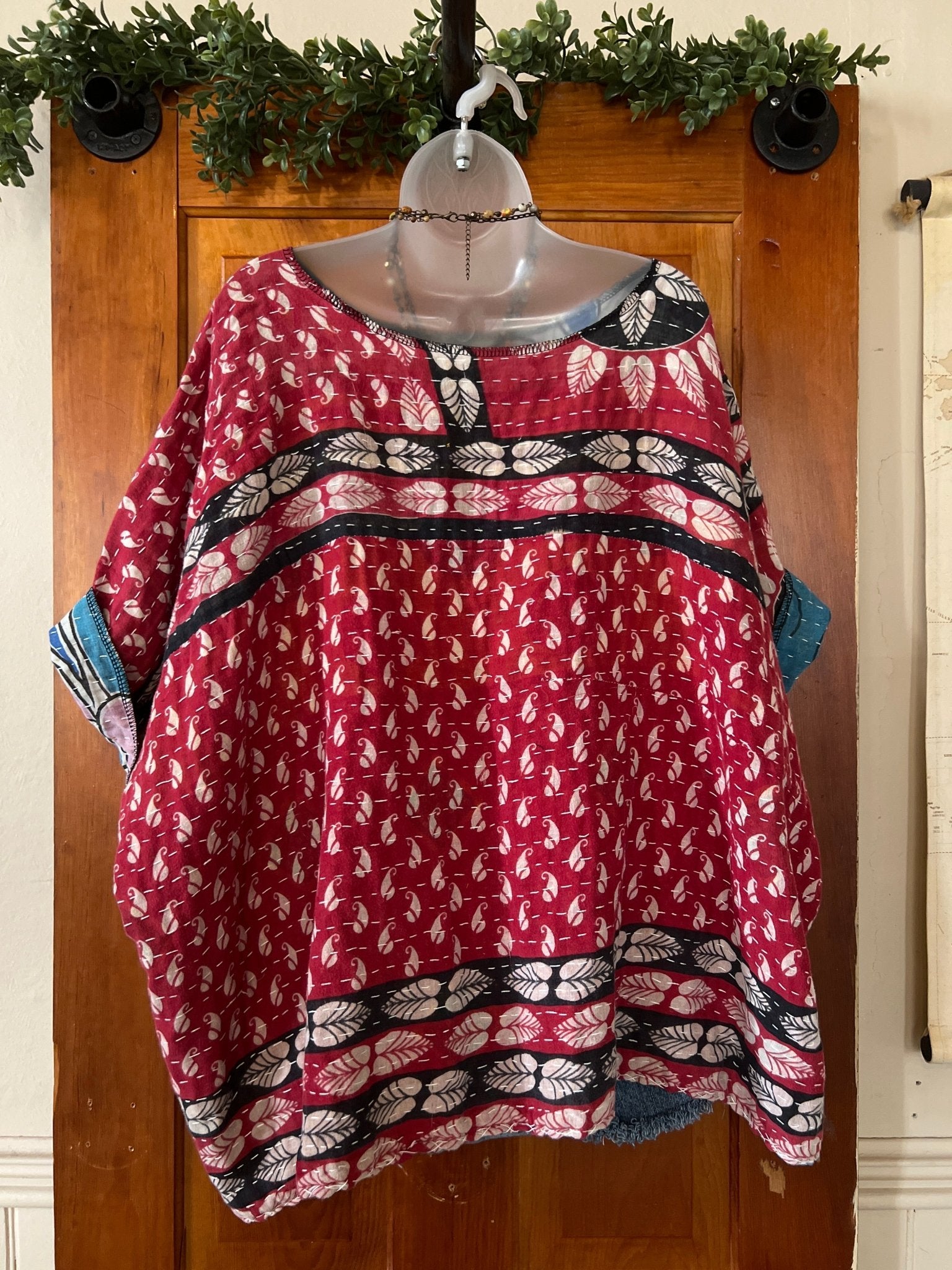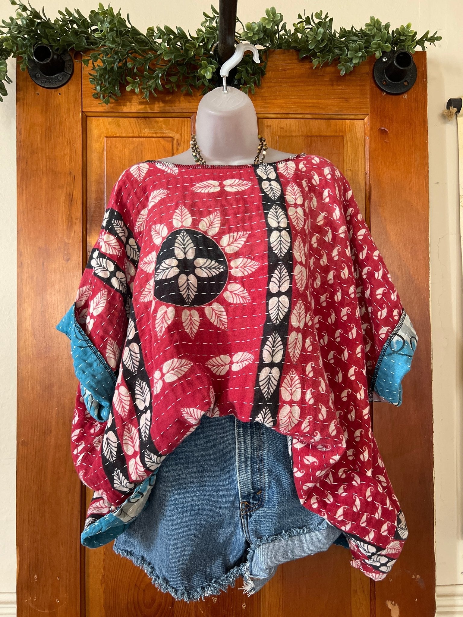 Get ready to LOVE this reversible kantha top-it's like TWO TOPS IN ONE!!! Perfect for pairing with cutoffs, jeans, linen pants and so many other possibilities-great for travel too-as it can be worn two entirely different ways! This eco-chic, planet-loving gem is crafted from upcycled Kantha quilts—talk about a one-of-a-kind treasure! The tag? There is no tag but we call it a free size (S-3X) with a wider neckline-but check the measurements!!! Just a friendly tip: peek at your fave oversized top measurements and compare them with the ones below!