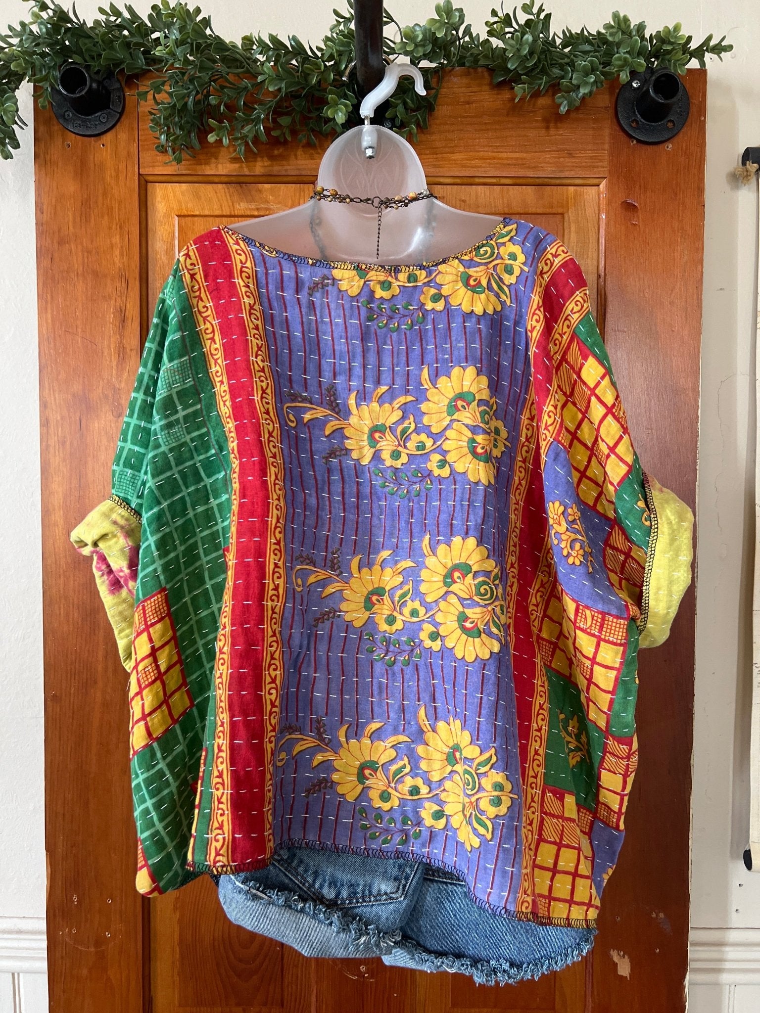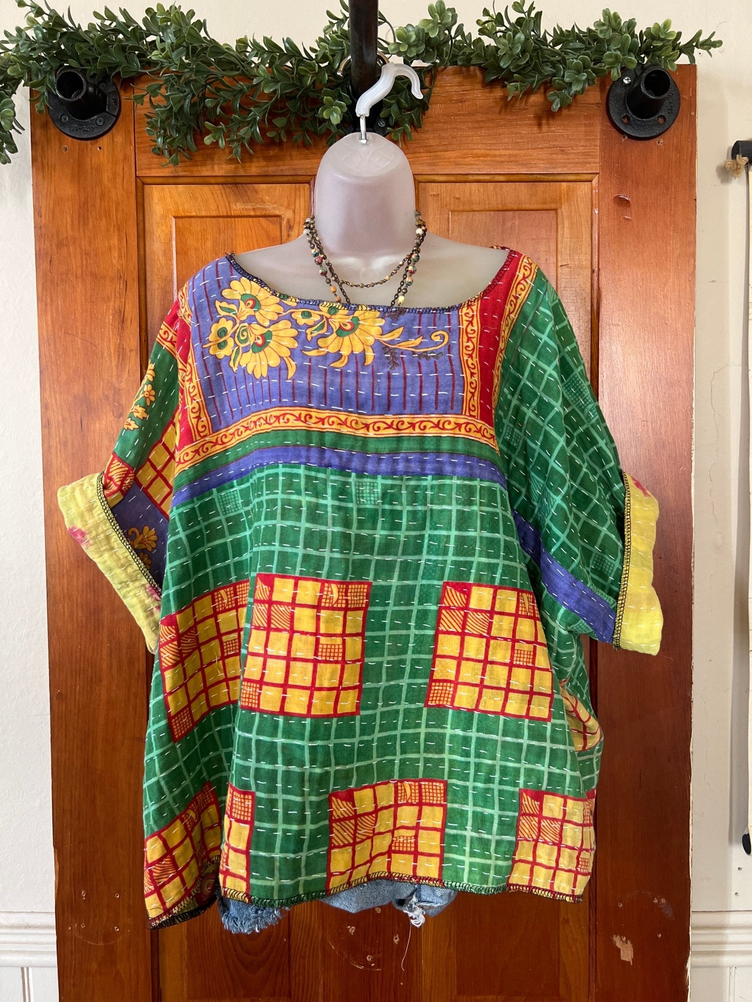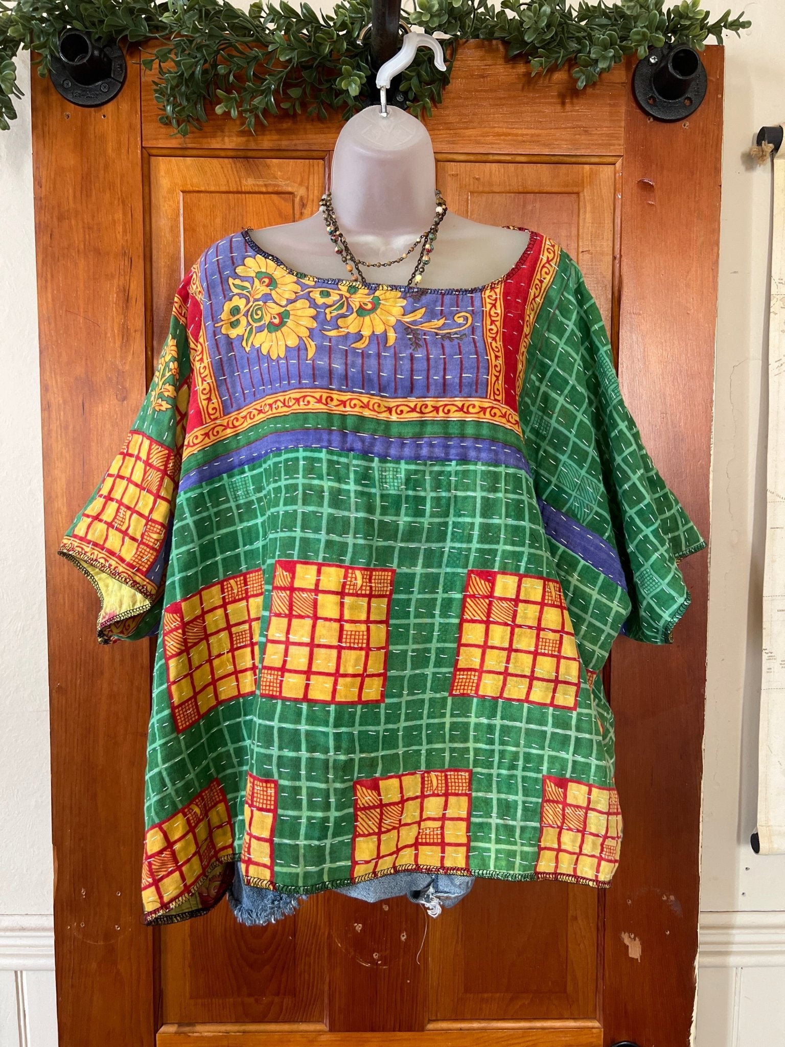 Get ready to LOVE this reversible kantha top-it's like TWO TOPS IN ONE!!! Perfect for pairing with cutoffs, jeans, linen pants and so many other possibilities-great for travel too-as it can be worn two entirely different ways! This eco-chic, planet-loving gem is crafted from upcycled Kantha quilts—talk about a one-of-a-kind treasure! The tag? There is no tag but we call it a free size (S-4X) with a wider neckline-but check the measurements!!! Just a friendly tip: peek at your fave oversized top measurements and compare them with the ones below!