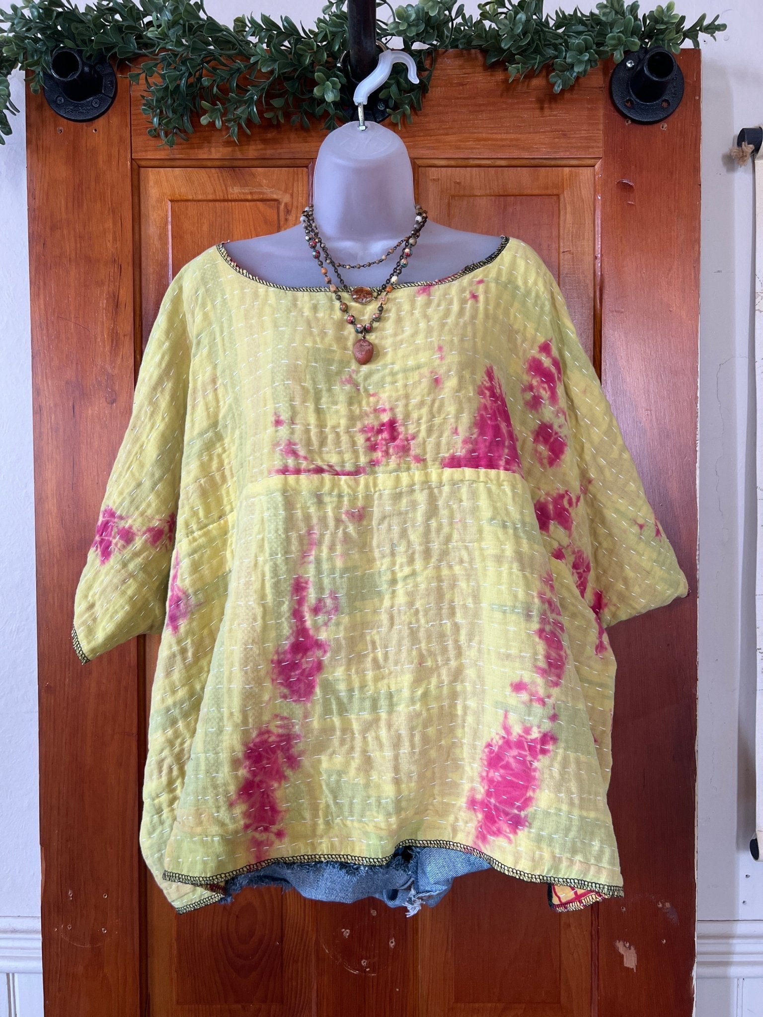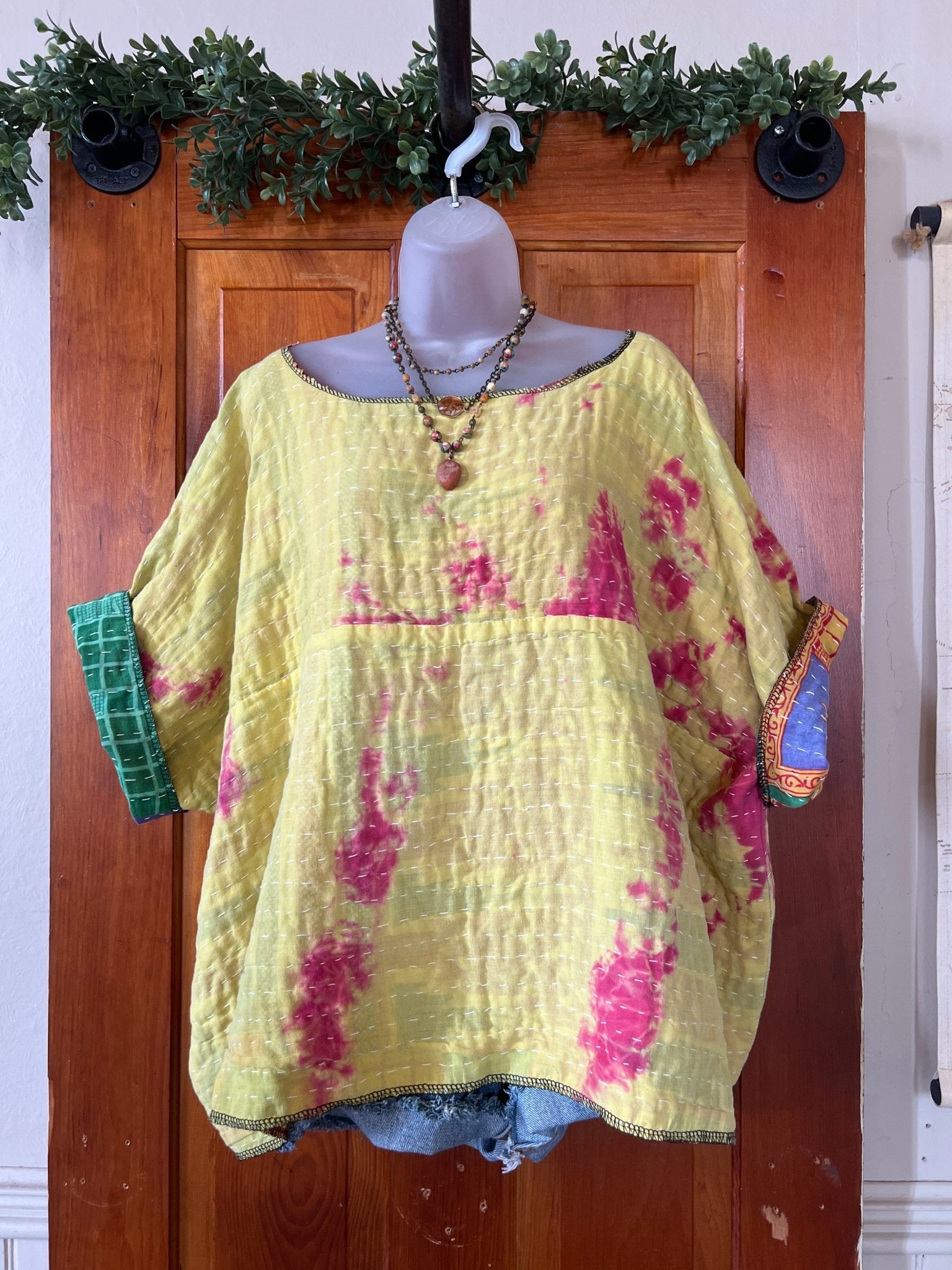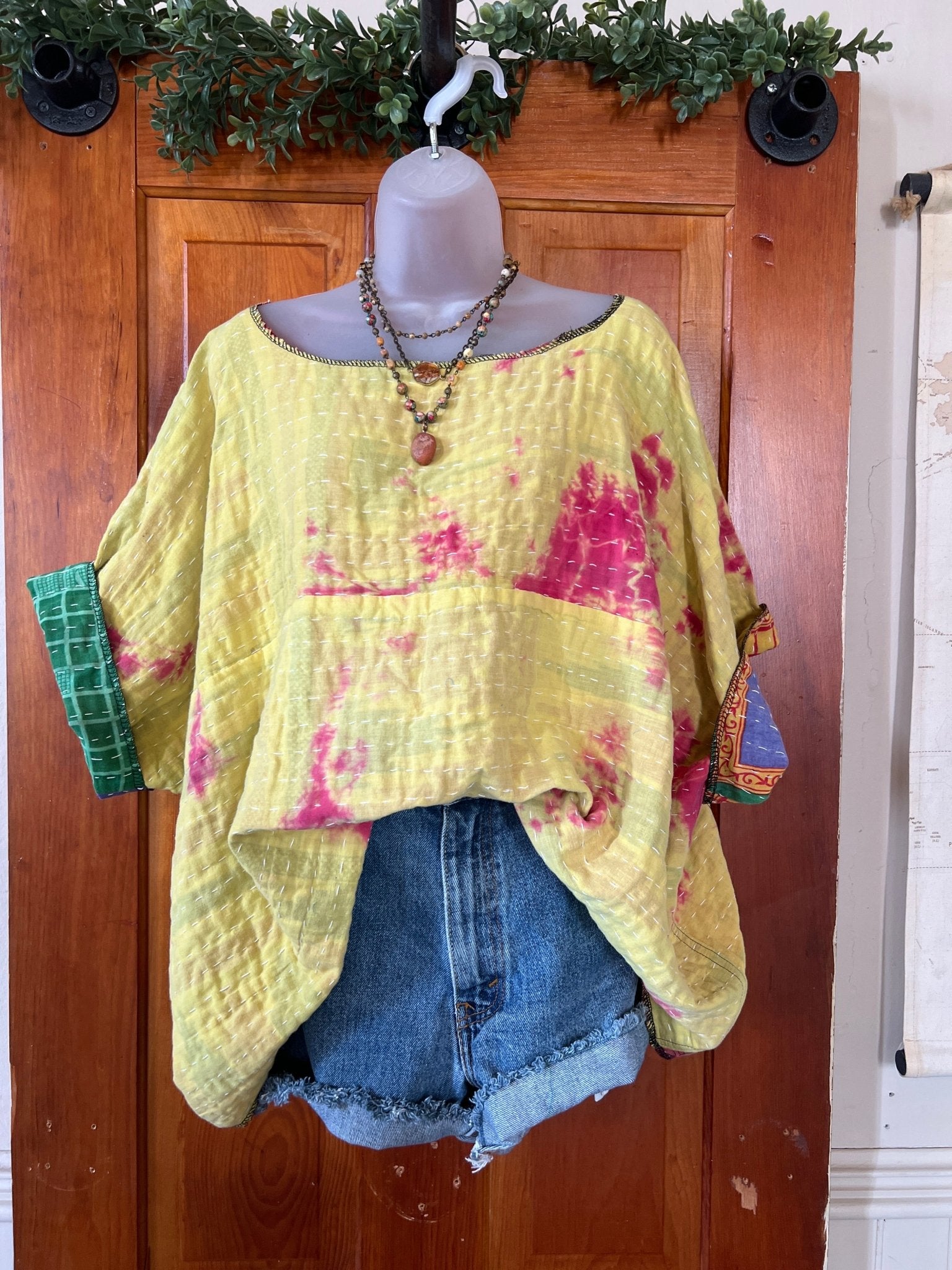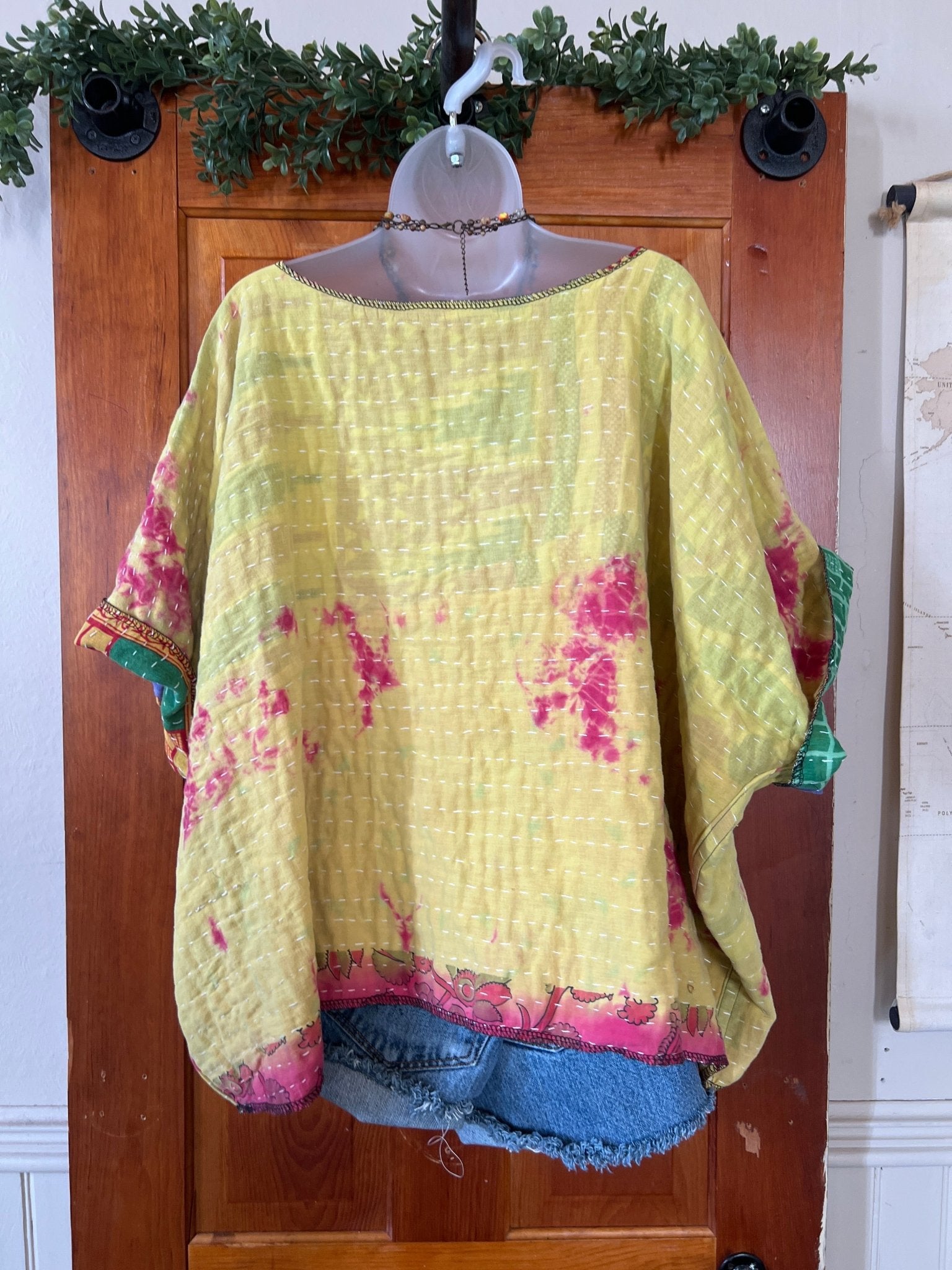 Get ready to LOVE this reversible kantha top-it's like TWO TOPS IN ONE!!! Perfect for pairing with cutoffs, jeans, linen pants and so many other possibilities-great for travel too-as it can be worn two entirely different ways! This eco-chic, planet-loving gem is crafted from upcycled Kantha quilts—talk about a one-of-a-kind treasure! The tag? There is no tag but we call it a free size (S-4X) with a wider neckline-but check the measurements!!! Just a friendly tip: peek at your fave oversized top measurements and compare them with the ones below!