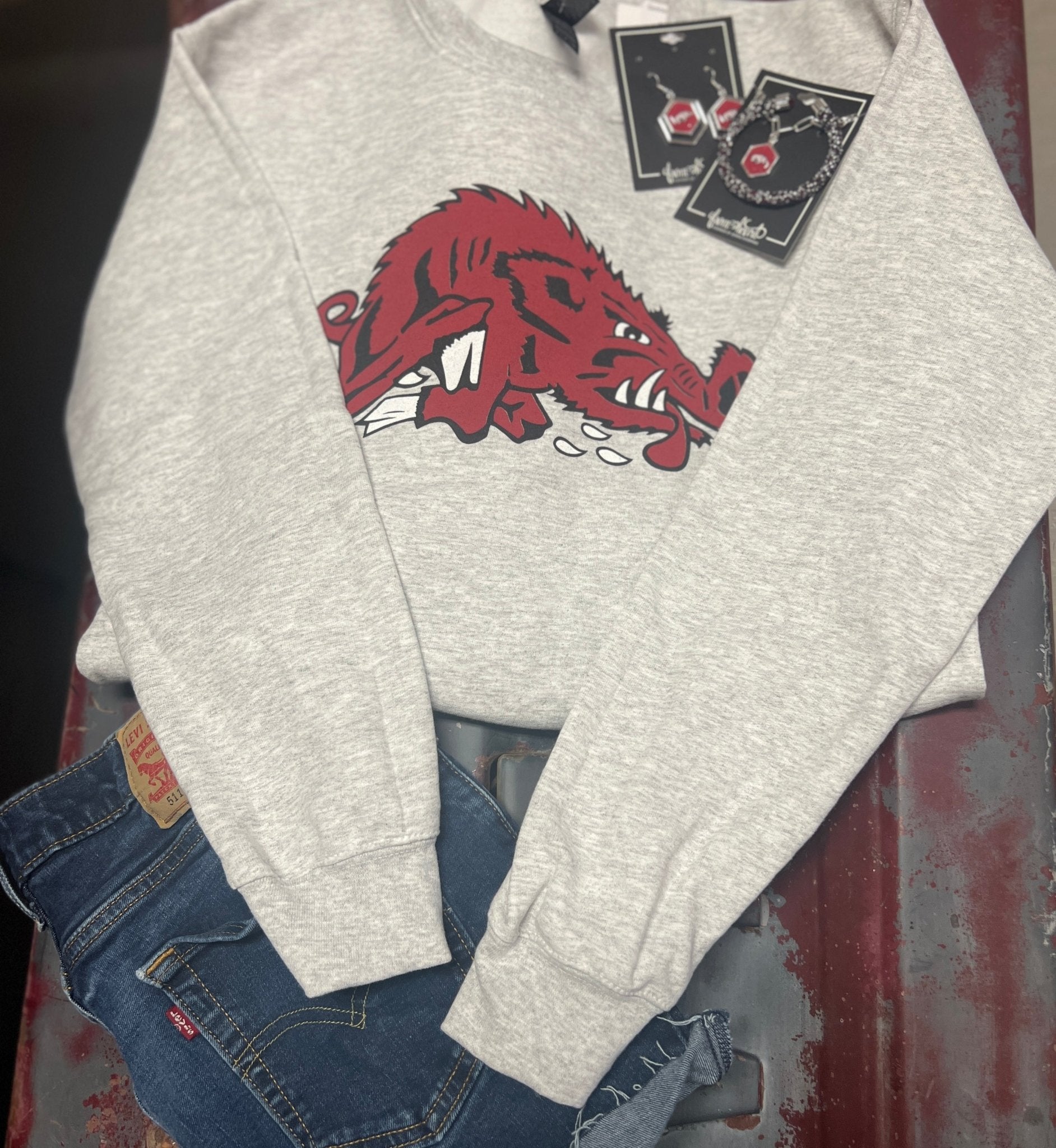 Get cozy with the Slobbering Hog Sweatshirt, featuring a playful vintage hog logo in classic gray. This sweatshirt combines comfort and character, perfect for adding a fun, retro vibe to your casual wardrobe. Ideal for those who love a touch of humor with their style.