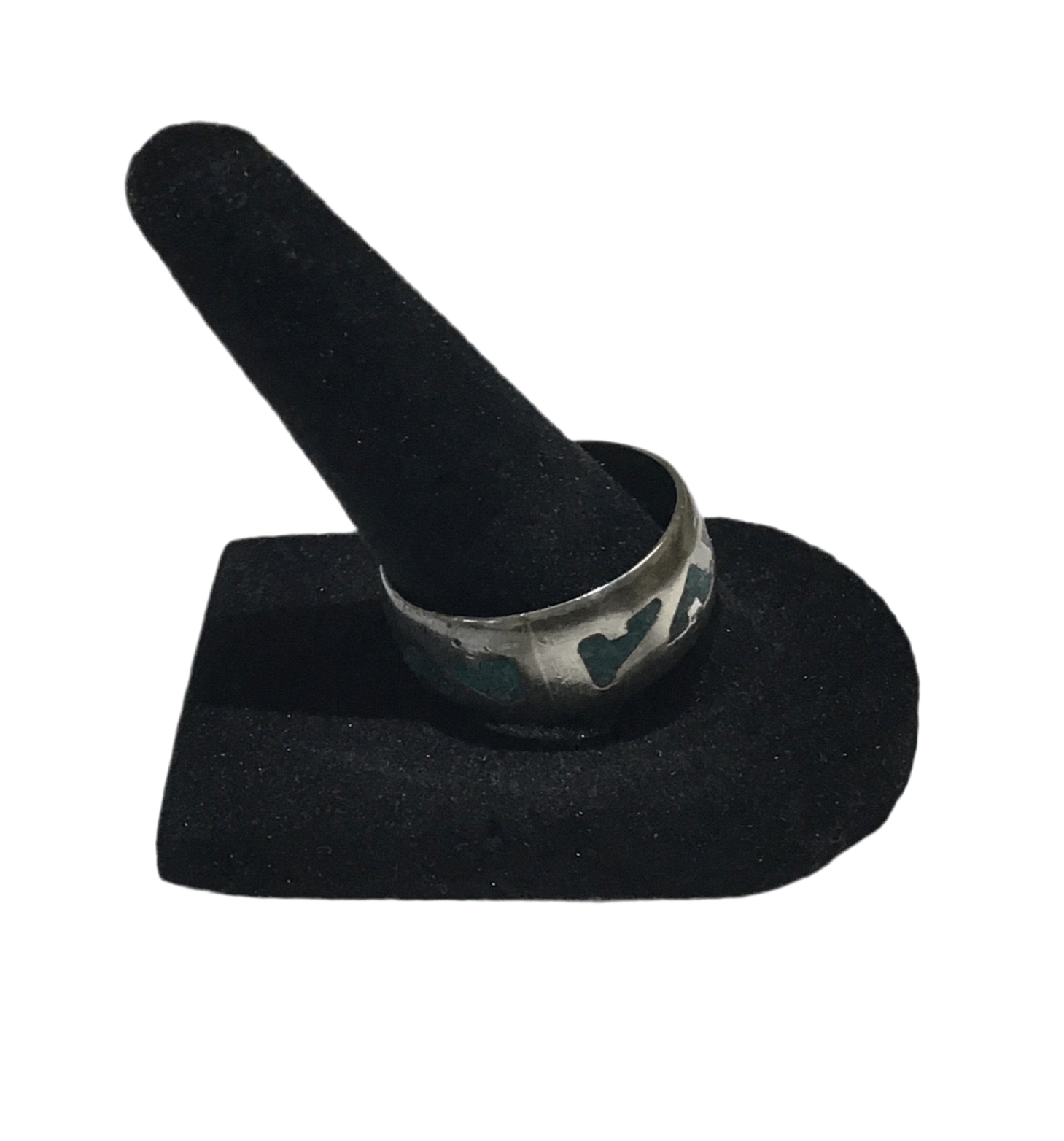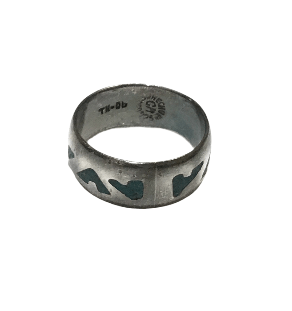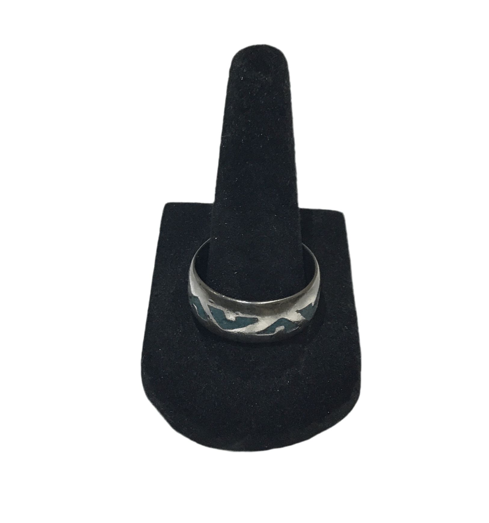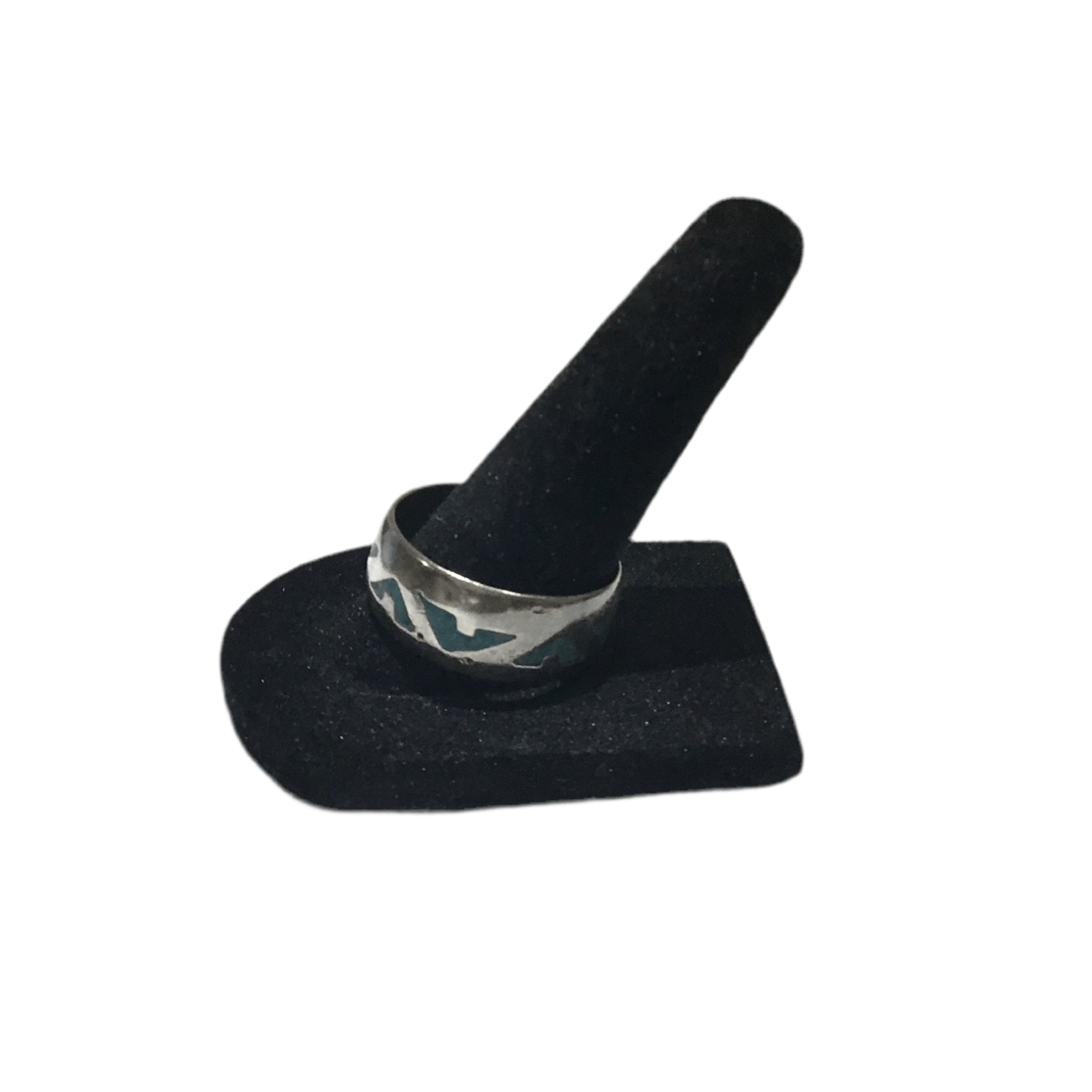 This bold vintage sterling silver band ring features turquoise chip inlay in a fluid, wave-like design across the wide band. The organic patterngives it a ntural SW feel, with the bright turquoise chips adding a vibrant contract against the aged patina of the silver. A timeless piece of mid-century Native american style jewelry, perfect for everyday wear or as part of a layered boho look.