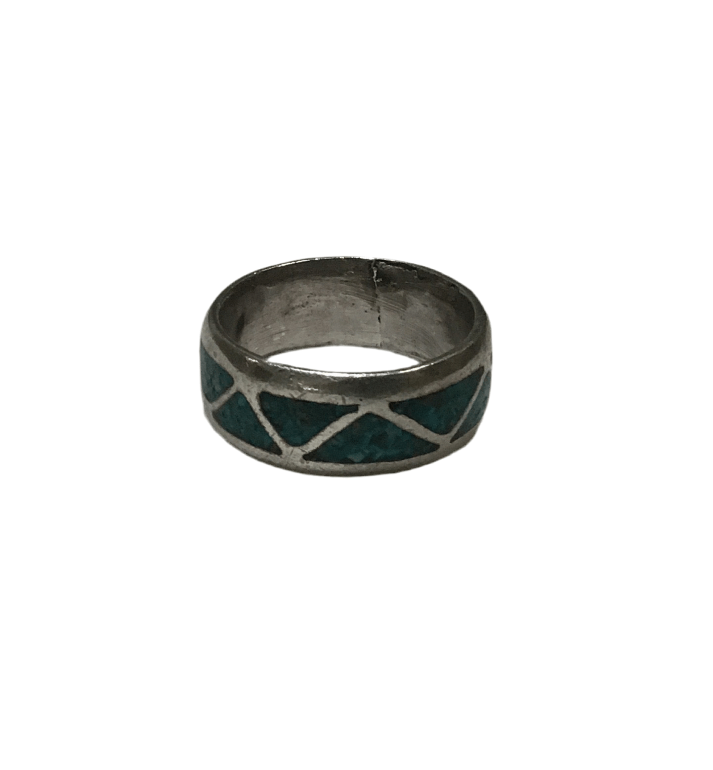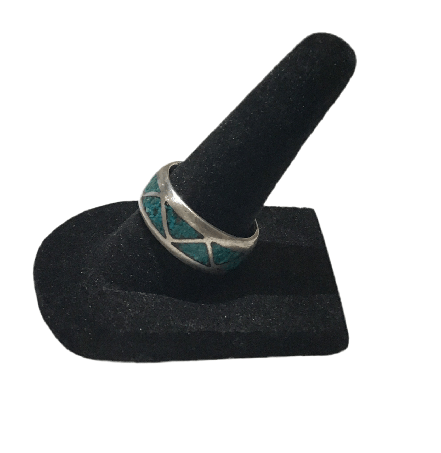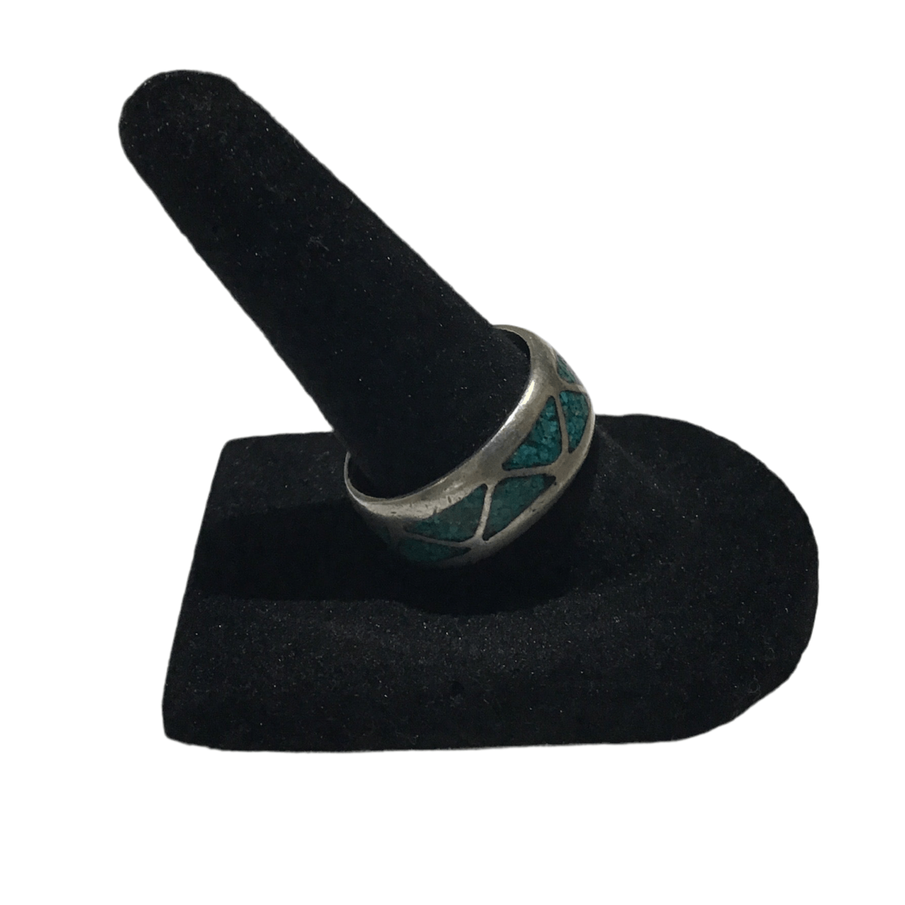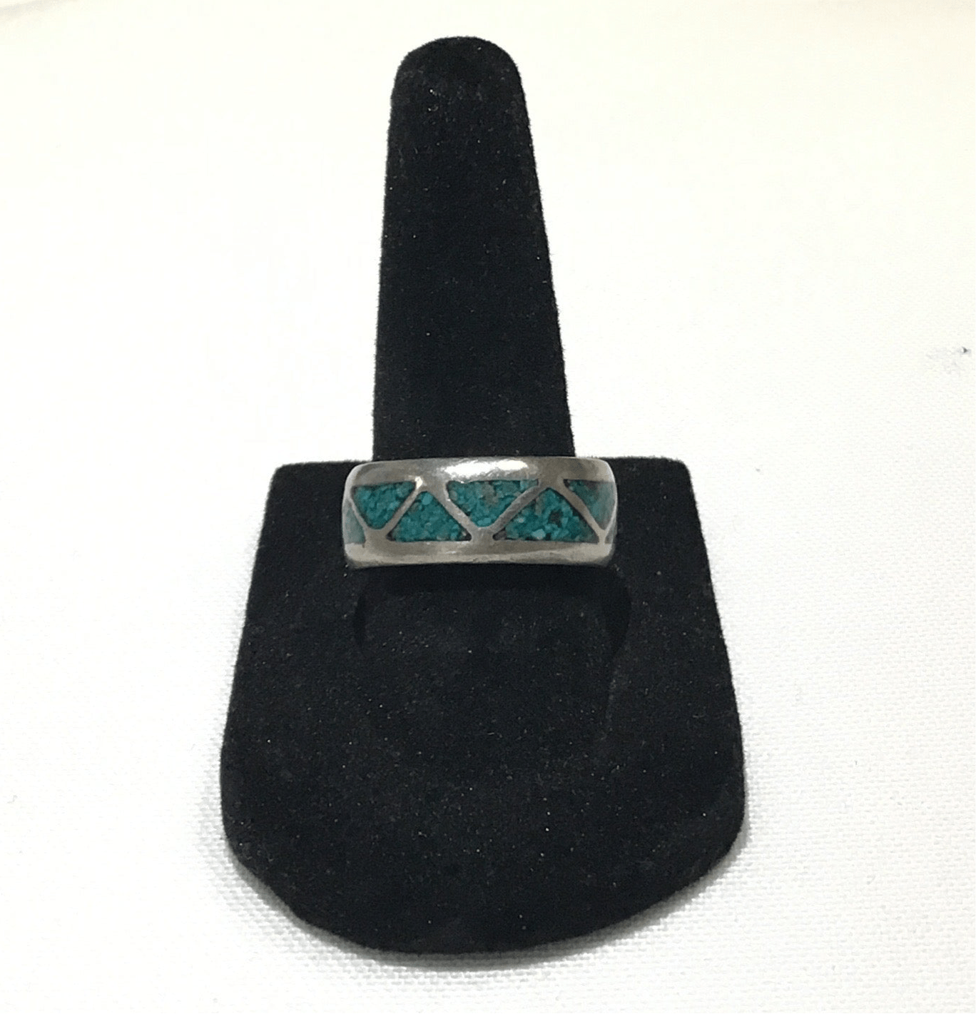This vintage sterling silver band ring showcases a bold southwestern design with turquoise chip inlya set in a geometric mosaic pattern.  The side silver band makes a statement while the natural turquoise brings in traditional color and character.  A classic piece of mid-center Southwestern jewelry, perfect for everyday wear or as part of a layered boho look.