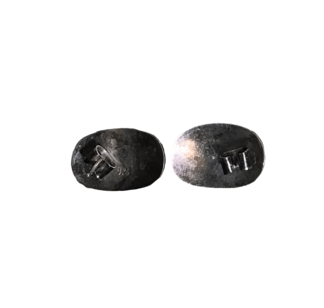 These bold vintage earrings are crafted from sterling silver (stamped 925) and feature an engraved Aztec/Mayan - inspired bird motif in raised overlay. The oval shield shape is accented with a detailed textured background, fivign the design depth and character. Lightweight yet striking, they carry the strong influence of mid-century Mexican silver artistry.