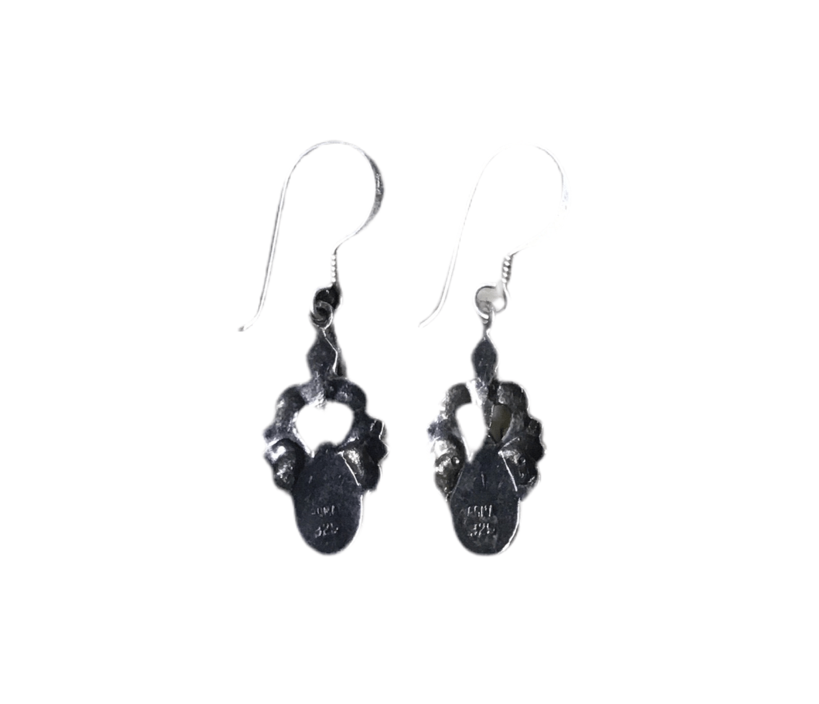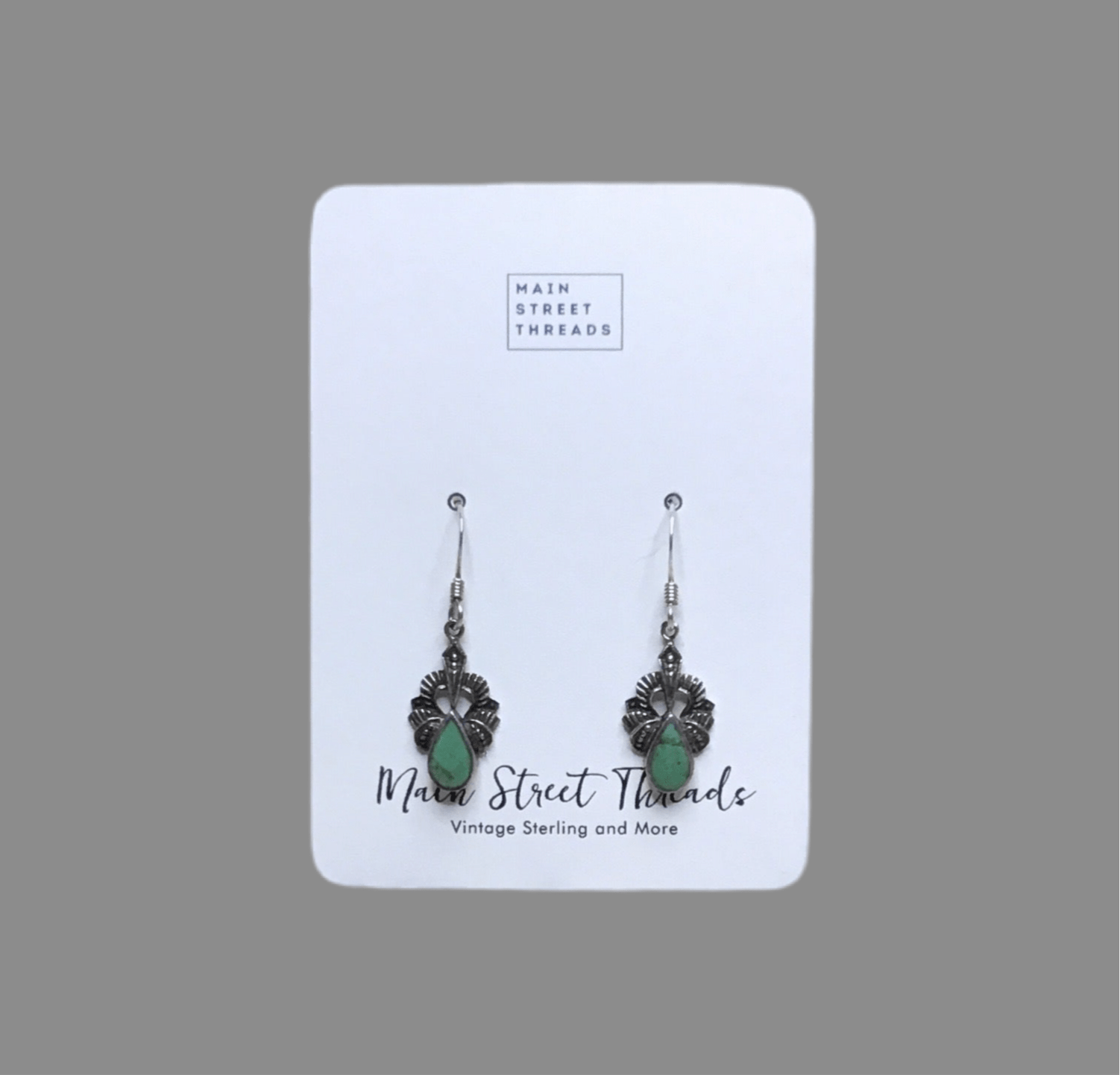 These artisan earrings feature genuine turquoise cabachons set in handcrafted sterling silver. The teardrop turquoise stones display natural matrix and character, framed with detailed silverwork that gives them a floral, vintage feel. Stamped 925 MEXICO on the back, these earrings reflect the craftsmanship of tranditional Mexican silversmiths.
