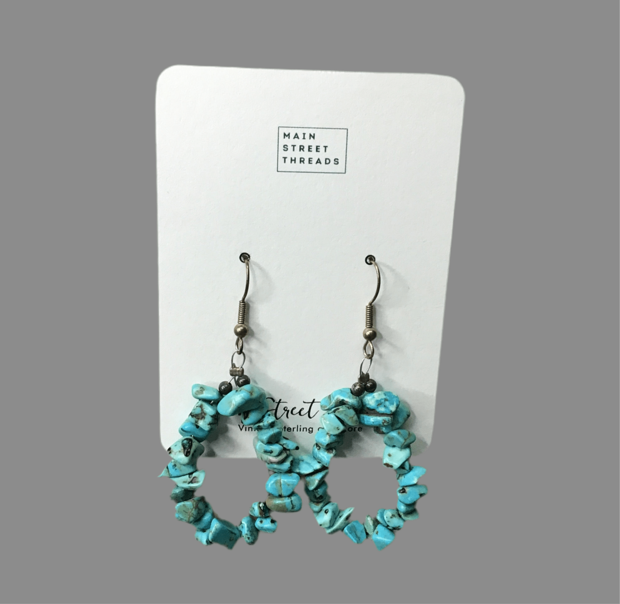 These playful hoop-style earrigs are strung with genuine turquoise chip beads, displaing a natural mix of blues and greens with unique matrix patterns. The hoops are accented with sterling silver findings for a comfortable dangle. Natural patina on some stones!