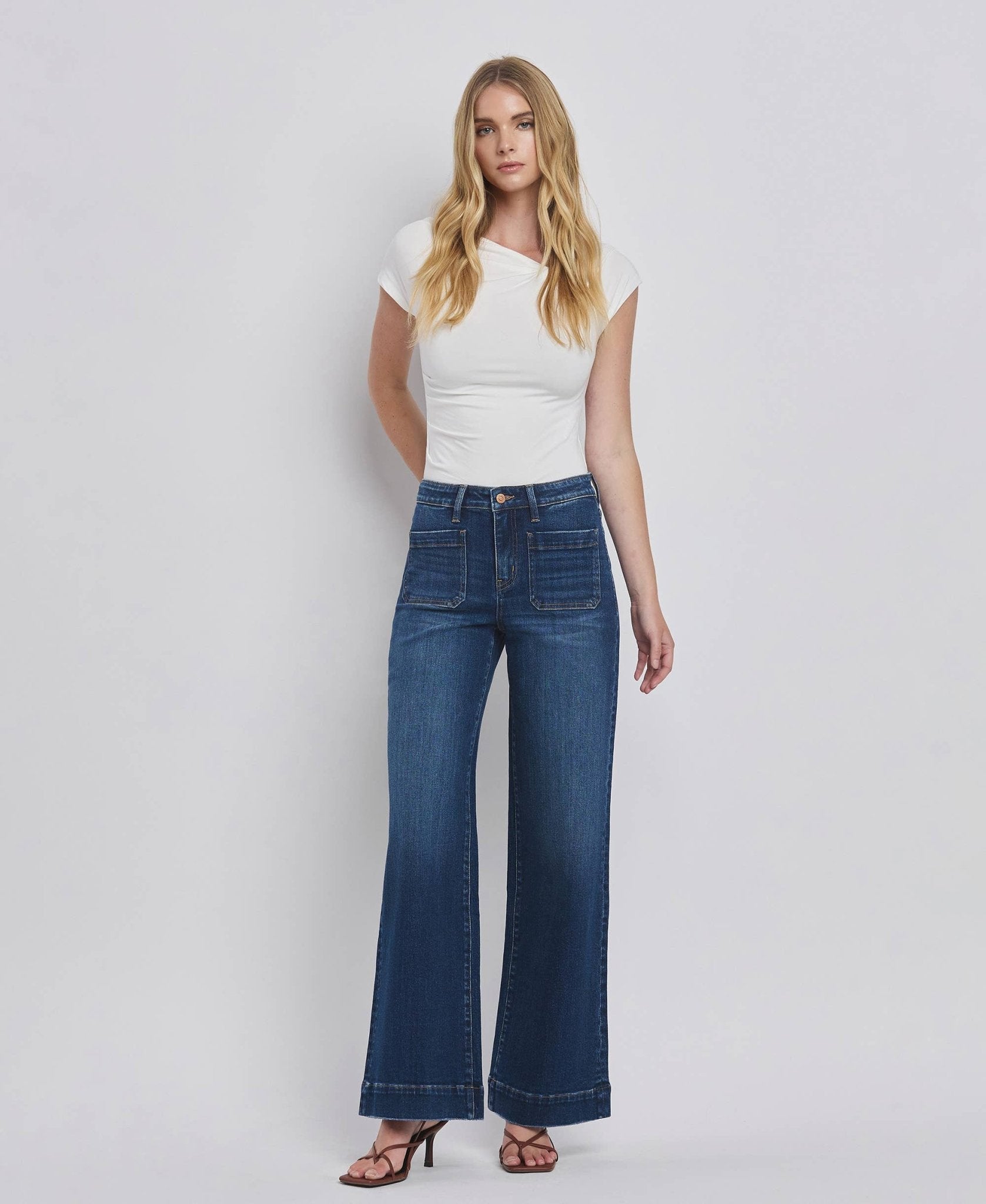 HIGH RISE WIDE TROUSER JEANS COMFORT STRETCH DENIM, HIGH RISE WAIST, PATCHED POCKET DETAIL, FULL LENGTH, WIDE TROUSER JEANS F. RISE: 10" / INSEAM: 32" / LEG OPENING: 22" MODEL IS 5'10" WEARING A SIZE 26