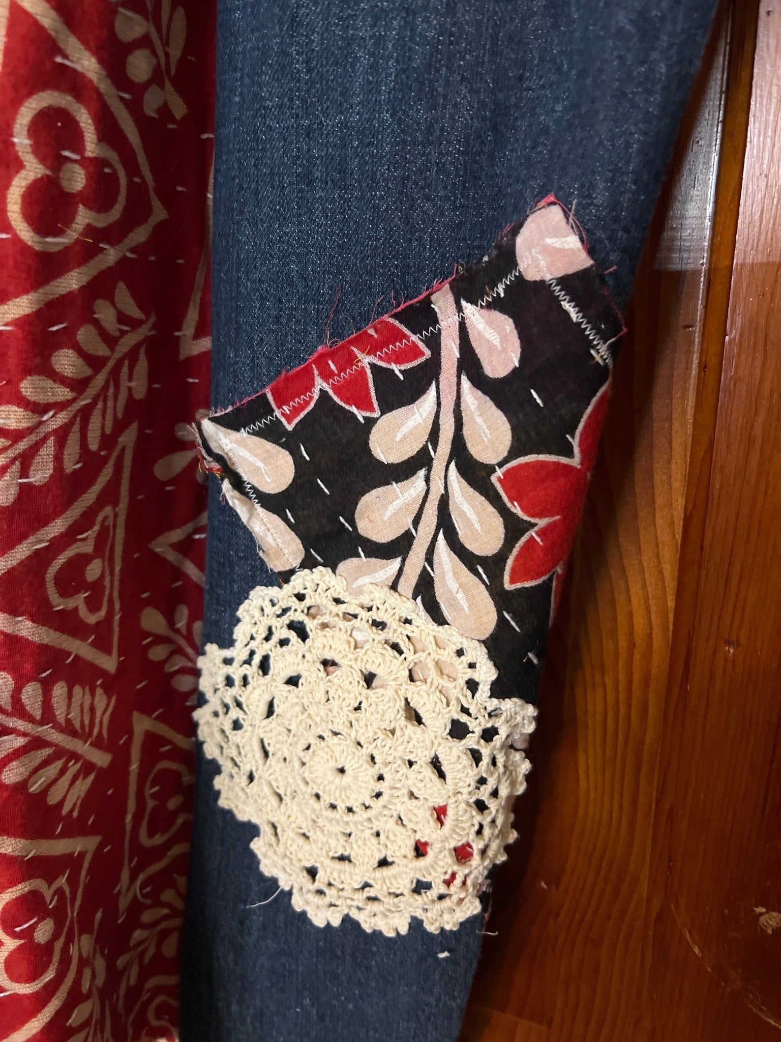 Upcycled Levi’s with panels & patches in Razorback Red/OU